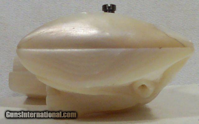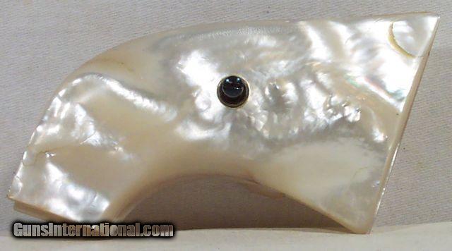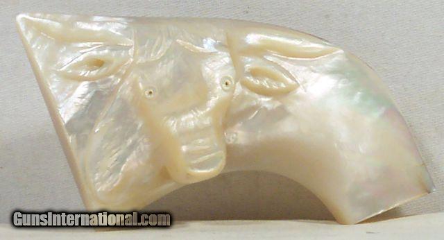 Description: Colt Single Action Army Mother of Pearl Grips with carved steer head motif; BEAUTIFUL pair of grips with 1X mark on inside of both grips; nice thick grips with good color; plain side has professional repair on back corner of butt; antique, no FFL/C&R required for shipping; All items shipped fully insured Priority Mail- -Hand guns $30 --Long guns $45-- Spurs $30-- Knives, Swords & Sabers $30—Grips $20 (Texas residents please add 6.75% sales tax); return policy: three days inspection from the date the item is received; full refund of shipping both ways ONLY IF THE ITEM IS MISREPRESENTED. Note: International sales only as laws permit. Will ship C&R eligible items to C&R license. Antiques shipped without license to anyone EXCEPT New Jersey and City of New York where a FFL is required. SOLD |