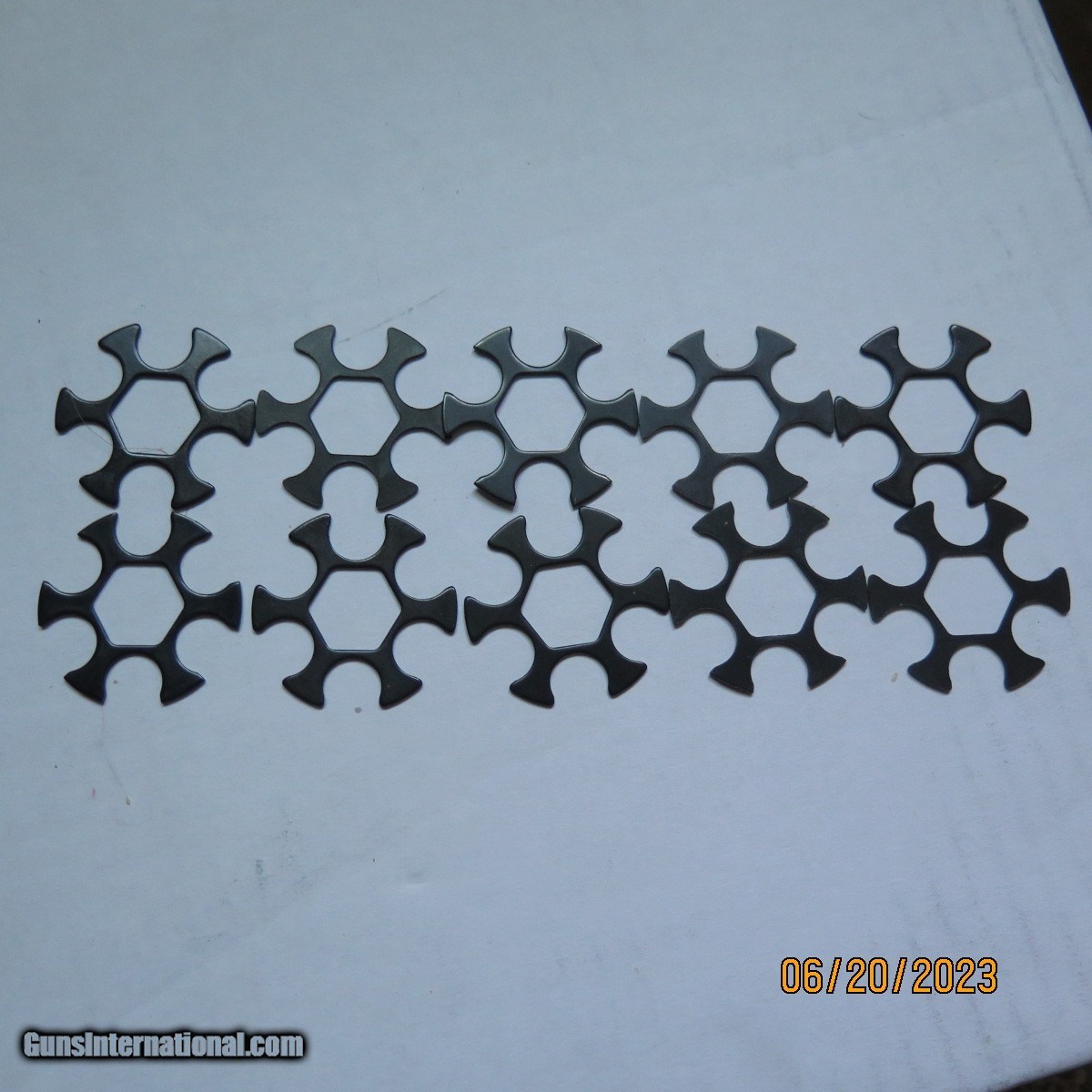 Description: A set of 10 blued, stainless steel Smith & Wesson .45 ACP 6-shot Revolver Moonclips. These are used but not damaged or bent at all. Fits S&W models 325, 625, 1917, NOT the GOVERNORs. Don't have any use for these moonclips now. Only 4 sets of 10 moonclips available. The listed price in my ad is final "out the door" cost to you which includes shipping. I accept personal checks (subject to bank clearance, 4 to 5 days) or money orders for payment. Shipping by USPS First Class mail. SOLD Handgun Caliber: .45 ACP (.45 Auto) |