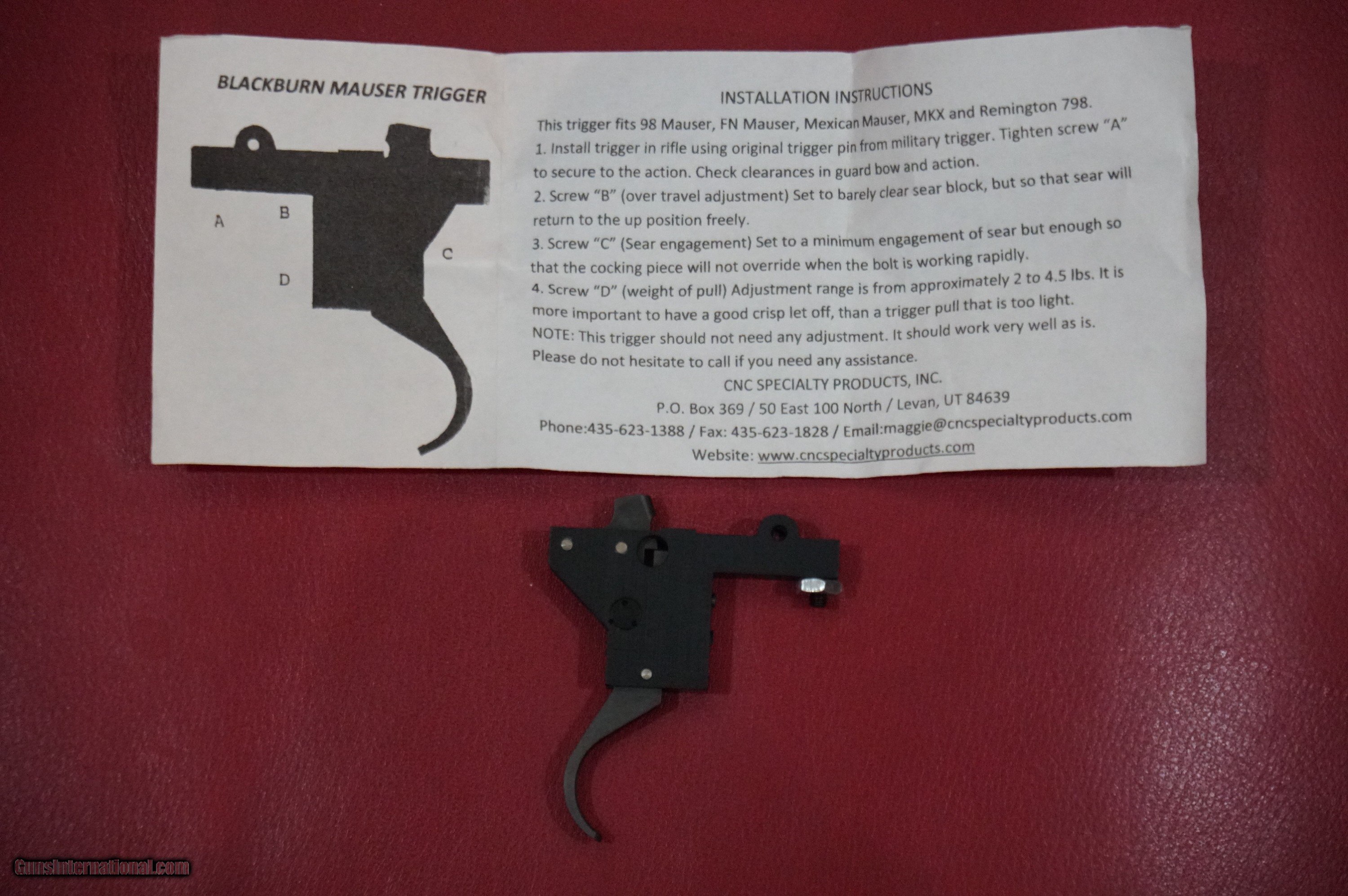 Description: Blackburn steel trigger for Mauser for sale. This trigger is New Old Stock; it has never been modified, mounted or used. It is in the original bag with instructions. Currently selling for about $135. Why pay more? Shipping is $10 within the CONUS. SOLD |