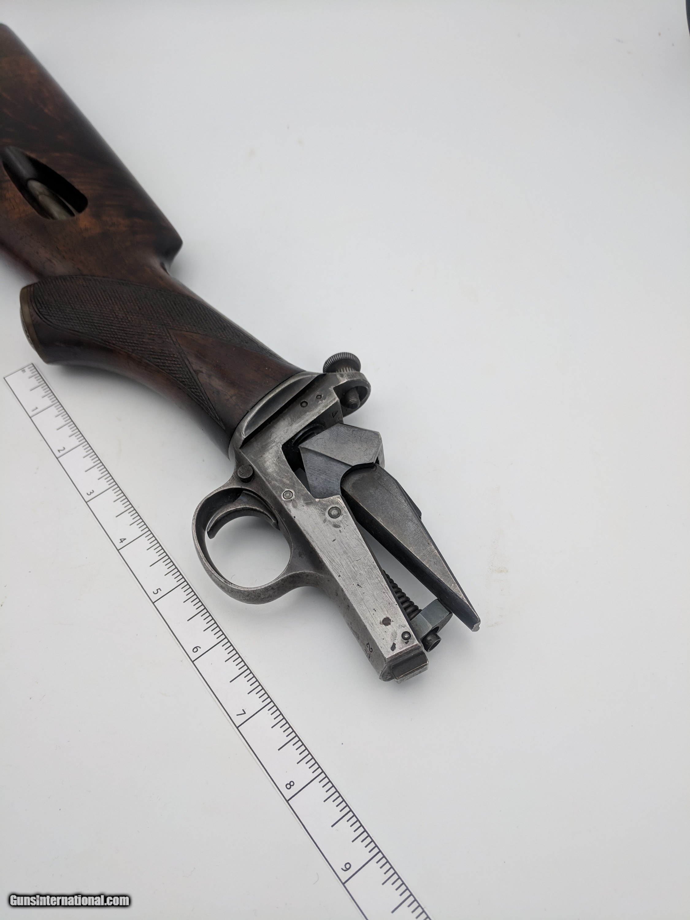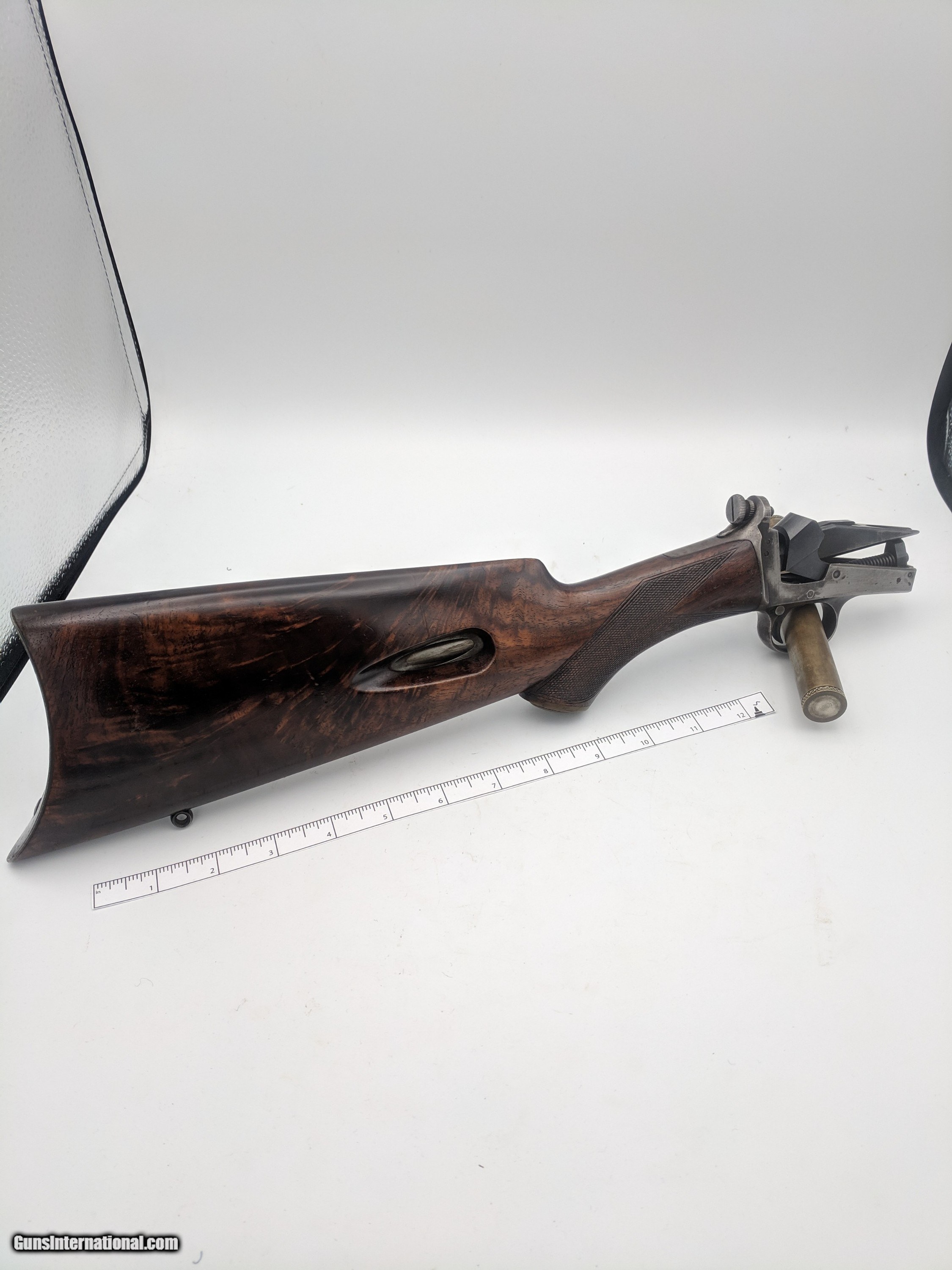Description: Hello, For sale is the back half of a early 1903 Winchester 22 Auto Rifle. This is the Deluxe model, with a checkered highly figured walnut pistol grip stock. The original buttplate, inner and outer magazine tubes, triggerguard, trigger, hammer and associated parts are all included. Front half of the rifle went missing. The wood is in excellent condition and has beautiful color and figuring to the grain. The metal parts function perfectly and have that very attractive aged patina. Serial number is 274XX and dates to a 1905 Manufature Year. Dont let this one slip away! SOLD |