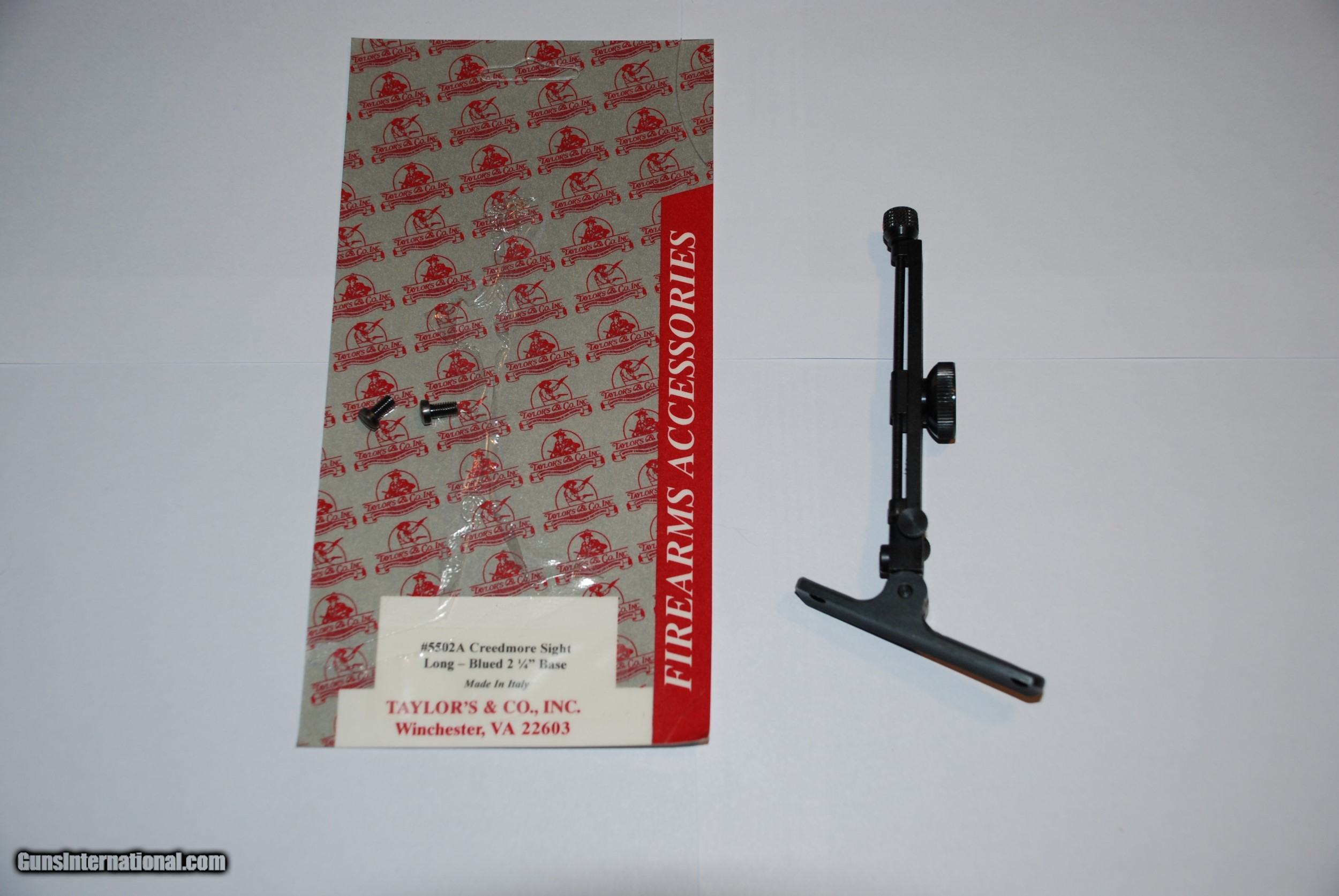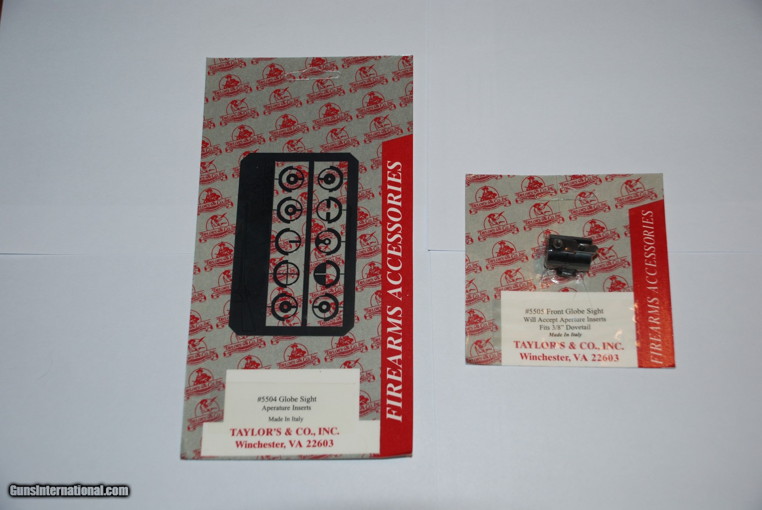 Description: Italian made Creedmore Sight set, from Taylor's & Co, Inc., Winchester, VA, including #5502A Creedmore rear peep sight, long (range), blued, with 2-1/4" base and 2 mounting screws; #5505 Front Globe Sight with changeable aperture inserts; and #5504 Globe Sight Aperture Inserts (10) fitting the front globe sight. The globe sight and globe sight inserts are unopened, in their original packaging. The rear sight was removed from its package for examination, but was not used. Sold as a set, only. SOLD |