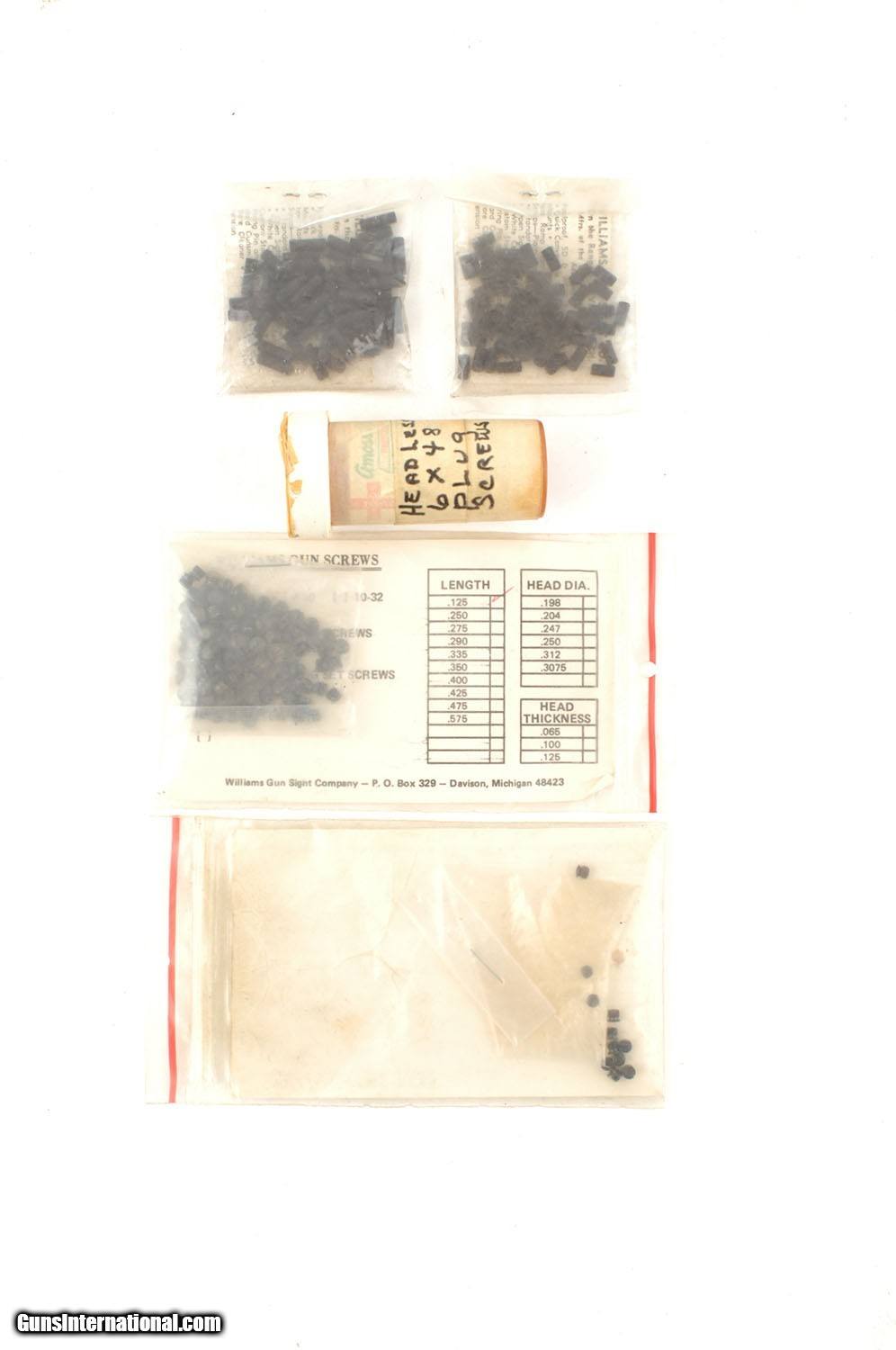Description: Williams Plug Screws Used to fill drilled & tapped holes, etc... New Old Stock 111 - 8 x 40, .125" long 53 - 6 x 48, .275" long 52 - 6 x 48, .400" long 11 - 6 x 48, .125" long 68 - 6 x 48, about .125" long (in bottle) Counts are approximate, might be off a couple either way. FREE SHIPPING EXCELLENT CONDITION PAYMENT BY CHECK OR MONEY ORDER ONLY ON NON GUN ITEMS PLEASE EMAIL INQUIRY ONLY ON NON GUN ITEMS SOLD |