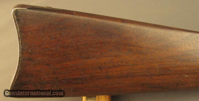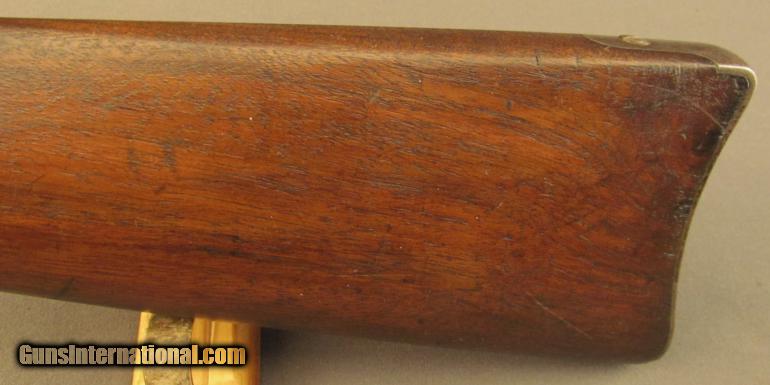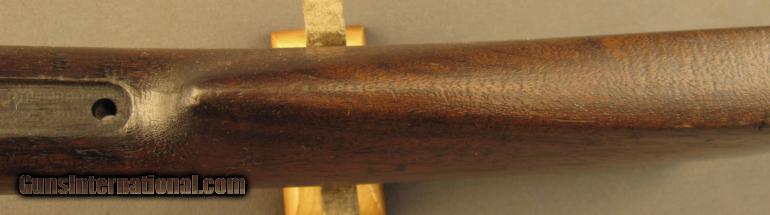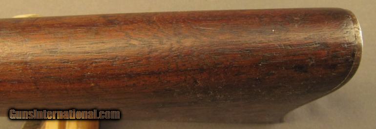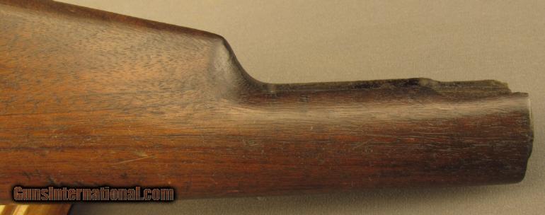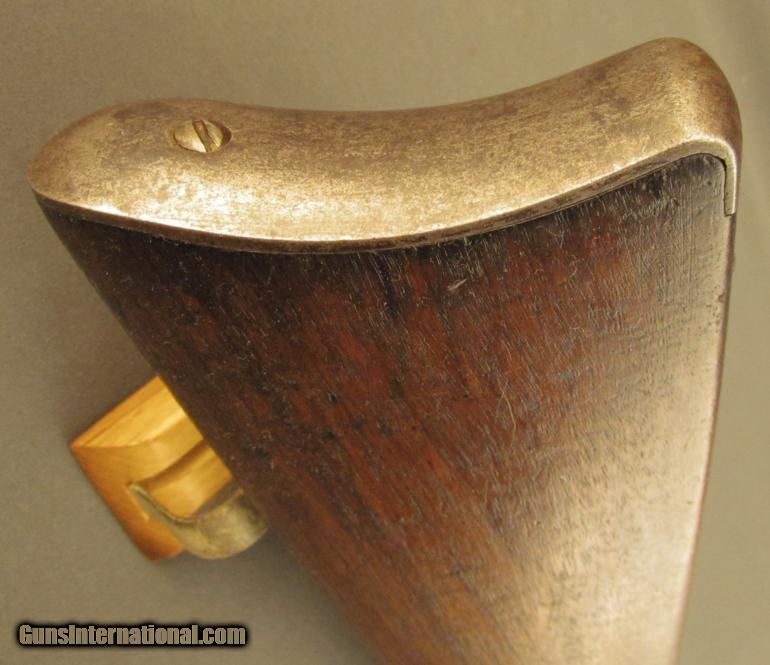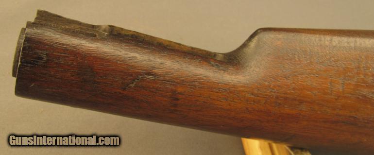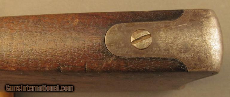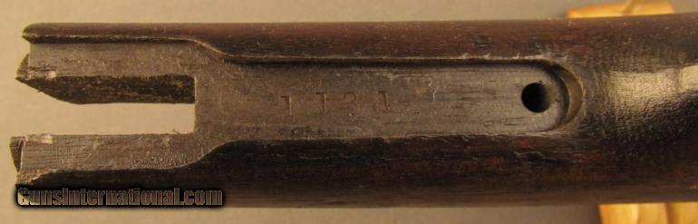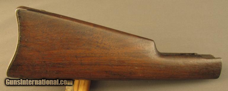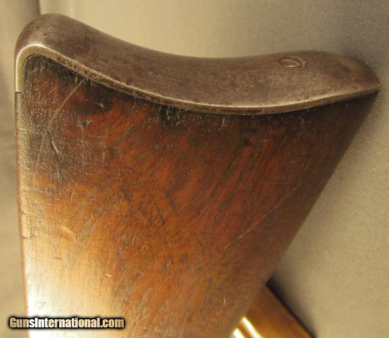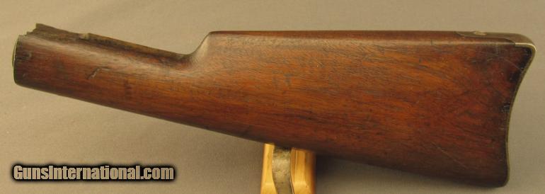 Description: This carbine buttstock comes with original buttplate and screws already mounted. The steel buttplateis grey with some dark staining screws have been redressed with a course file. The wood is in excellent condition with marks from use and a small (1/4 inch) clip behind receiver on left side. Upper tang slot is stamped 1131 and wood shows a little added oil. A very hard to find 76 carbine butt with plate. SOLD Manufacturer: Winchester Model: 1876 |