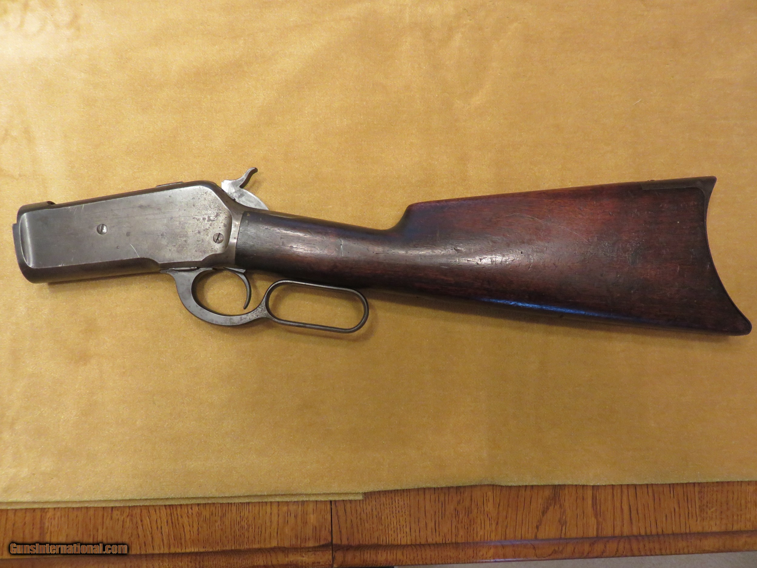 Description: Winchester 1886 stock and receiver to a takedown rifle, #76XXX, gray patina metal finish, original wood varnish, the wood is above the metal, all the receiver parts are intact, just missing the takedown barel and magazine. SOLD |