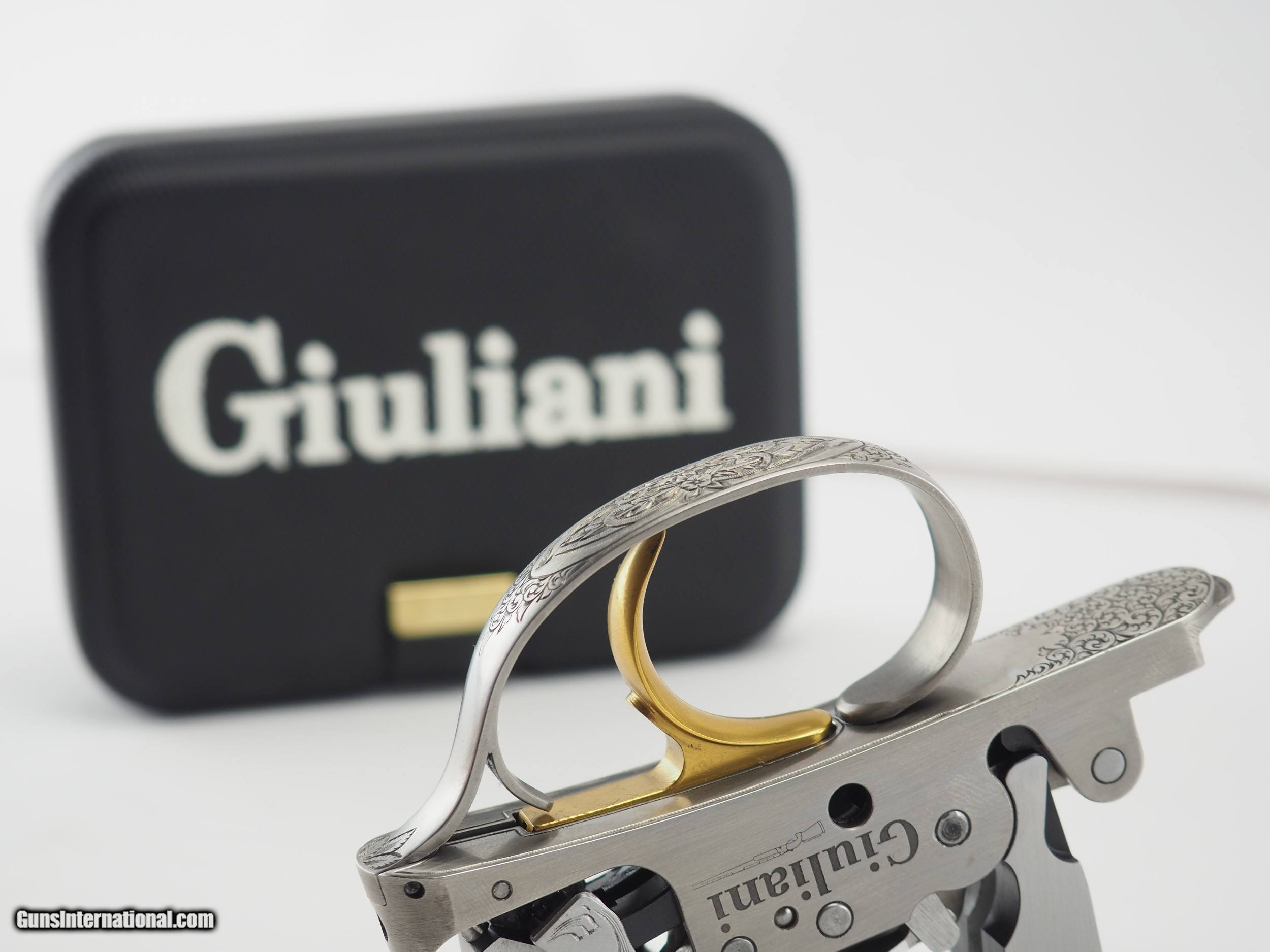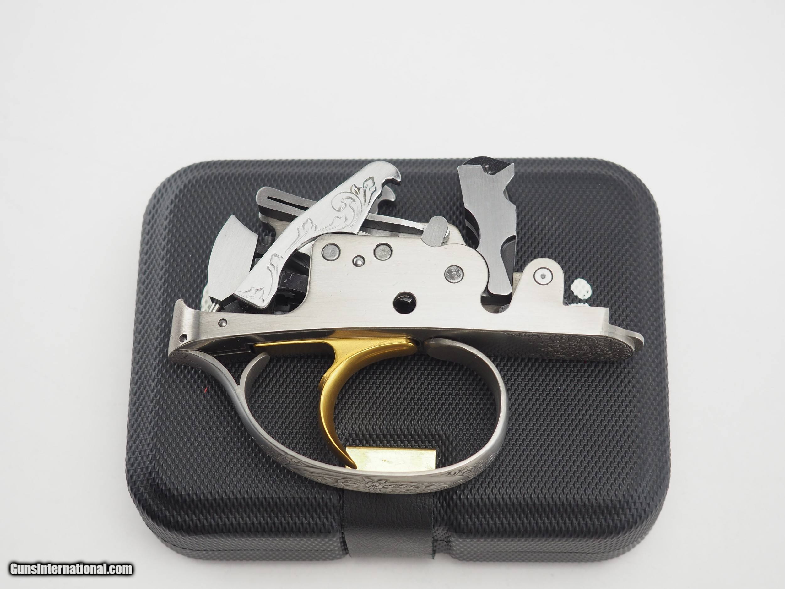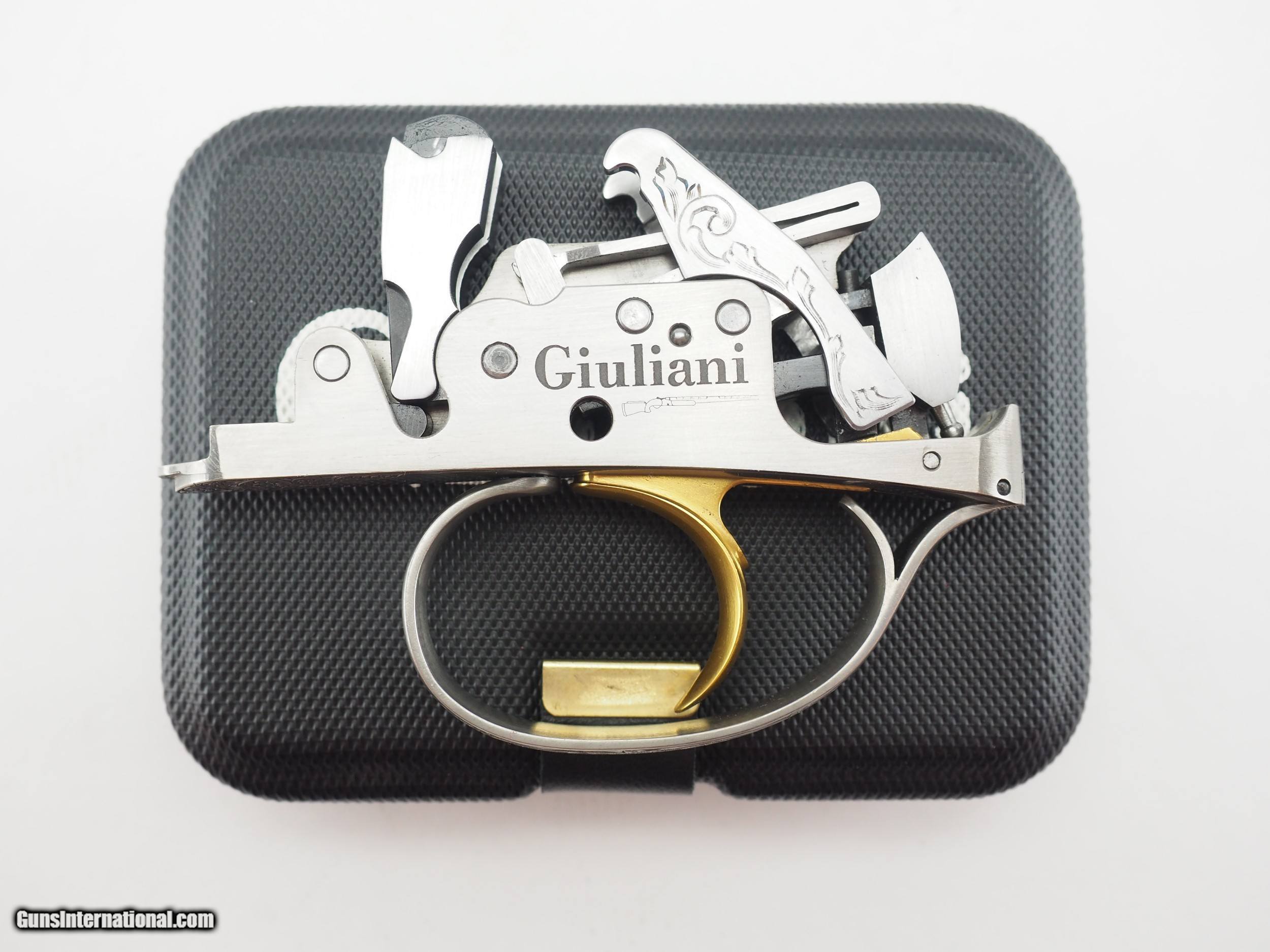 Description: See our home site for pricing and/or to place an order. Giuliani double release trigger unit with beautiful engraving, in old silver finish (French gray). Made by Giuliani in Italy, these trigger units are equal in quality to a Perazzi trigger unit but at a fraction of the price—and yes, the springs are every bit as good, if not better! If we don't have a particular trigger configuration in stock, let us know and we will order it for you. Note: due to manufacturing variances of MX guns made over decades, some fitting may be required at customer's expense for proper interface of trigger unit to gun. Color of case may vary. Please call us at 828-693-3833 with any questions. SOLD |