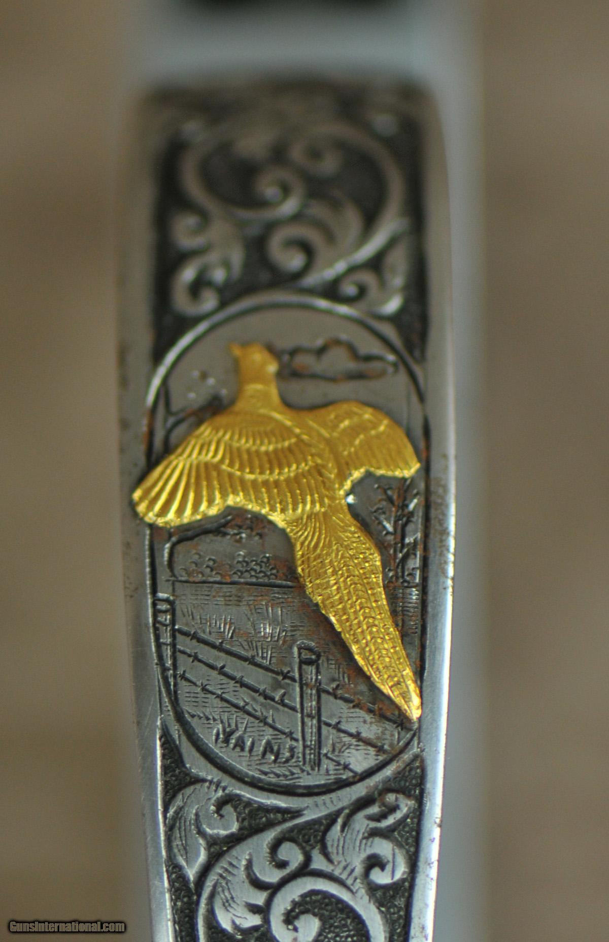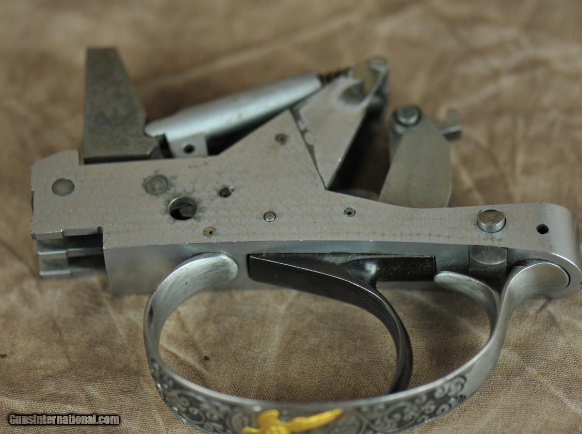 Description: Rotweill Trigger Group, coin finished with gold game scene engraved by the late Bill Mains. This trigger may require fitting, it is sold as is, no returns. THIS ITEM IS FEATURED AT OUR NEW MICHIGAN LOCATION (Toll-Free: 1-888-472-0056 or (248)-960-7262) SOLD |