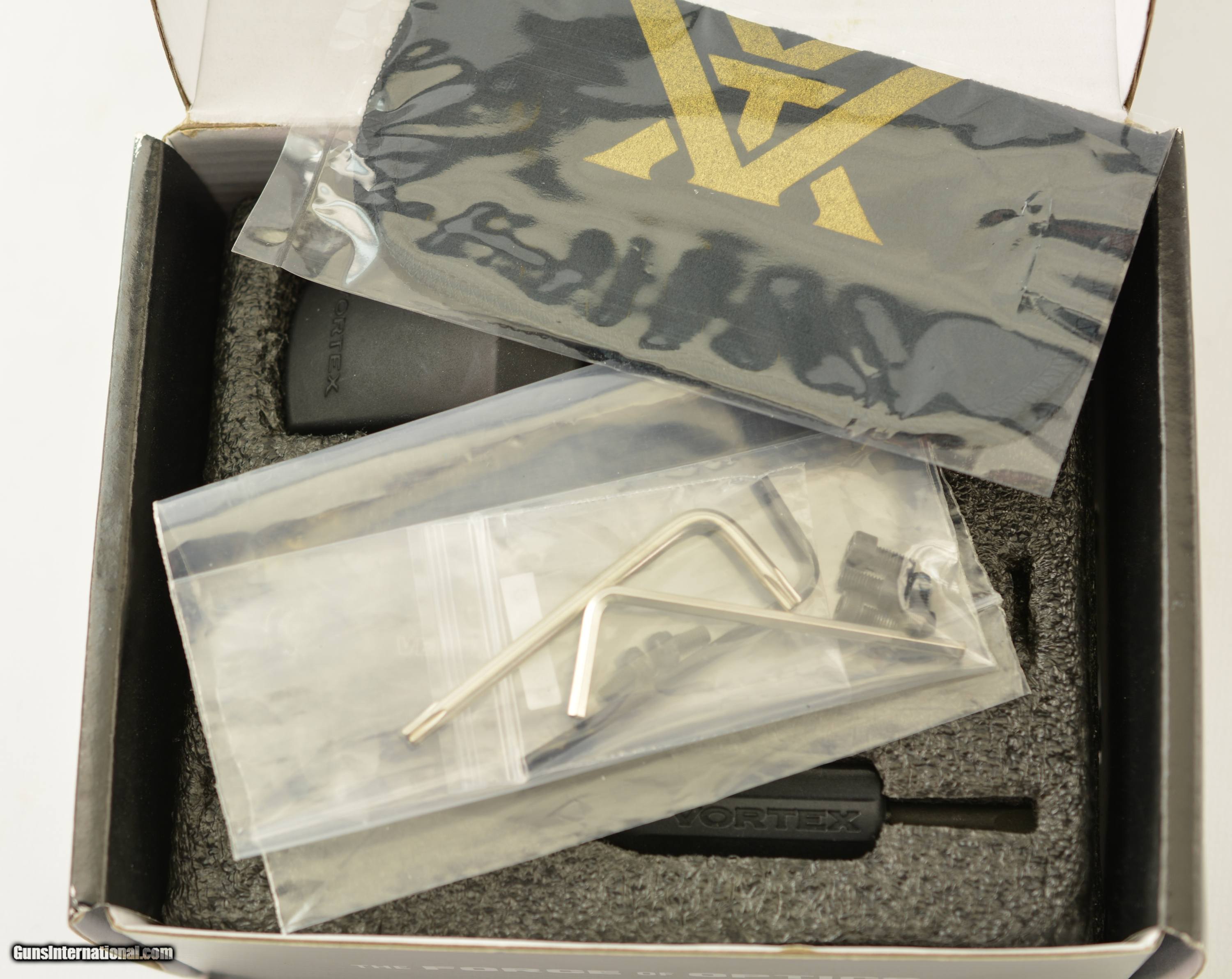 Description: This is a complete sight assembly, still housed in the original box with tools, instructions, accessories, and silicone lens cover. The condition is excellent, and neither the sight, nor the mount base exhibit any wear from use. Excellent condition overall. SOLD Manufacturer: Vortex Model: Vector |