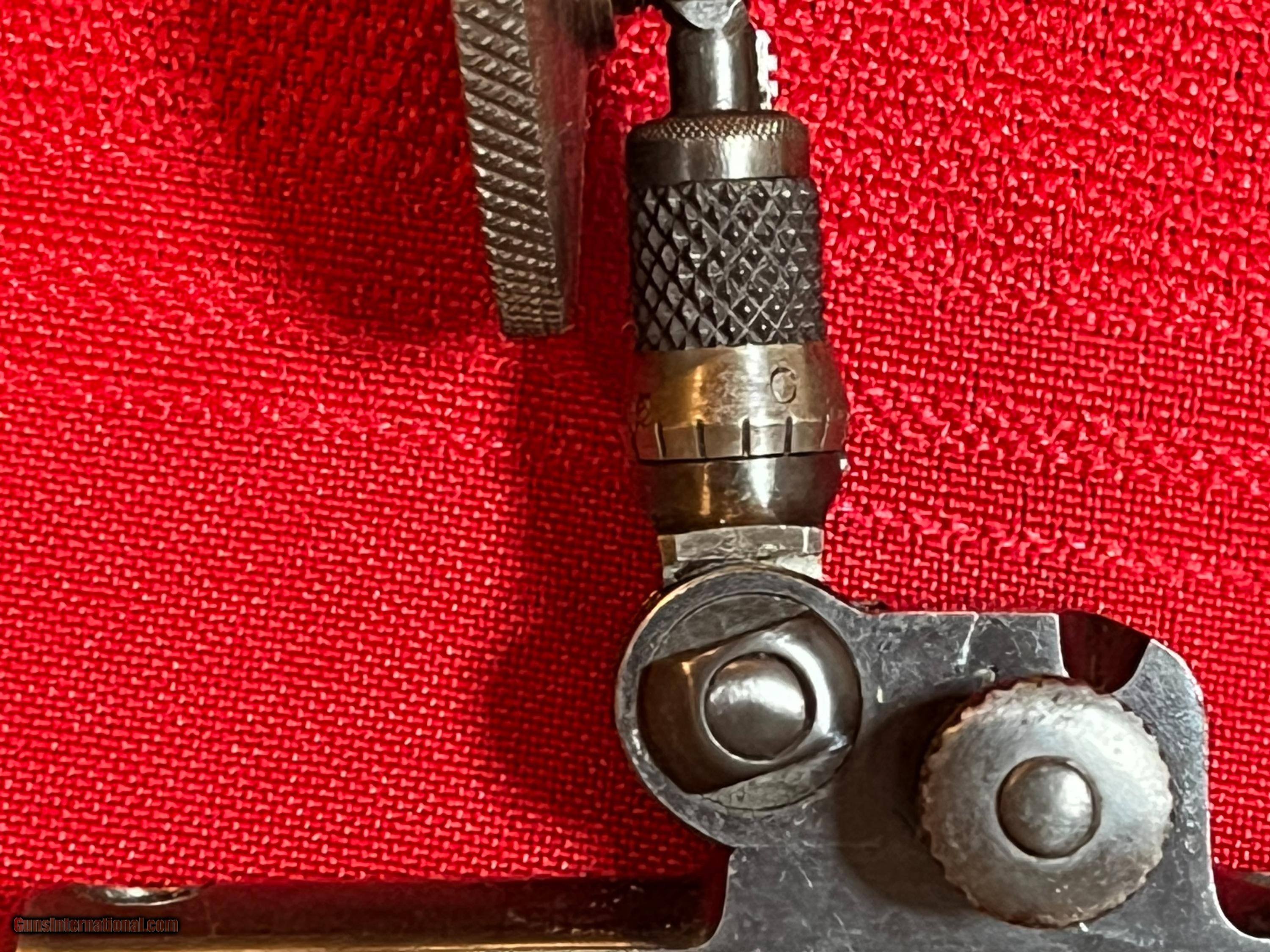 Description: Windage adjustable Lyman tang sight for Winchester 1894 25-35,30-30, 32 Special calibers. Some blue loss on disc. Rest of sight has all the blue. SOLD |