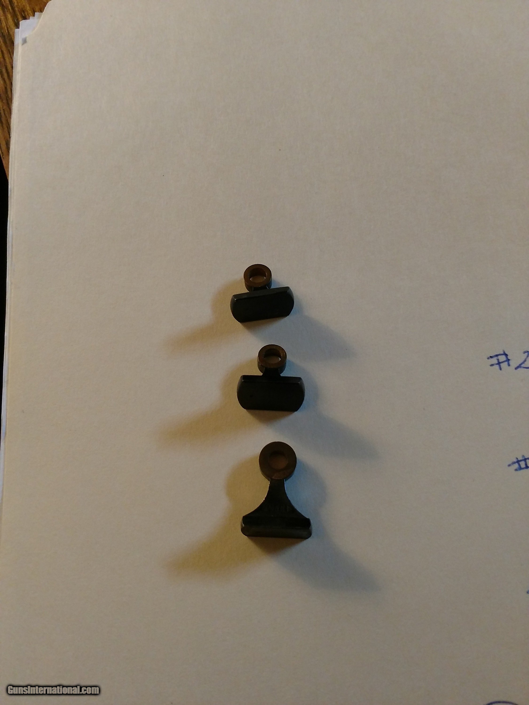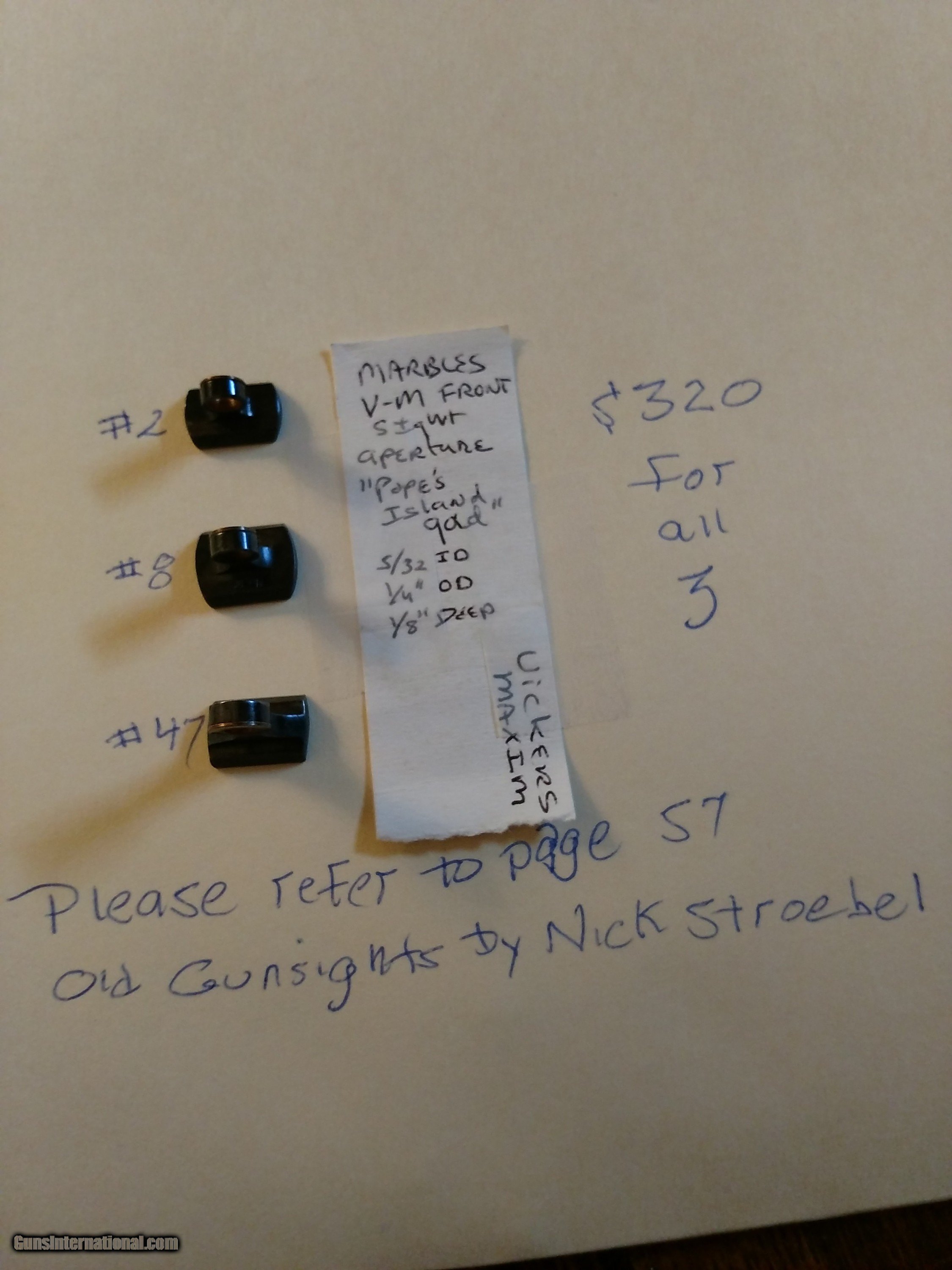 Description: 3 vintage sights by Marbles. They are listed on page 57 of the old sight book by Nick Stroebel. They appear new as never installed. No marks on the sights where they were "tapped" into a dovetail on a rifle barrel or any signs that they were removed from a rifle dovetail. They are listed on the sights themselves as a #2 #8 and #47. These sights are as prestine as the day Marbles produced them. They will ship USPS prioty mail for $10.00 (insurance suggested as an additional cost) SOLD |