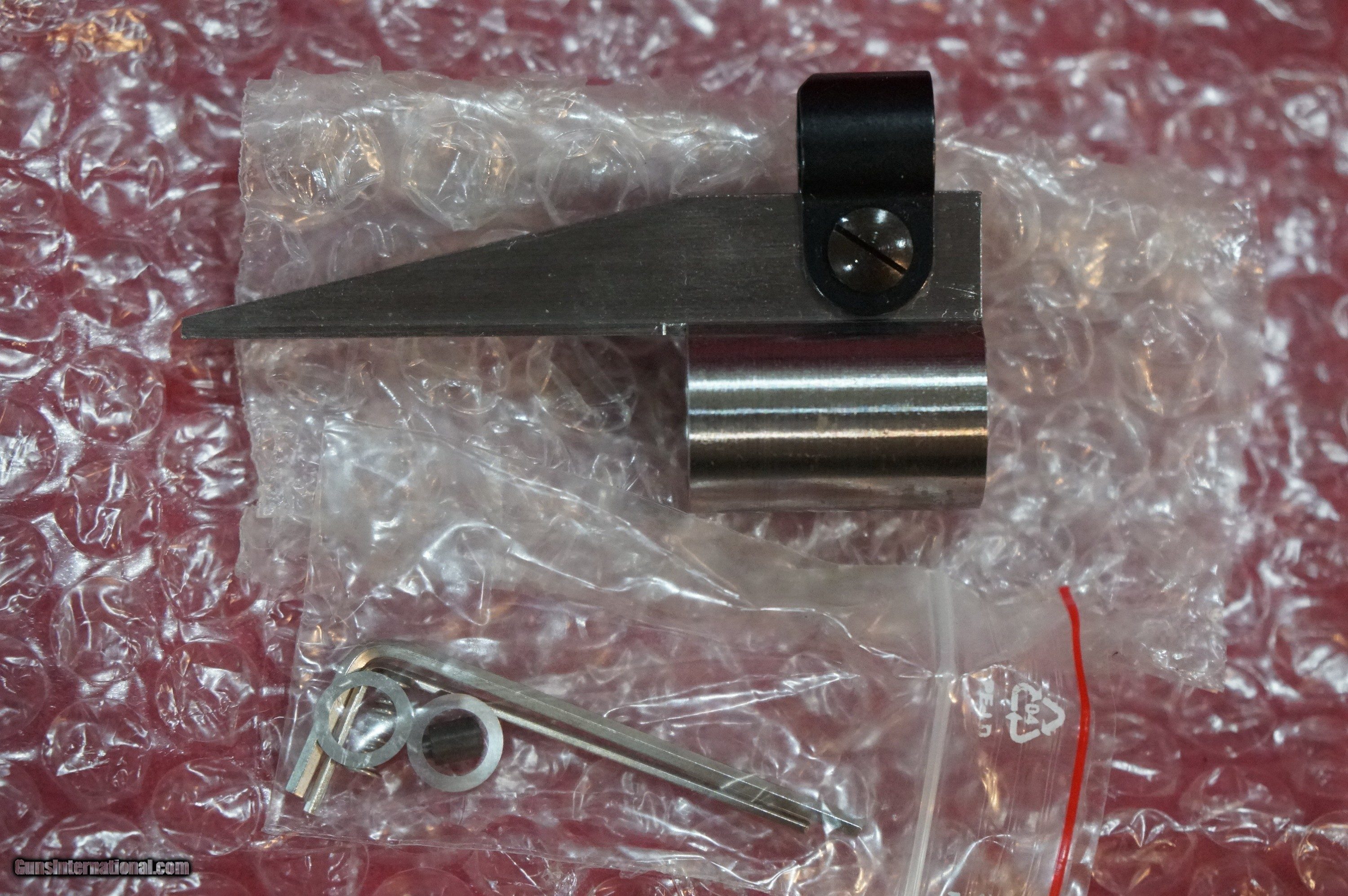 Description: New England Custom Gun Service Classic Ramp front sight base with folding hood. Accessories as pictured. I am the original buyer of this. It has not been modified, altered or mounted- never used. Internal diameter of band is approximately 0.688 inches. Ramp will accept all Masterpeice banded ramp front sight inserts. Current price is $175 by NECGS. I pay shipping. SOLD |