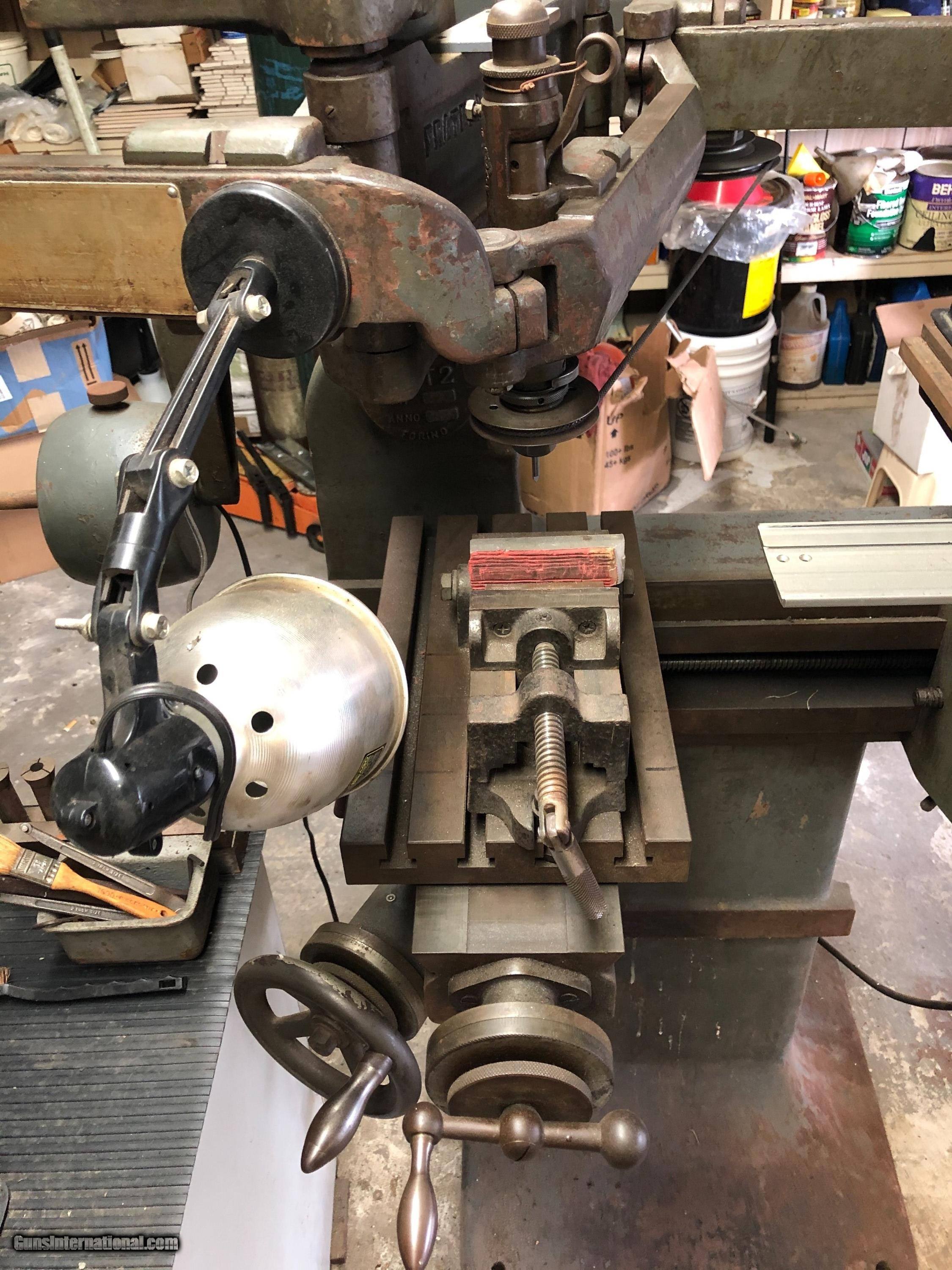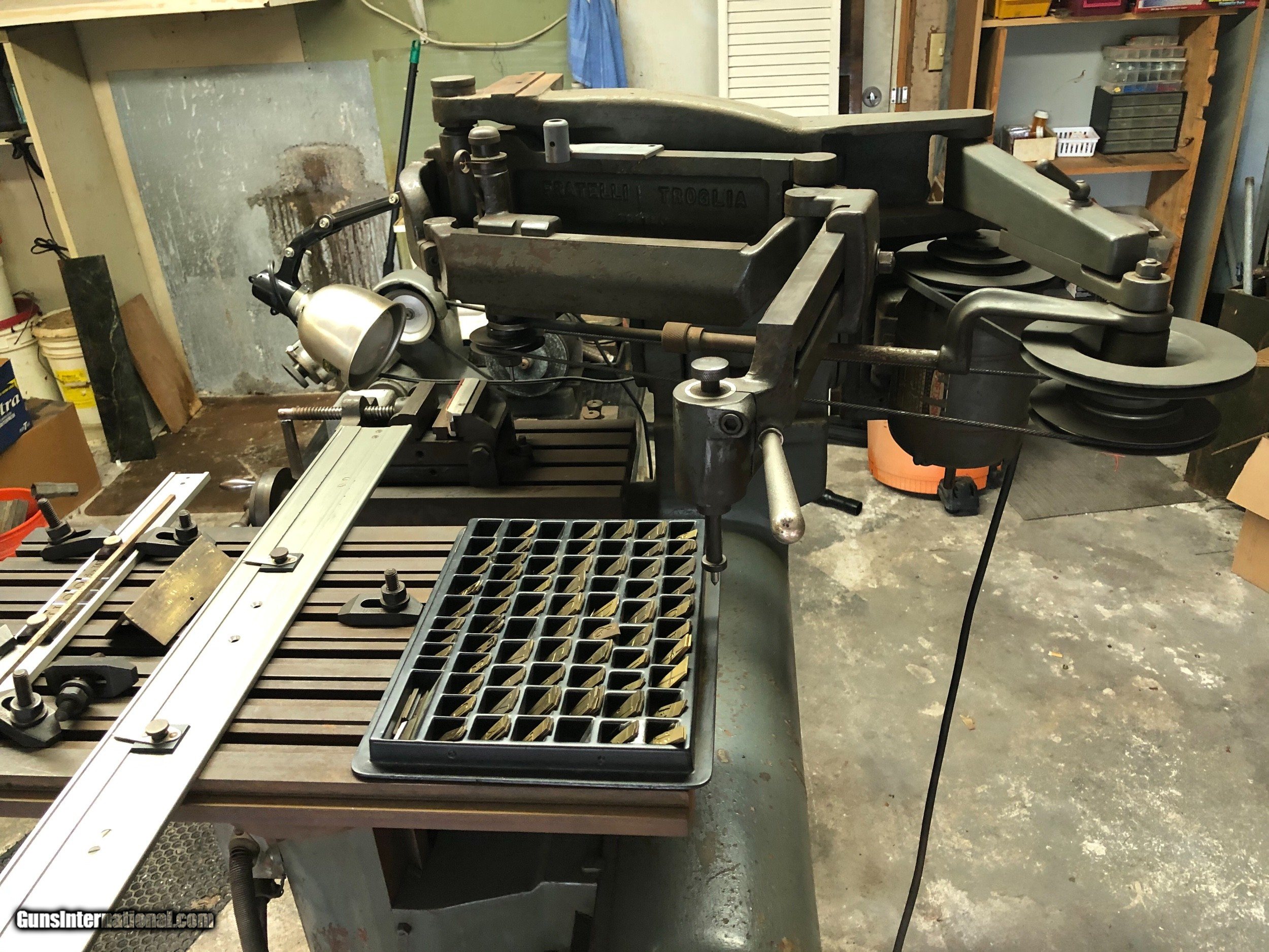 Description: Troglia 3-dimensional milling machine. Made in Torino Northern Italy. This machine is a copy of a German Frederich Deckel GK-21. Suitable for both 2-dimensional engraving or 3-dimensional cutting of marking dies. Excellent condition. Spindle is a German GK-21 Deckel high speed. Comes with a tool vise, a complete brass font set and two font holders. Machine is powered by a 1/2 horse power 120v motor. I have made many hand stamps and roll dies for restoring markings on many different firearms on this machine. Also included is a Gorton Tool Co. Model 265-5 single flute cutter grinder. Included are grinding wheels for sharpening high speed cutters and a diamond wheel for grinding carbide cutters. This Gorton cutter grinder is also a 120volt machine. Sold complete ready to cut dies. Perfect for the gunsmith that restores the markings on Colts, Winchesters, Lugers, P-38's, S & W, Sharps, etc. Some masters available. $2700 Machine is located in Jacksonville, FL Can easily fit in a van or 1/2 ton pickup. SOLD |