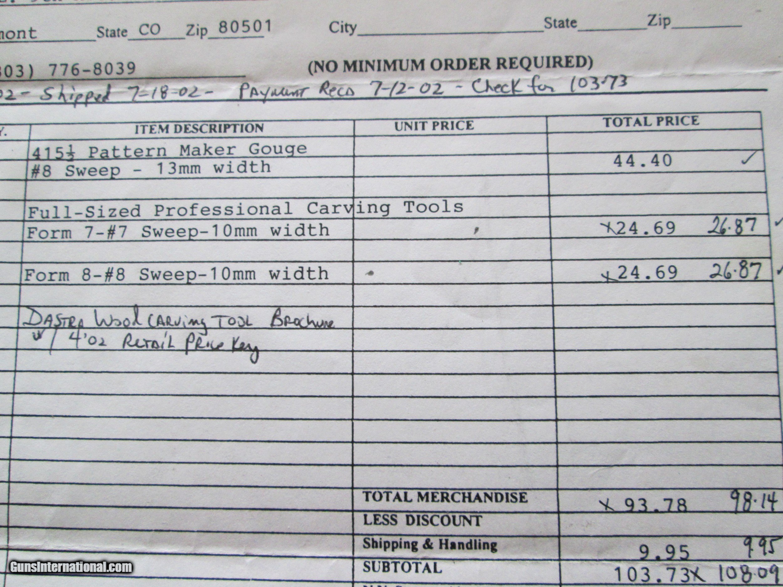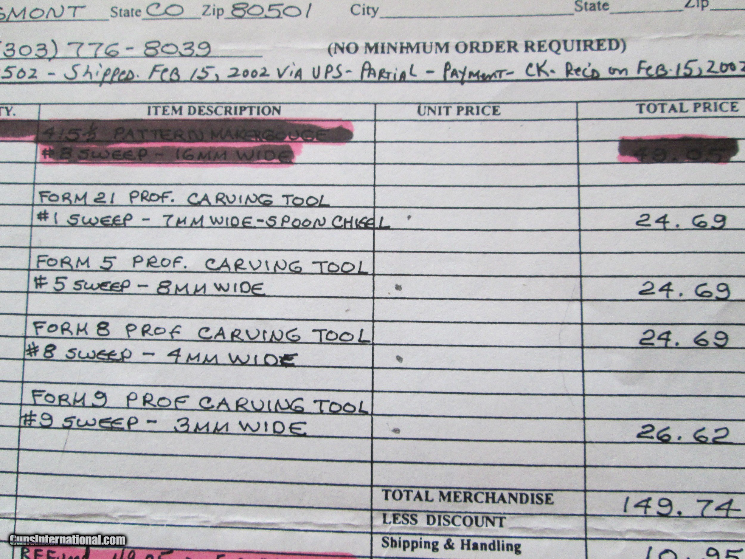 Description: A set of seven quality German tools that I bought in 2002 for stock inletting and never got around to using. Types and details are shown in the pictures of the invoices and the brochure which will come with the tools. Priority Mail shipping is included. SOLD |