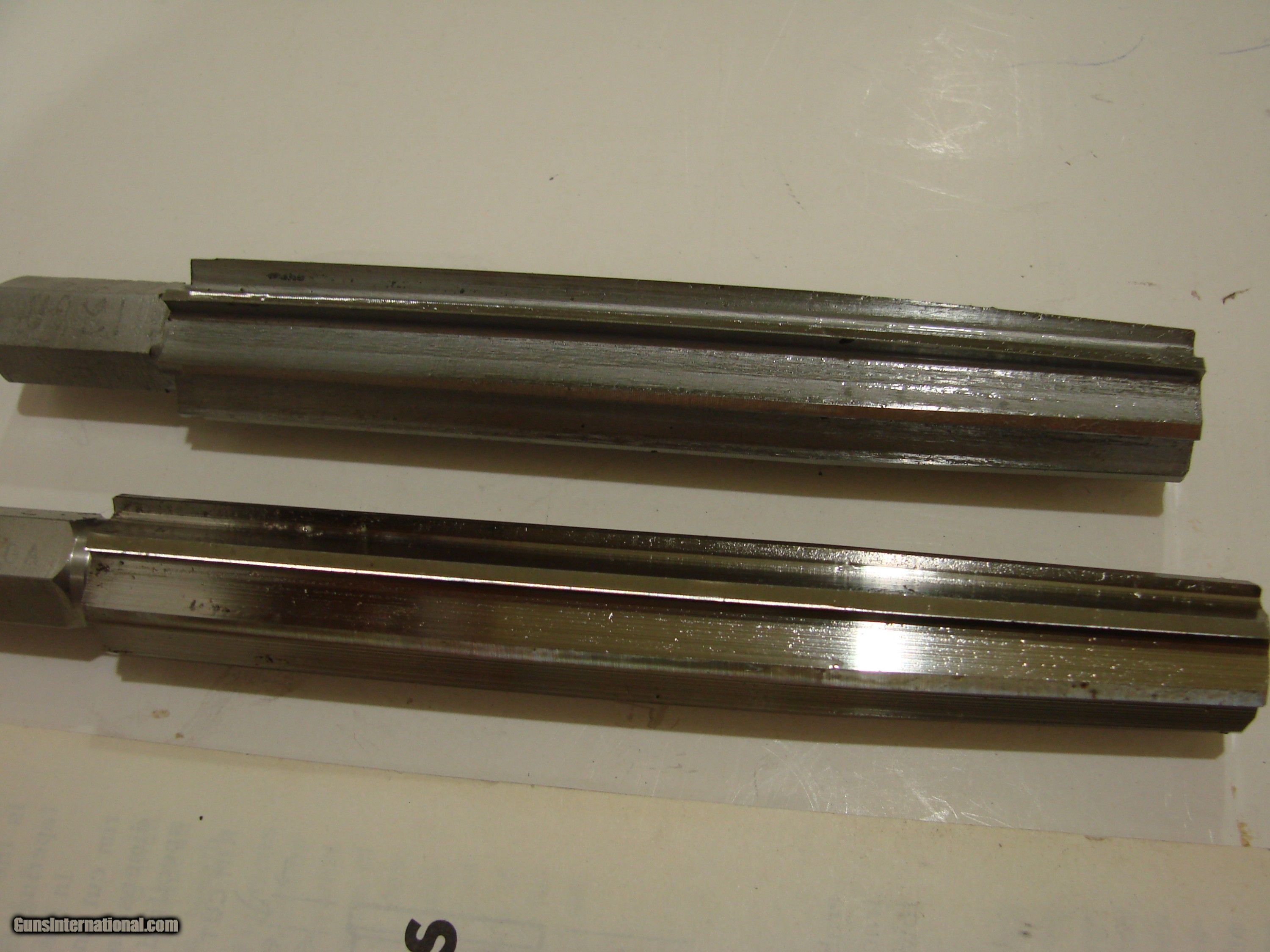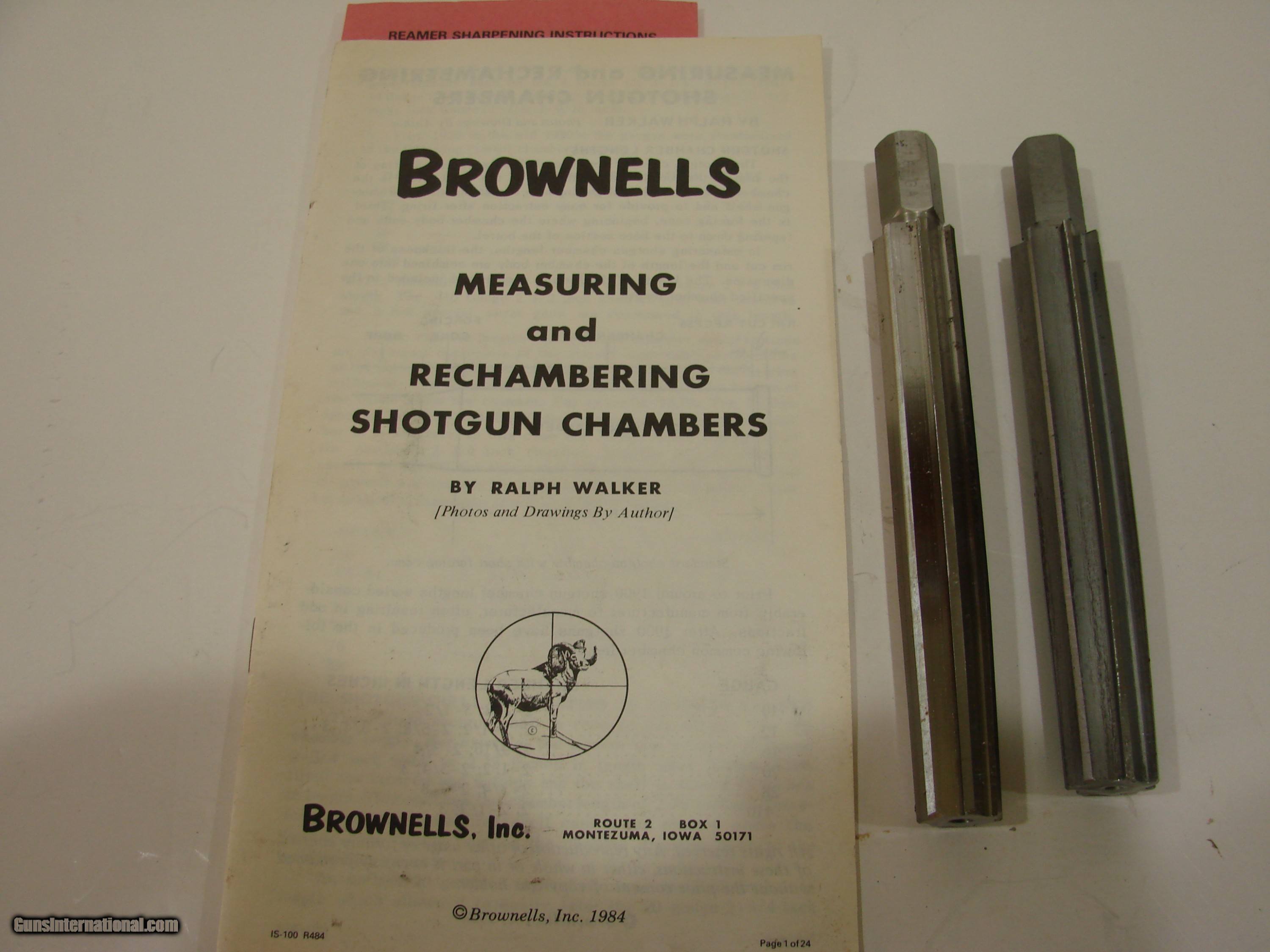 Description: This is 2 straight flute reamers to lengthen the forcing cone on a shotgun barrel. 12gauge and 16 gauge reamers. The reamers will lengthen a short chamber or cut a long forcing cone. Will work on most barrels except chrome. Can be used with a socket and T handle. Lathe is not required. Will produce approximately 1 1/2" long forcing cone. Excellent condition, gently used. Still sharp, no nicks. Included booklet from Brownells on measuring, chambering and sharpening. Good instructions on use. Phone 928-581-6325 email pappraymsn please leave message if I don't answer. Shipping included in USA SOLD |