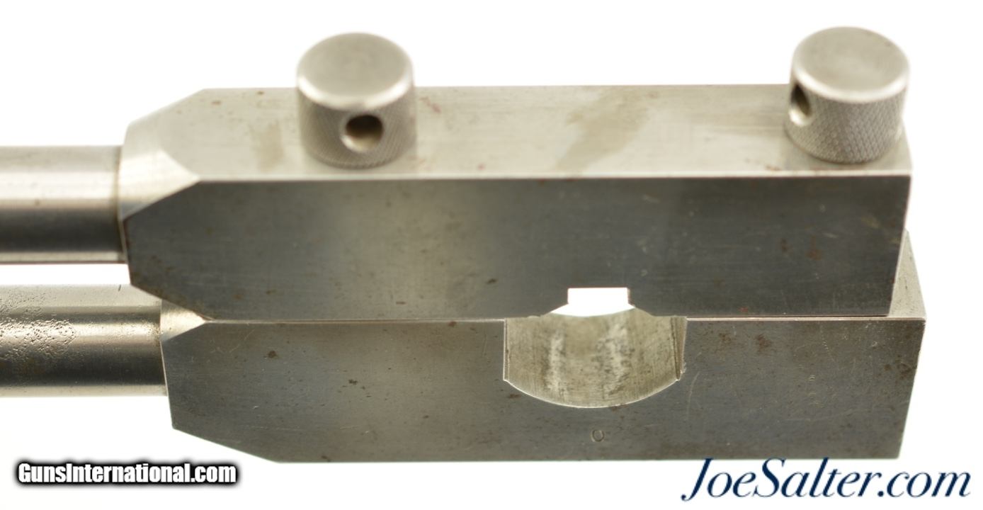 Description: This is what we believe to be a two-piece, heavy steel wrench. It looks like it clamps to the front of the top receiver to remove the barrel. The offset blocks have long cylindrical handles, and are fastened via two knurled screws. The bottom block is stamped "0", but no other markings are present. This is an interesting Luger accessory, and would make a great addition to any collection.; SOLD |