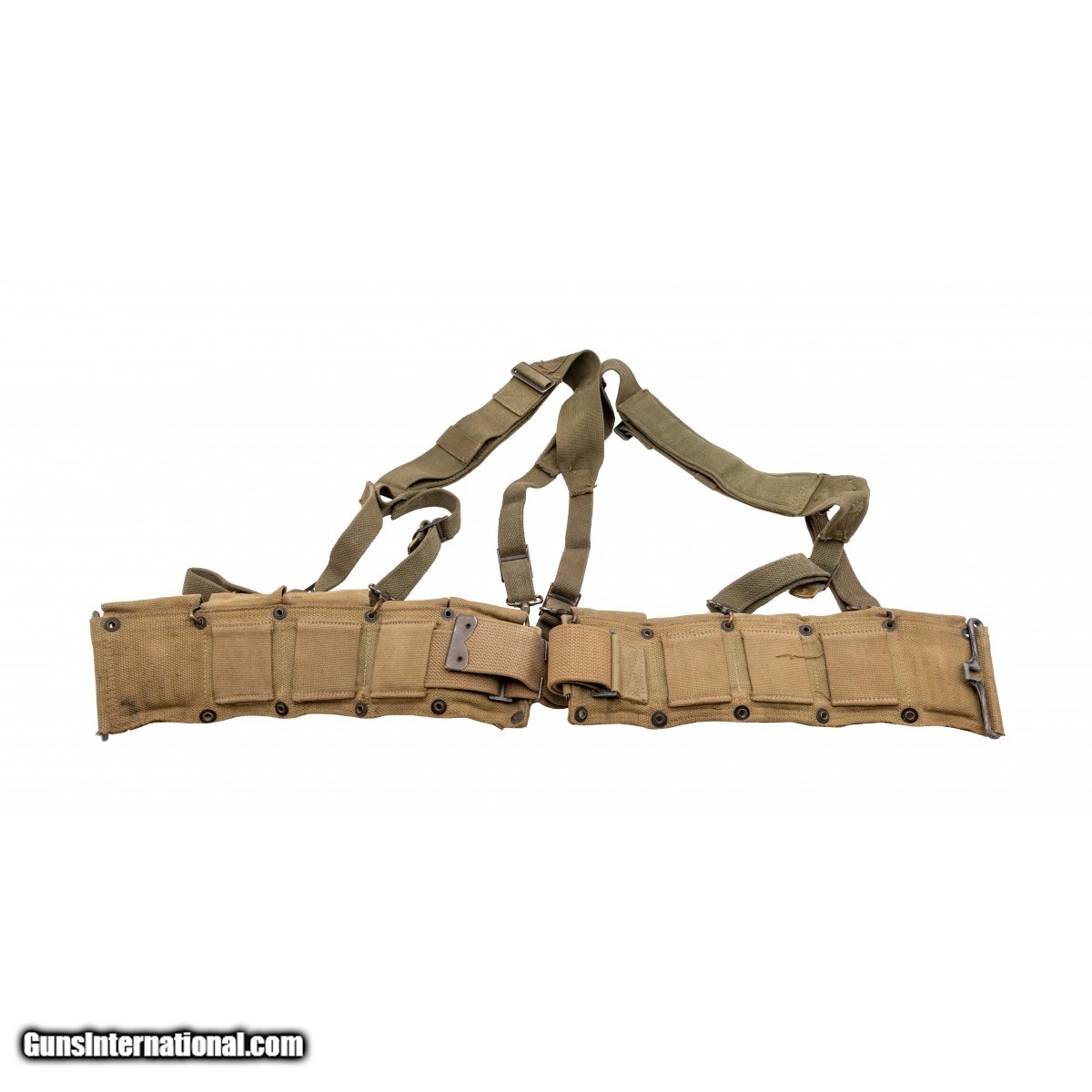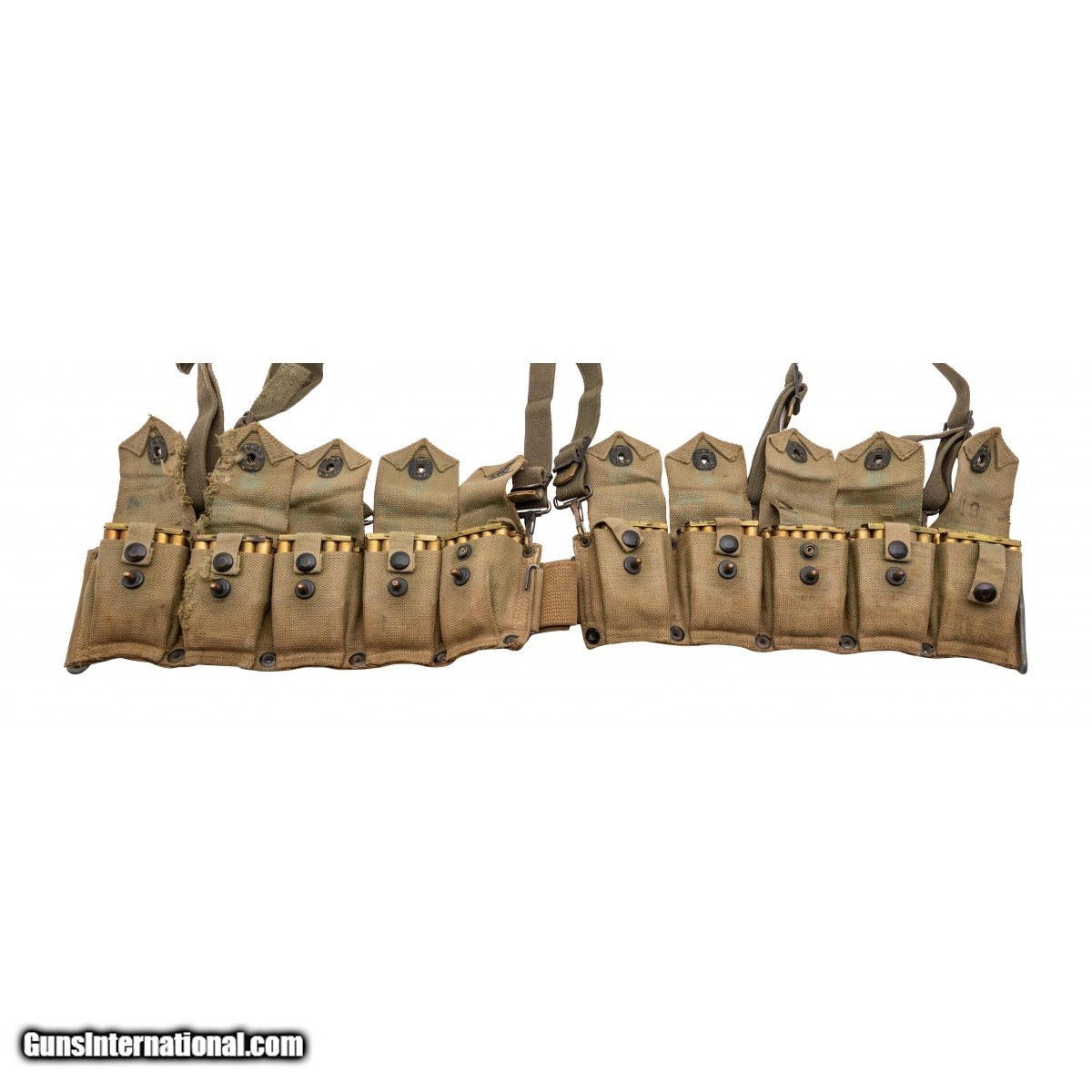 Description: " U.S 10 Pocket ammo Bandolier belt with shoulder strap. Ammo pouches filled with .30-06 Stripper clips. SOLD |