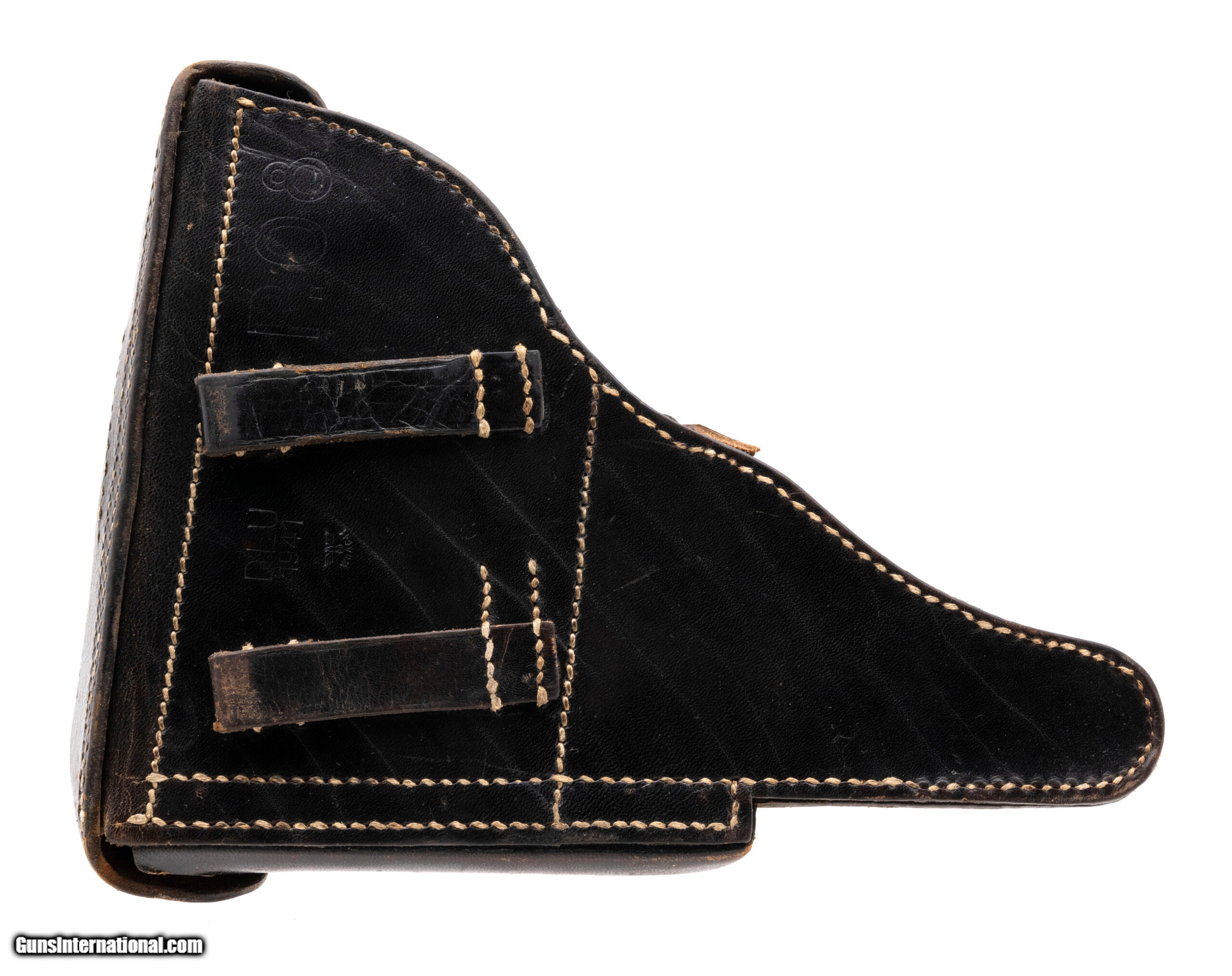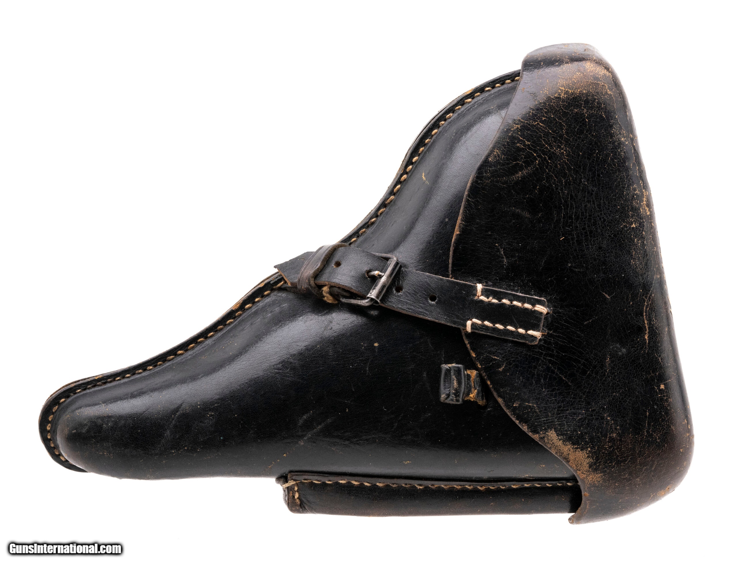 Description: "1941-dated World War II-era P-08 leather flap holster in very good condition. Marked ""DLU 1941"" on the back just above an eagle over ""WaA641"" WaffenAmt. SOLD |