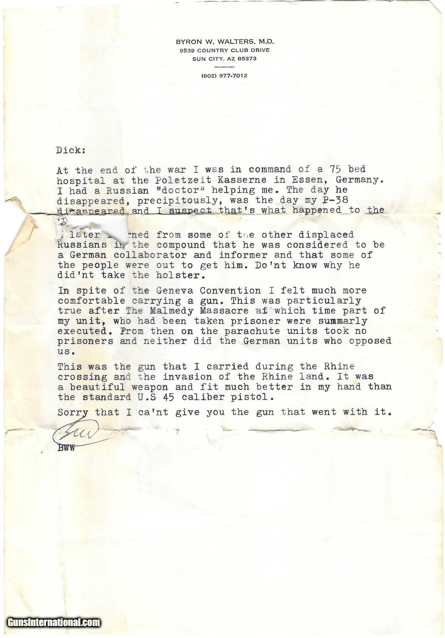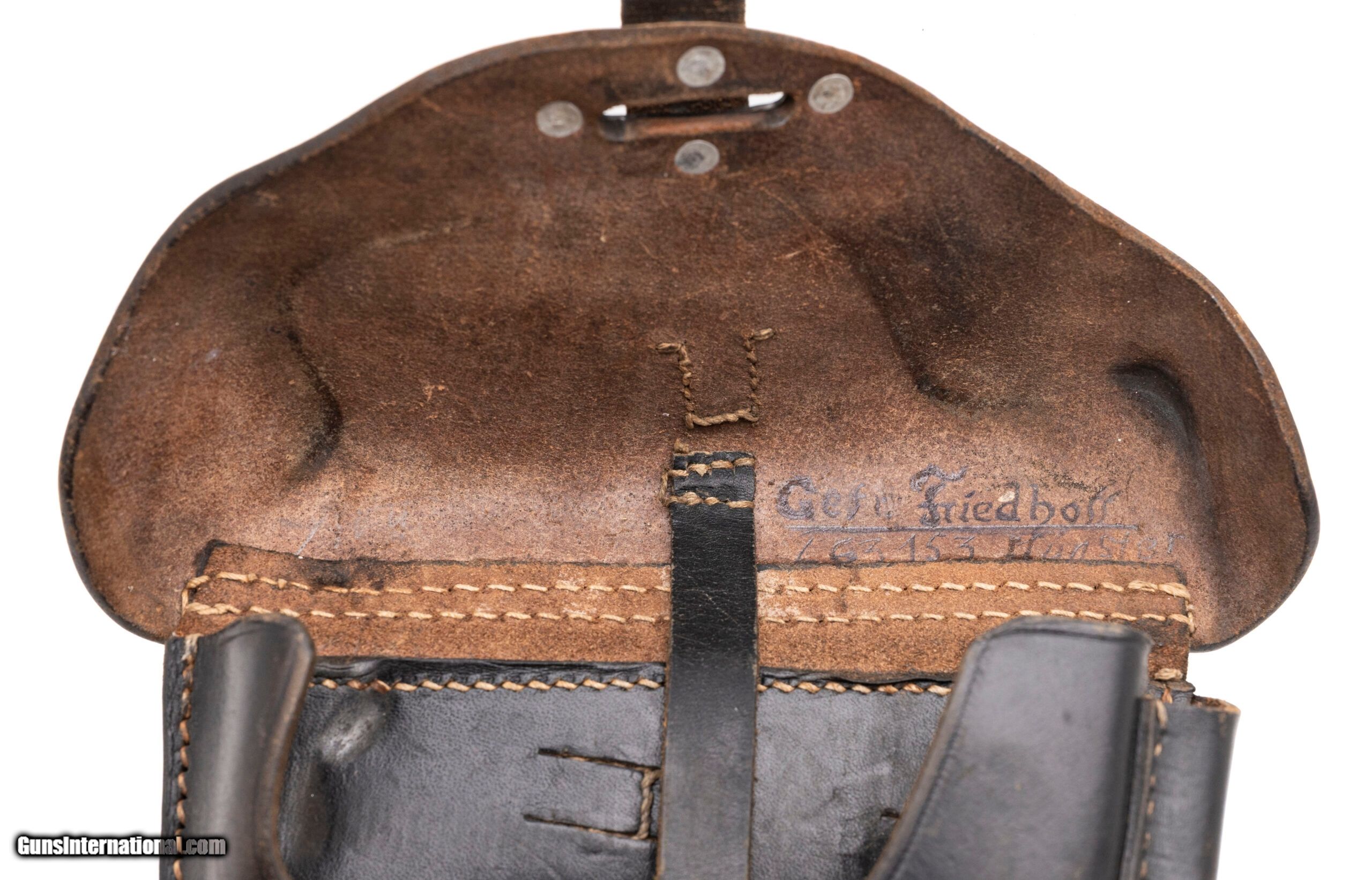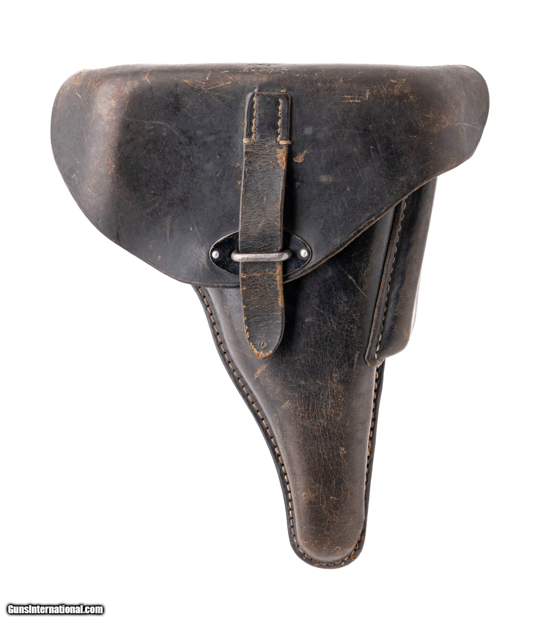 Description: "World War II production black leather hardshell P-38 pistol holster made by Moll Lederwarenfabrik (Leather Goods Factory) in 1942. Marked ""cxb 42"" on the back with a WaA727 Waffenamt acceptance mark. Overall condition is good to very good. The inside of the flap is marked ""Gefr. Friedhoff"" & there is a brief description of the provenance included in a short letter that is stored in the spare magazine compartment. Price: $750.00 Contact Seller |
