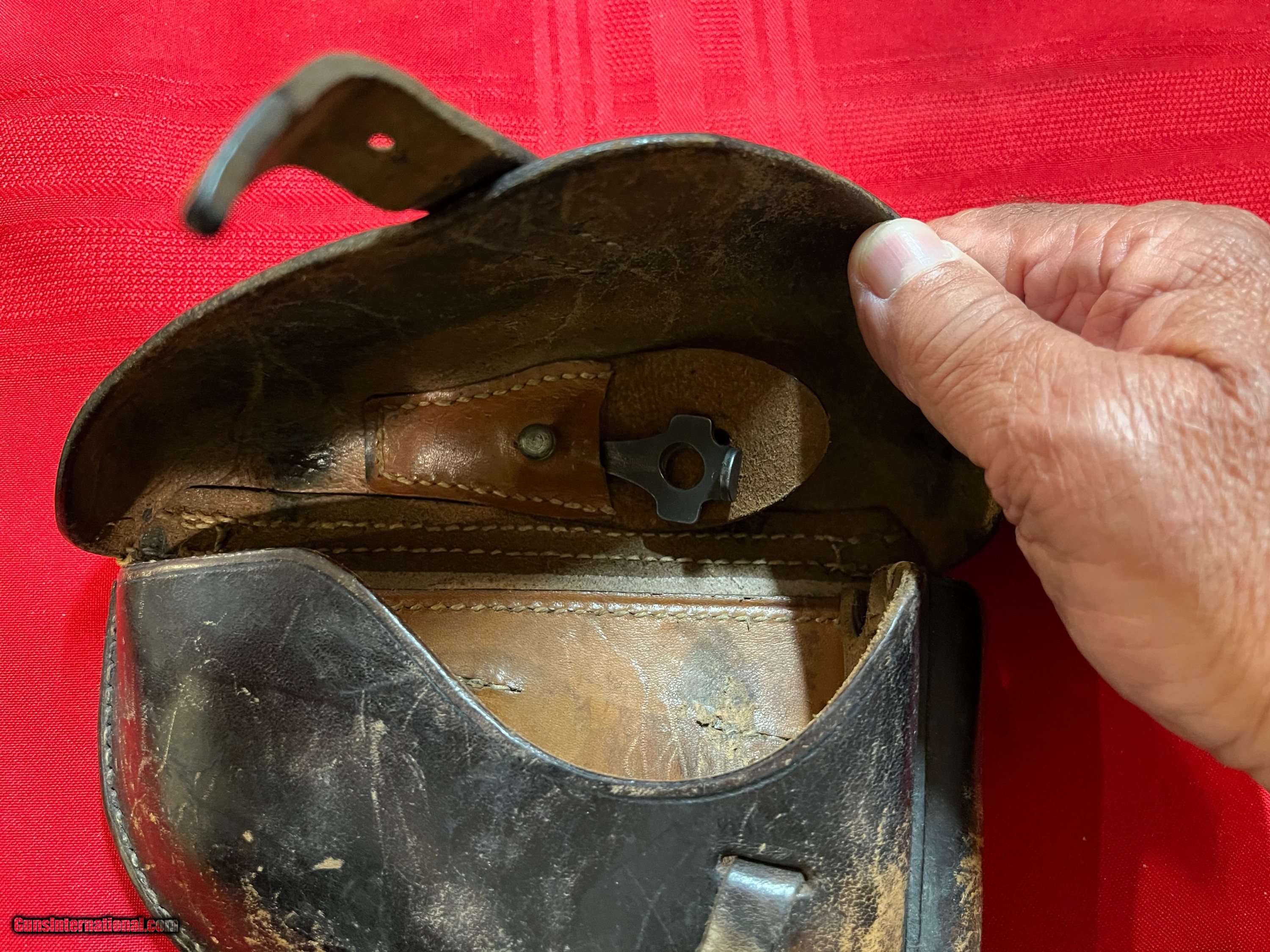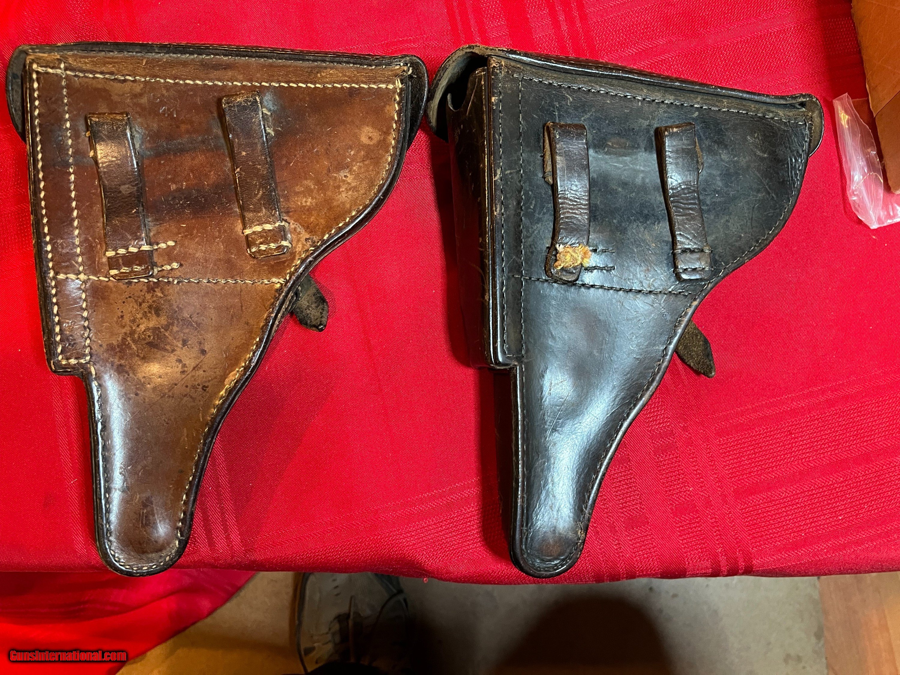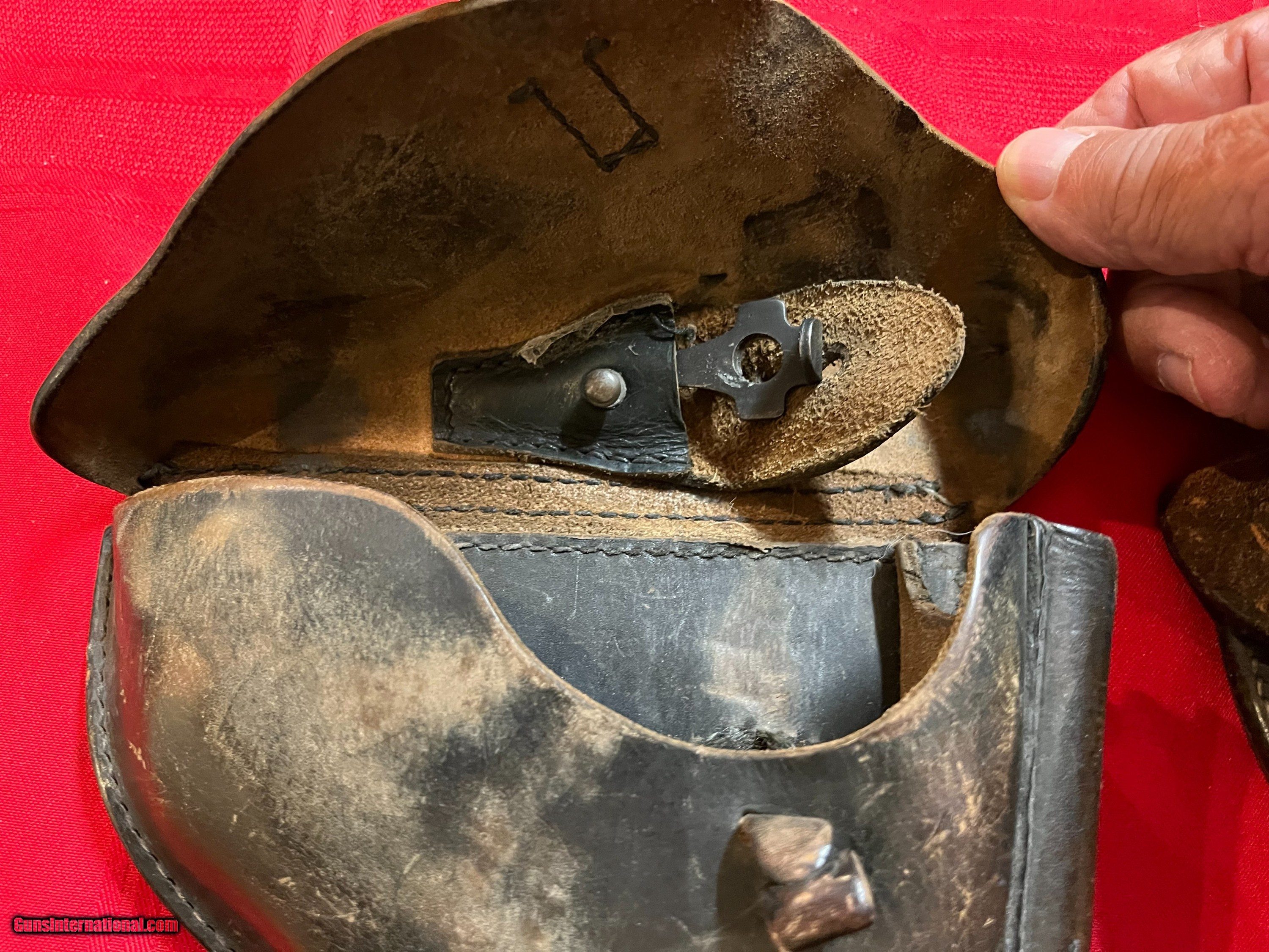 Description: 1. Brown holster with no visible markings. Has tool with eagle. One bely loop has stitching repair, other wise stitiching is all there.Pull loop and closing strap undamaged. $265 2. Brown holster marked cey 41 and WaA 41. Original stitching and tool. Pull strap and closing strap good shape. $375 SOLD |