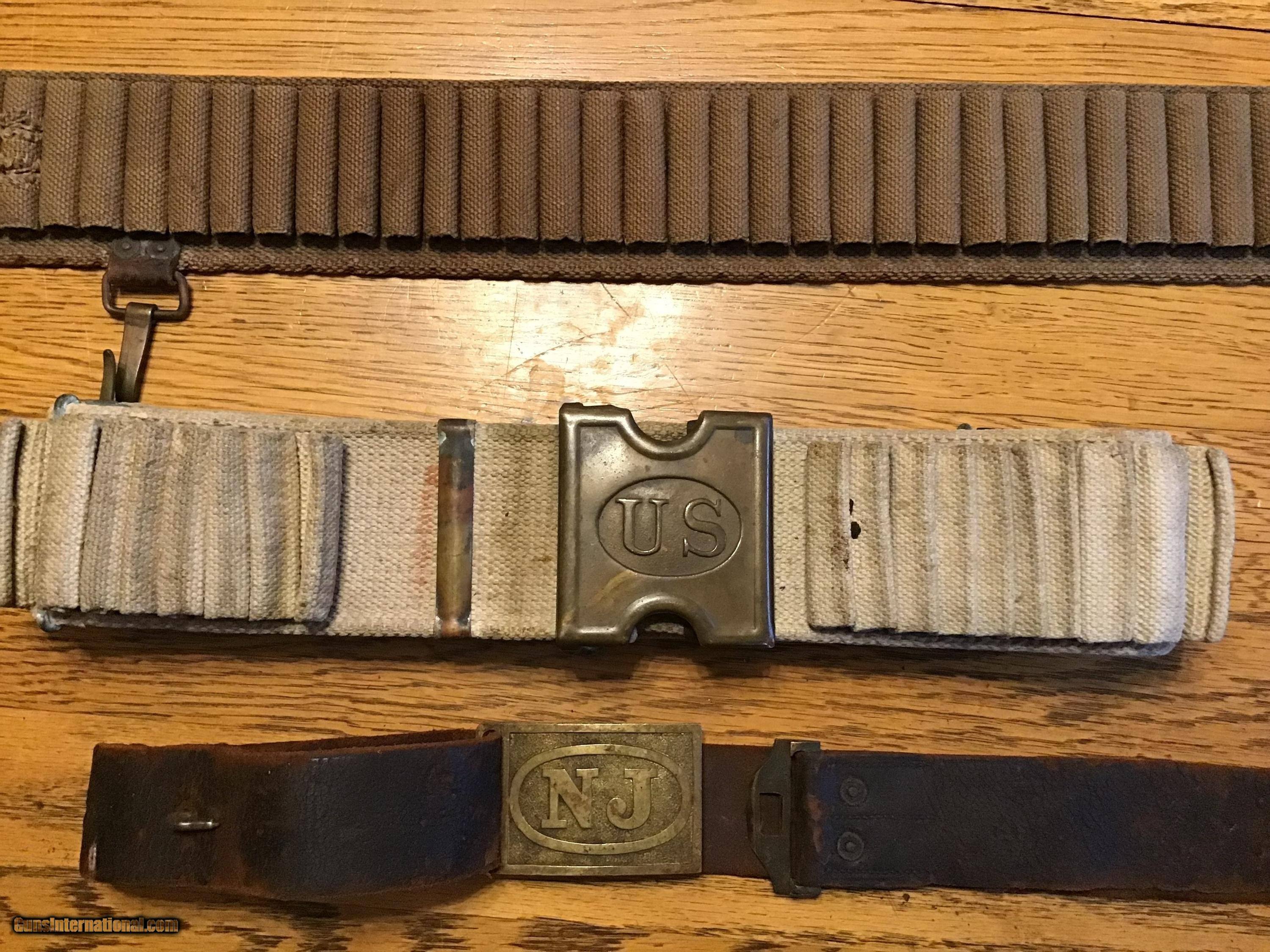 Antique 45-70 and 30-40 ammo belts and cartridge box and 1874 leather NJ belt.