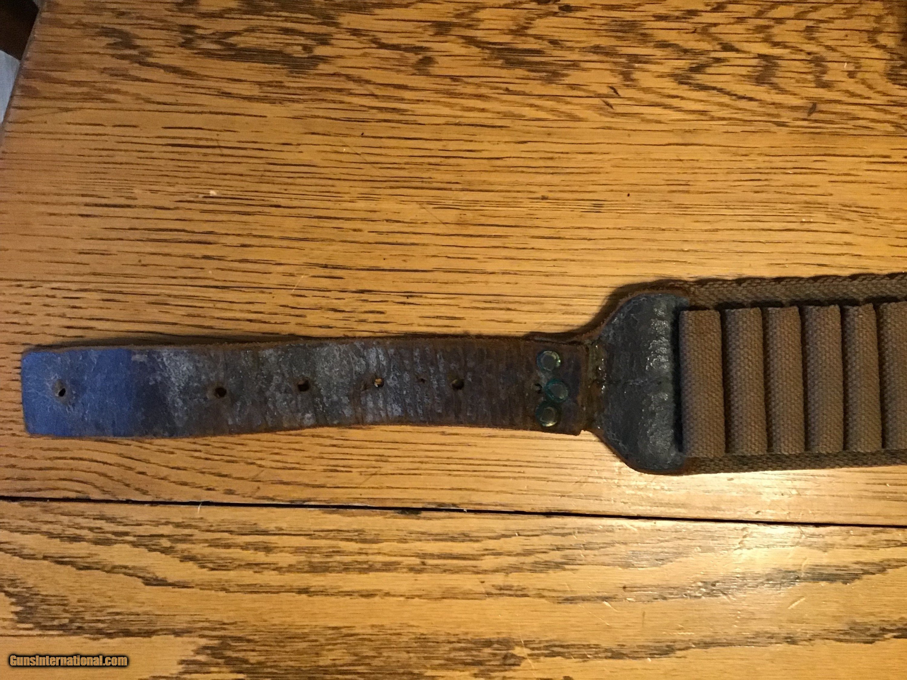 Description: 1. Original Antique Model 1885 US army cavalry cartridge belt with 43 los and a brass hanger. In fair condition showing wear from use the original toung was broke and reattached with rivets. $150.00 plus shipping 2. Sold 3 Antique Model 1874 Indian and Spanish American war era leather with brass buckle NJ (NewJersey) marked army belt in fair condition. The leather has crazing and flaking. $85.00 plus shipping 4 Rock Island Arsenal Marked US Army 30 -40 Caliber leather cartridge box dated 1908 in very good condition $65.00 plu shipping SOLD |