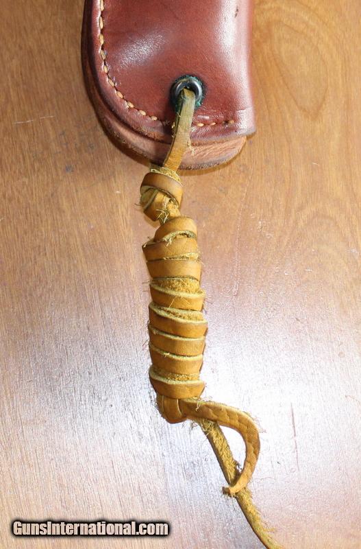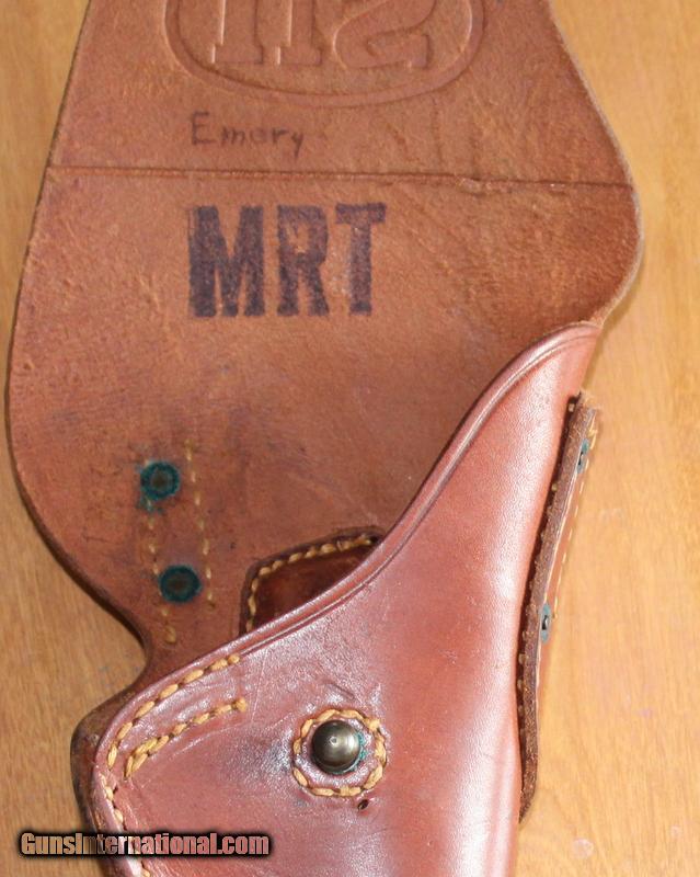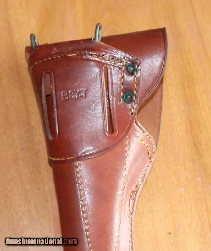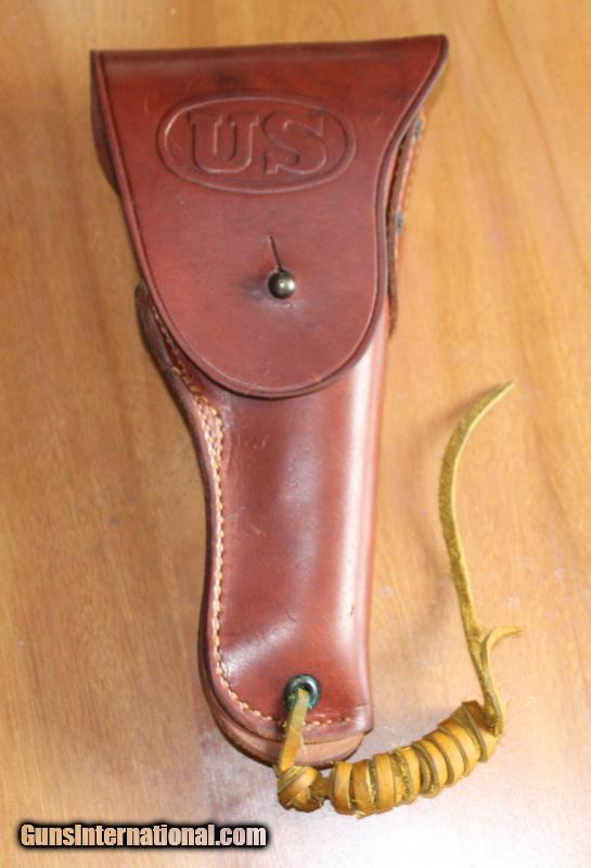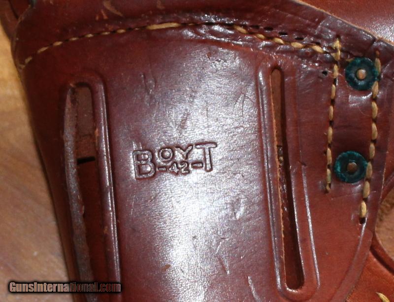 Description: WW II vintage U.S. Model 1916 holster for Colt 1911. Manufactured by Boyt in 1942, they were one of the primary contracters for military leather items. Solid shape in near perfect condition. Correct MRT stamp with a pervious owner's name writing inside. With coiled leg tie, this vintage original saddle tan/ brown holster has not been dyed like so many others. There is a bit of green corrosion/ verdigris showing on the metal parts which is normal. Super nice collectible. Payment is to be made with secured funds, bank check or money orders. No credit cards. Shipping & handling is FREE on this item- USPS. SOLD |