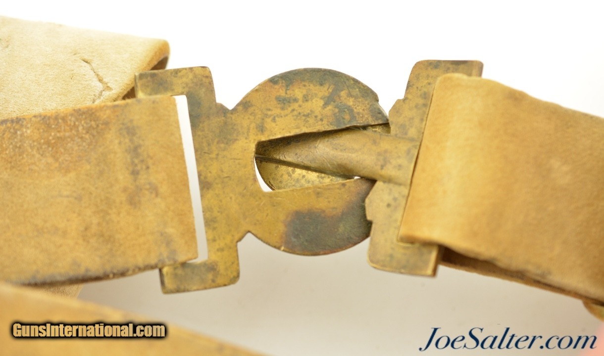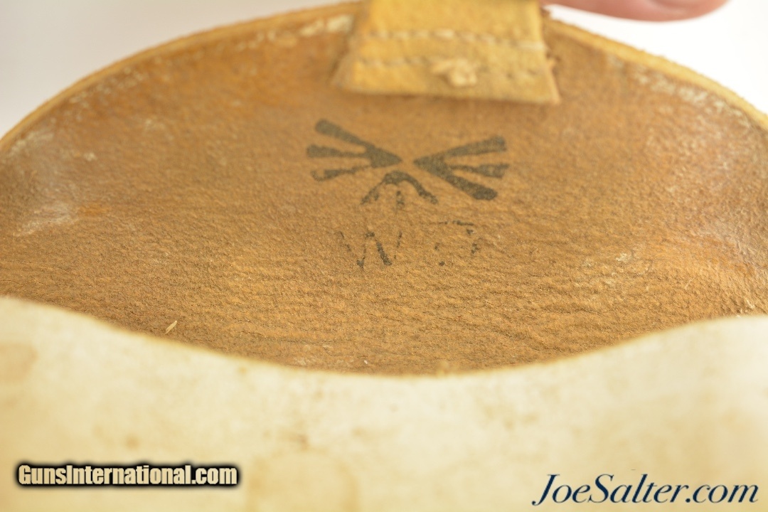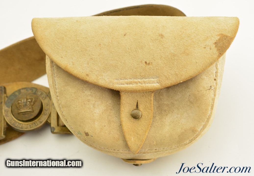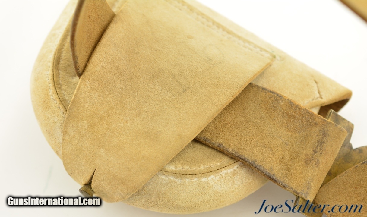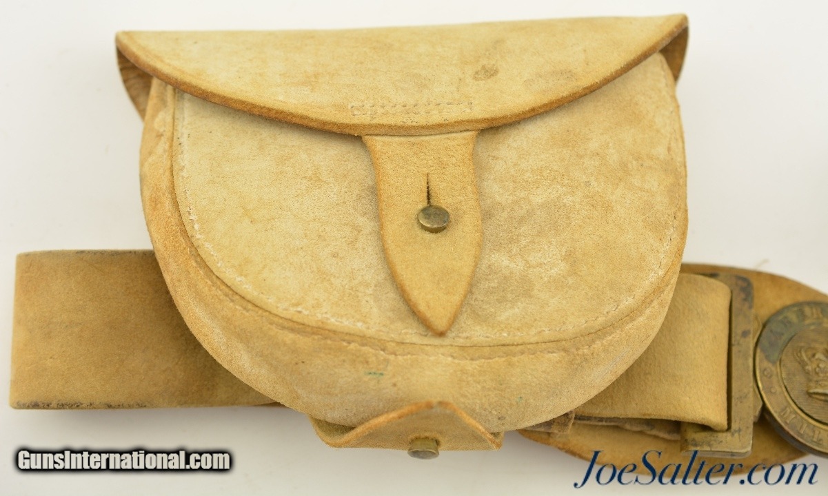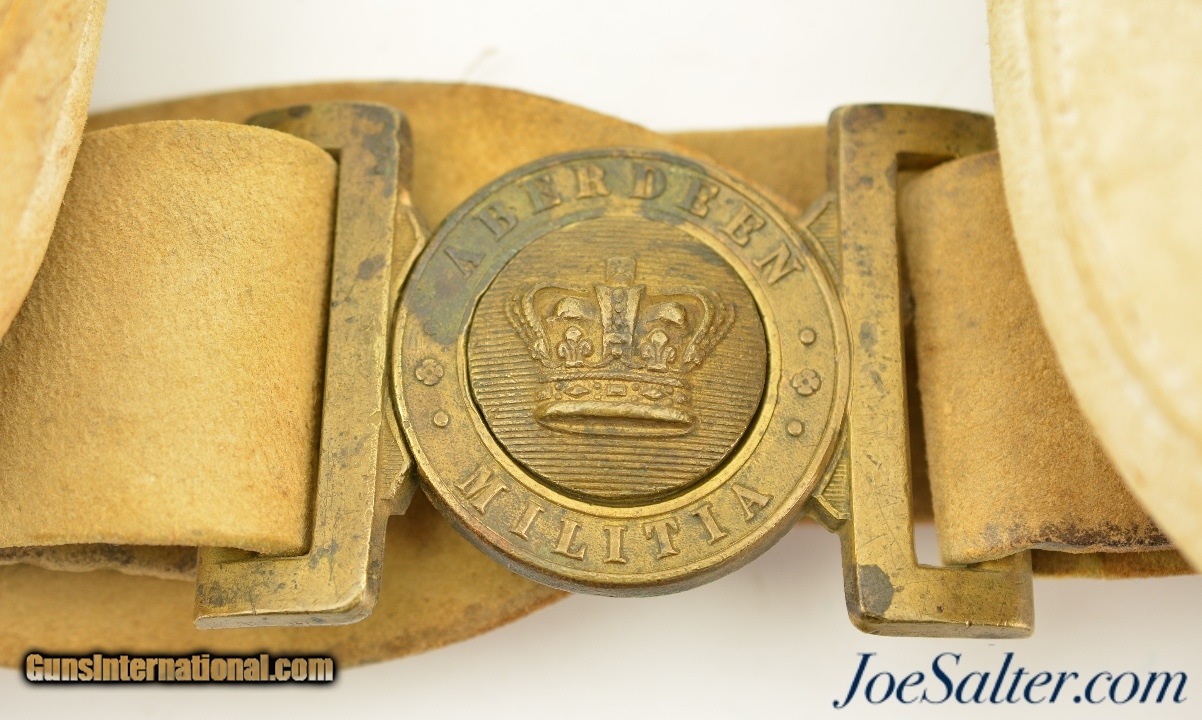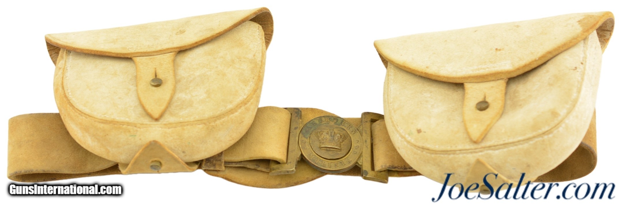 Description: This is a set of British Victorian Era Belt with two Ammo Pouches in White heavy leather. This collection was issued to the ABERDEEN MILITIA. The inside flap on the both pouches show the ink stamped WD broad arrow and the surplussed mark of broad arrow facing arrow. One pouch contains 16 arsenal cast lead bullets. The belt is mounted with the original brass buckle for the Scottish Aberdeen Militia. The unit is in very good+ original condition. This is a less than common piece for the British or Scotish Collector. SOLD |
