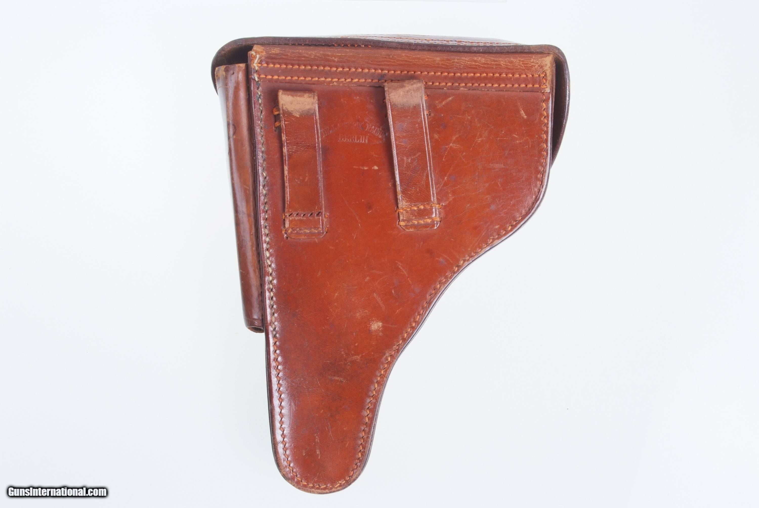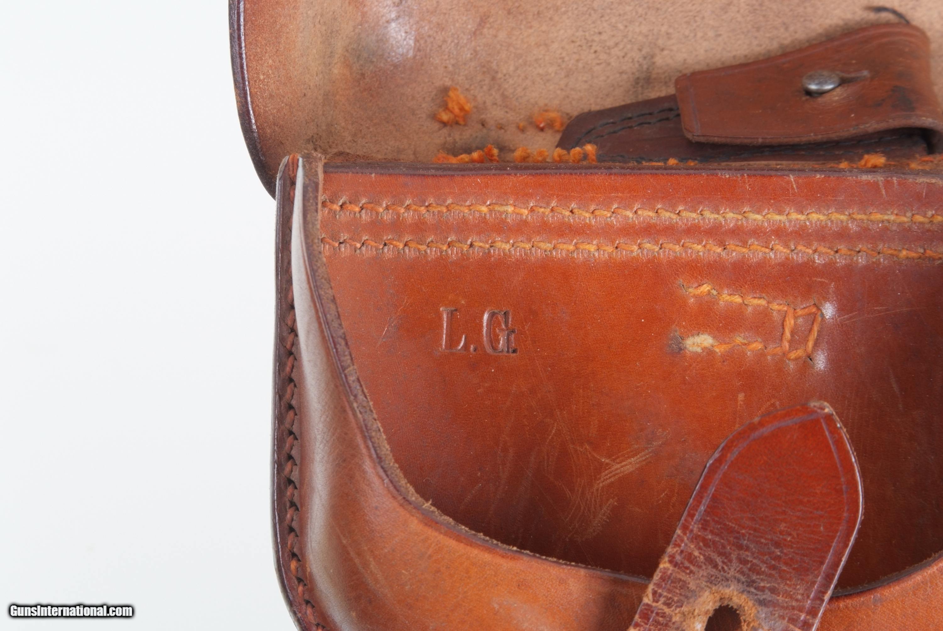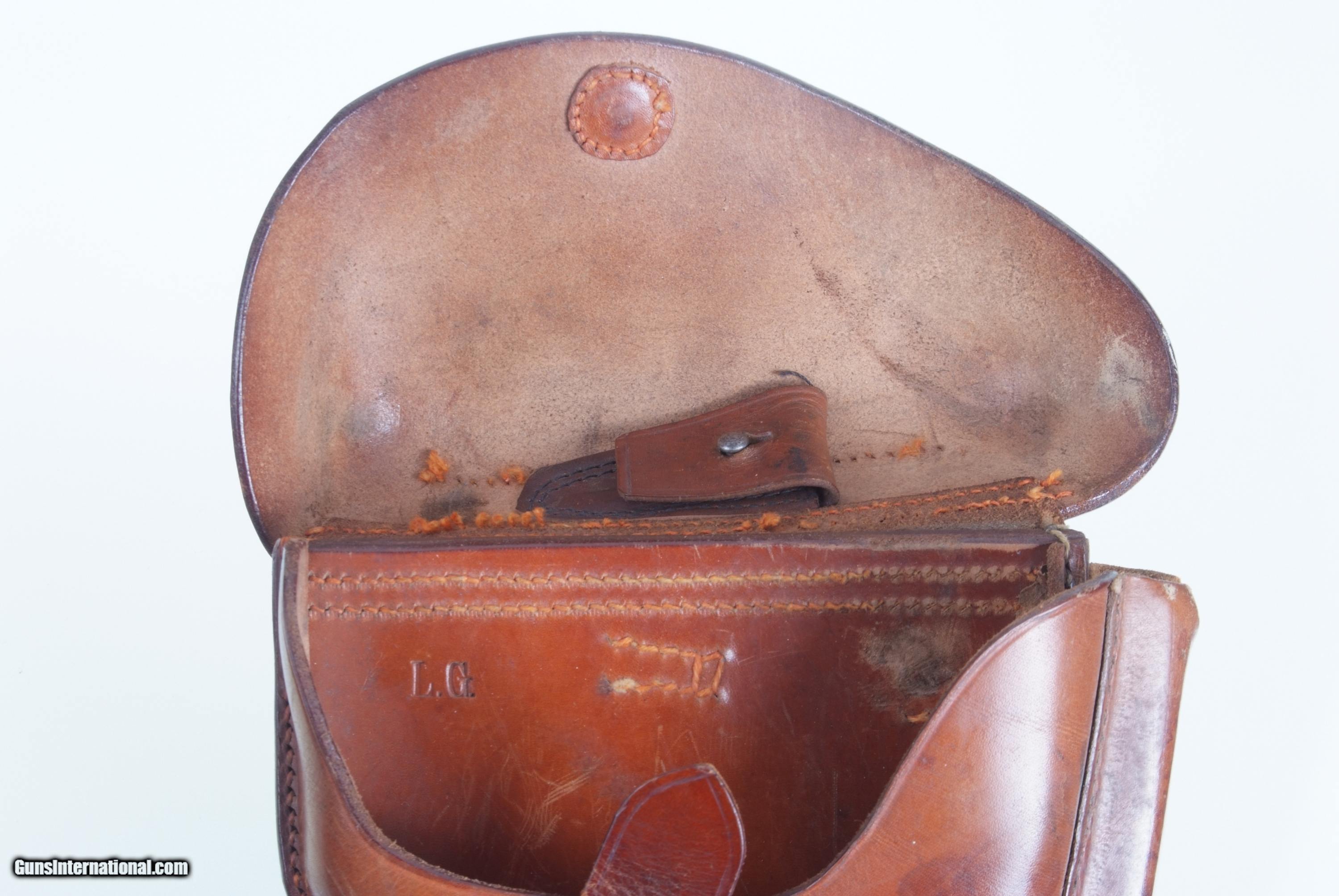 Description: Russett brown, hard shell holster issued to the German Land-Gendarmerie as reflected by the ‘L.G.’ inner marking. Obverse side manufacturer marked in Berlin. Original dark orange stitching. As true for many of these holsters, it was later converted for a Luger with the addition of a spare magazine pouch on the leading edge and internal flapped pouch for the takedown tool. One of the scarcest German police holsters by any metric. Synopsis: Very scarce hard shell holster issued to the German police for the 1910 Dreyse pistol in 9mmP, later modified for Luger. Condition: VG-Excellent with scuffs, water stains, and the added pouches as described. Stitching reinforced in a few areas with a few internal losses as pictured. ~~Insured shipping fee of $35; most packages shipped using FedEx 2nd Day.~~ SOLD Manufacturer: Dreyse Caliber Info: 9mmP |