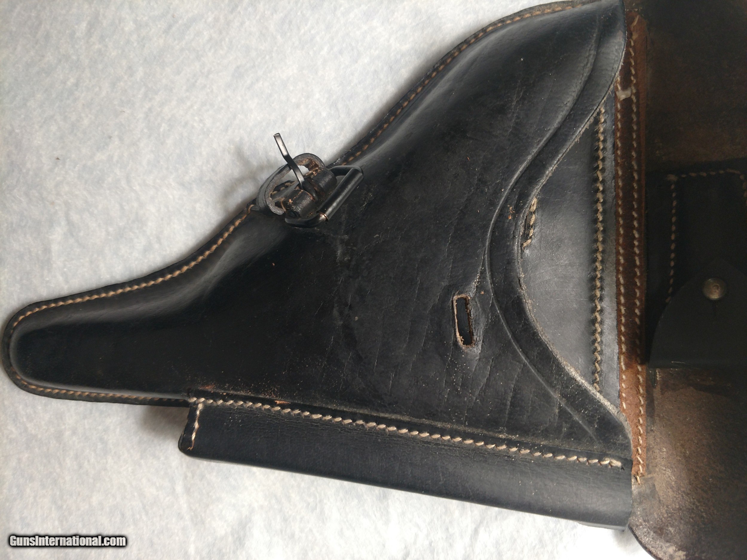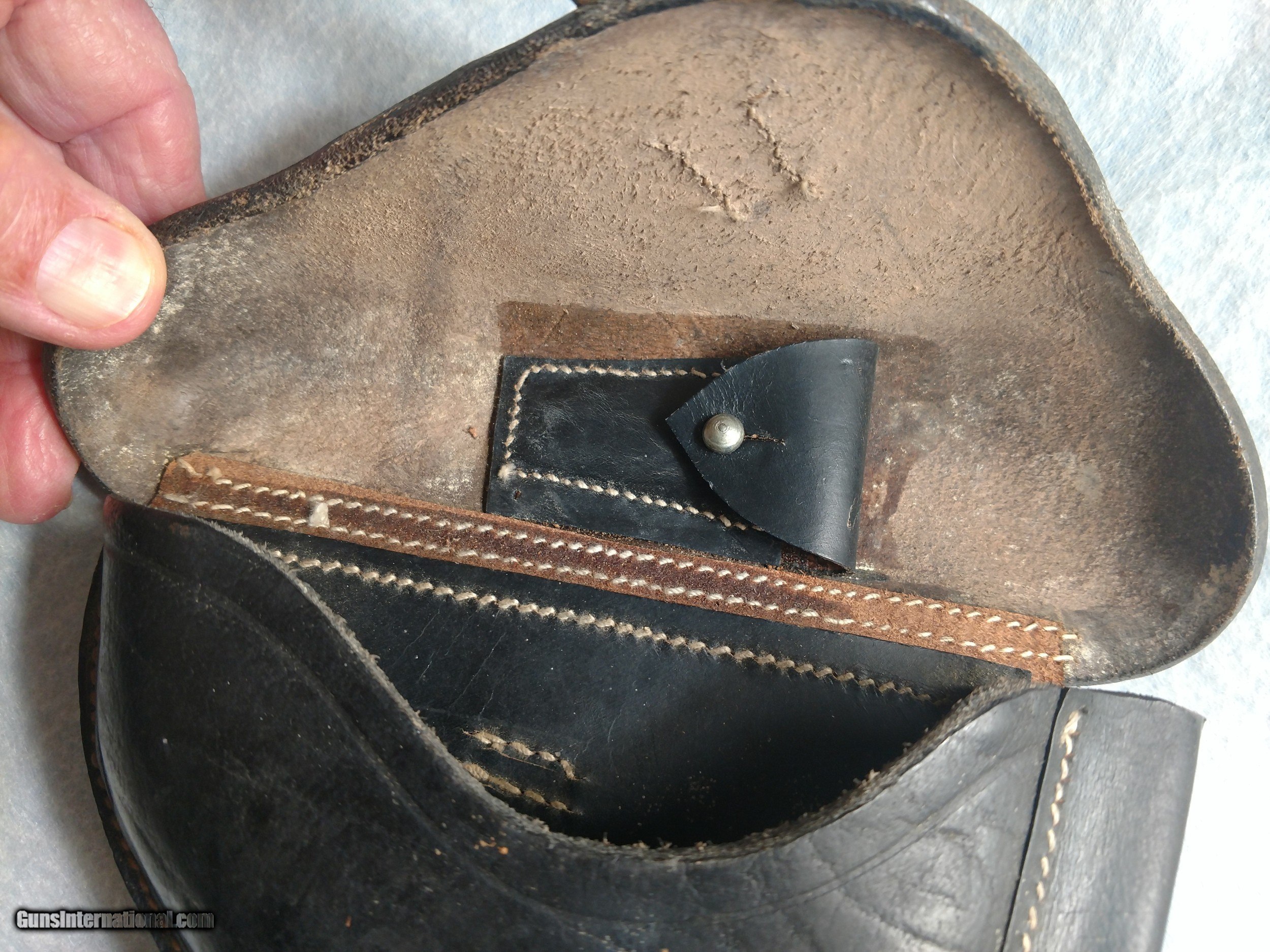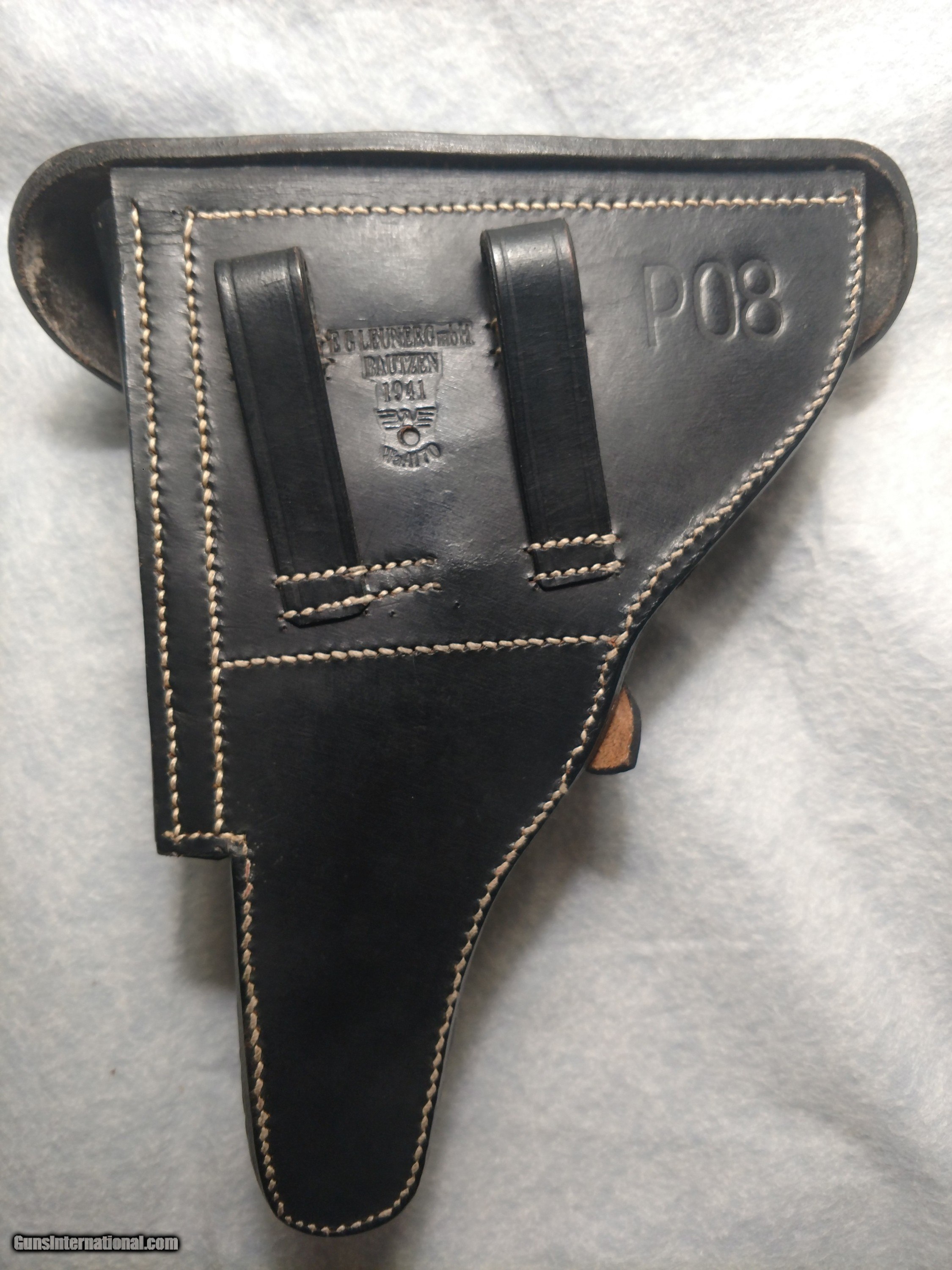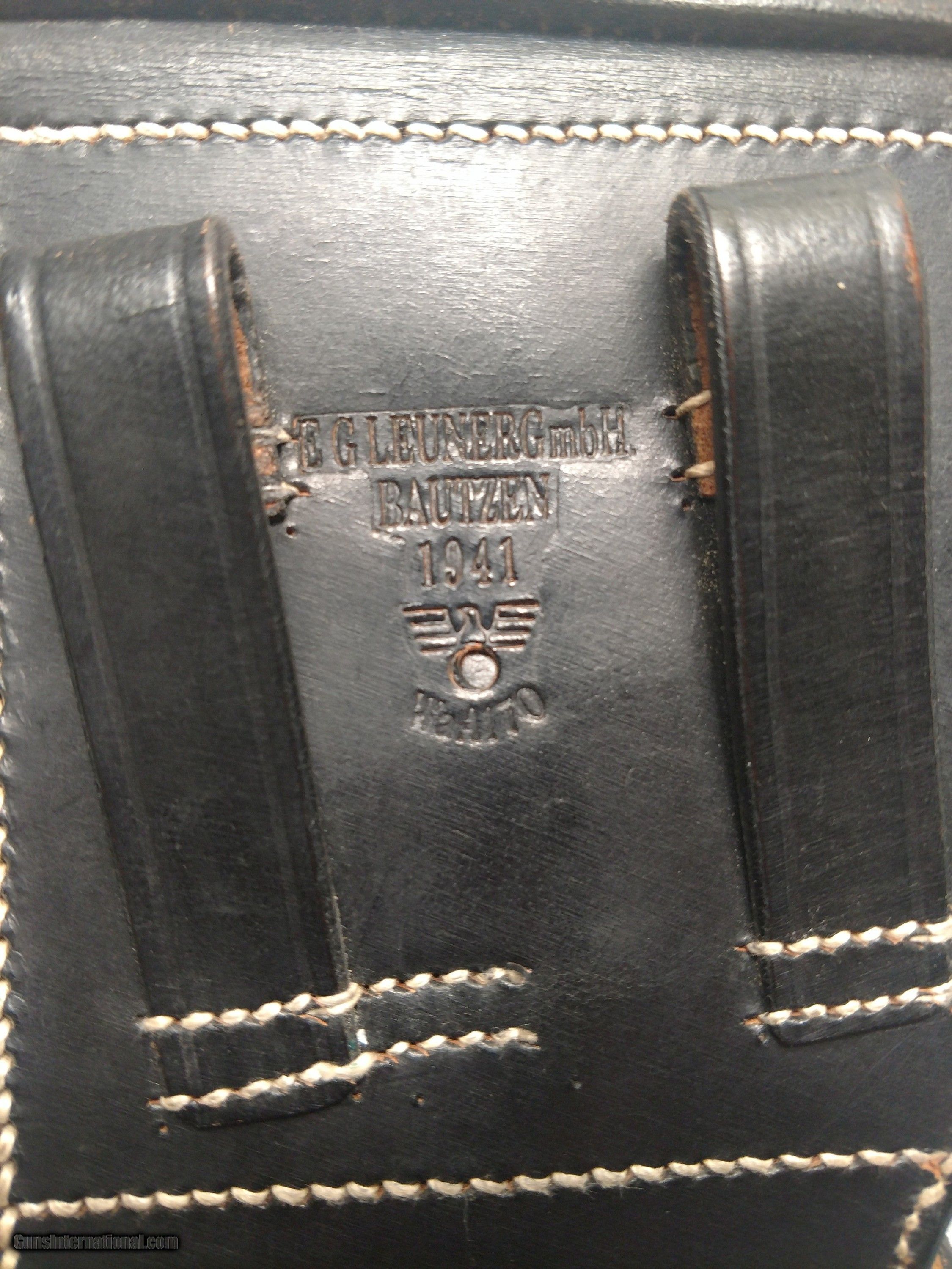Description: EGLEUNERG MbH black P08 leather pistol holster made in Bautzen, Germany in 1941, appears to be all original (no evidence of repairs) and in incredibly nice overall condition, no cracks, no missing stitches complete with parts pouch and exterior magazine holster. Truly an unusual, rare find. The hand drawn picture highlights the printing and stamped insignia. The price is $550 delivered to your home or office. Text or call me at 318-780-4242 if you are interested. SOLD |