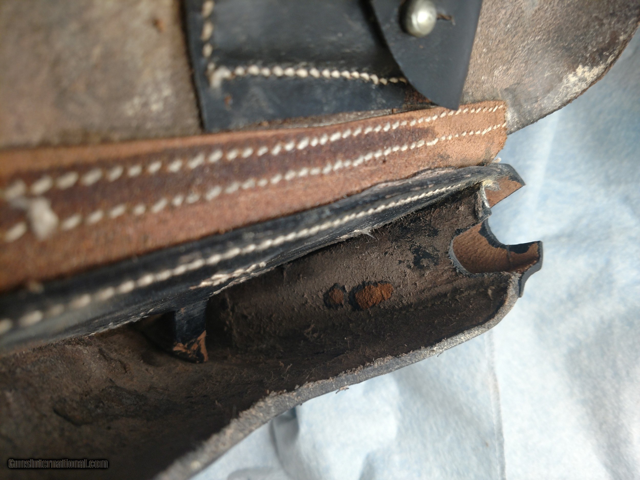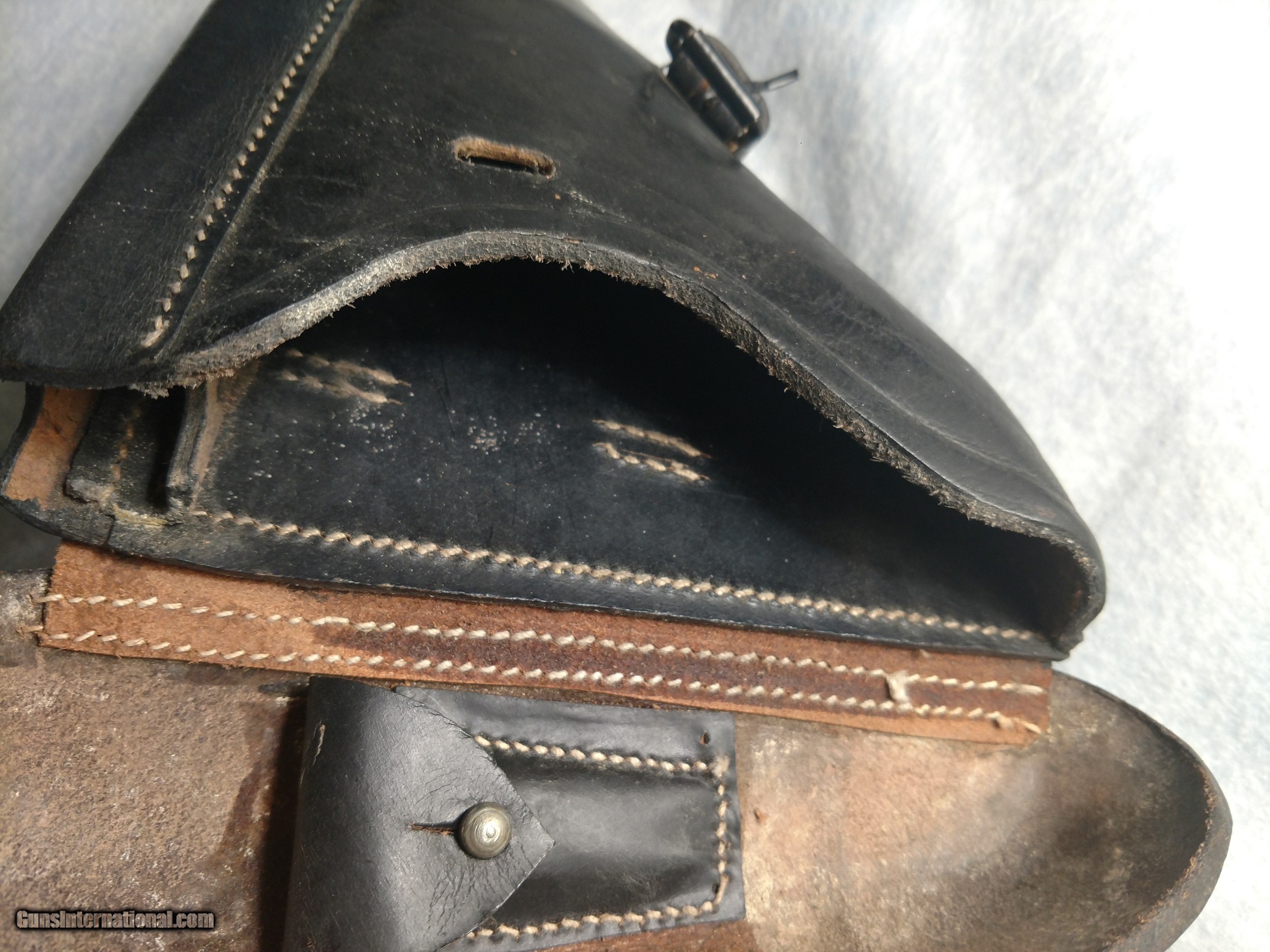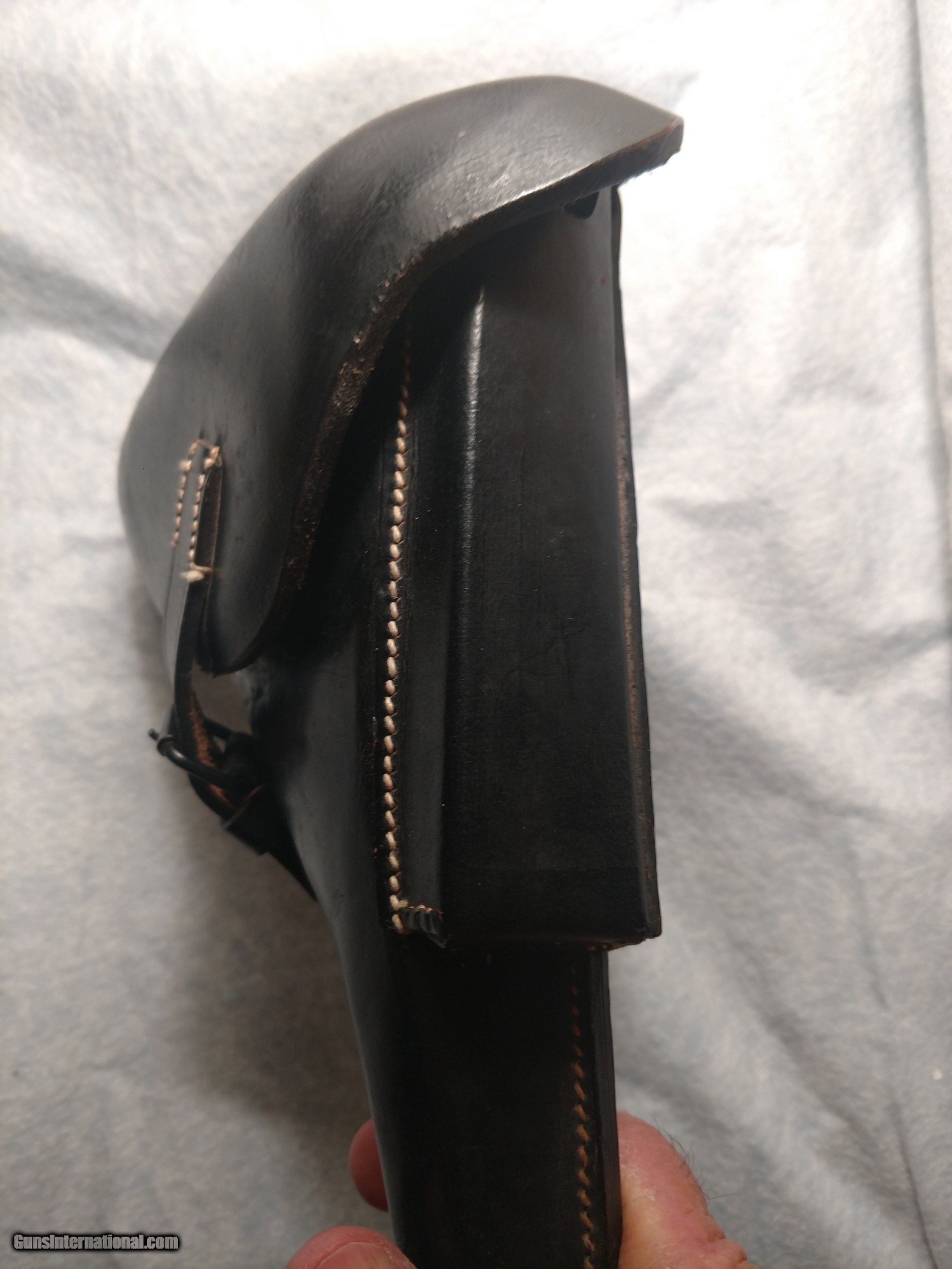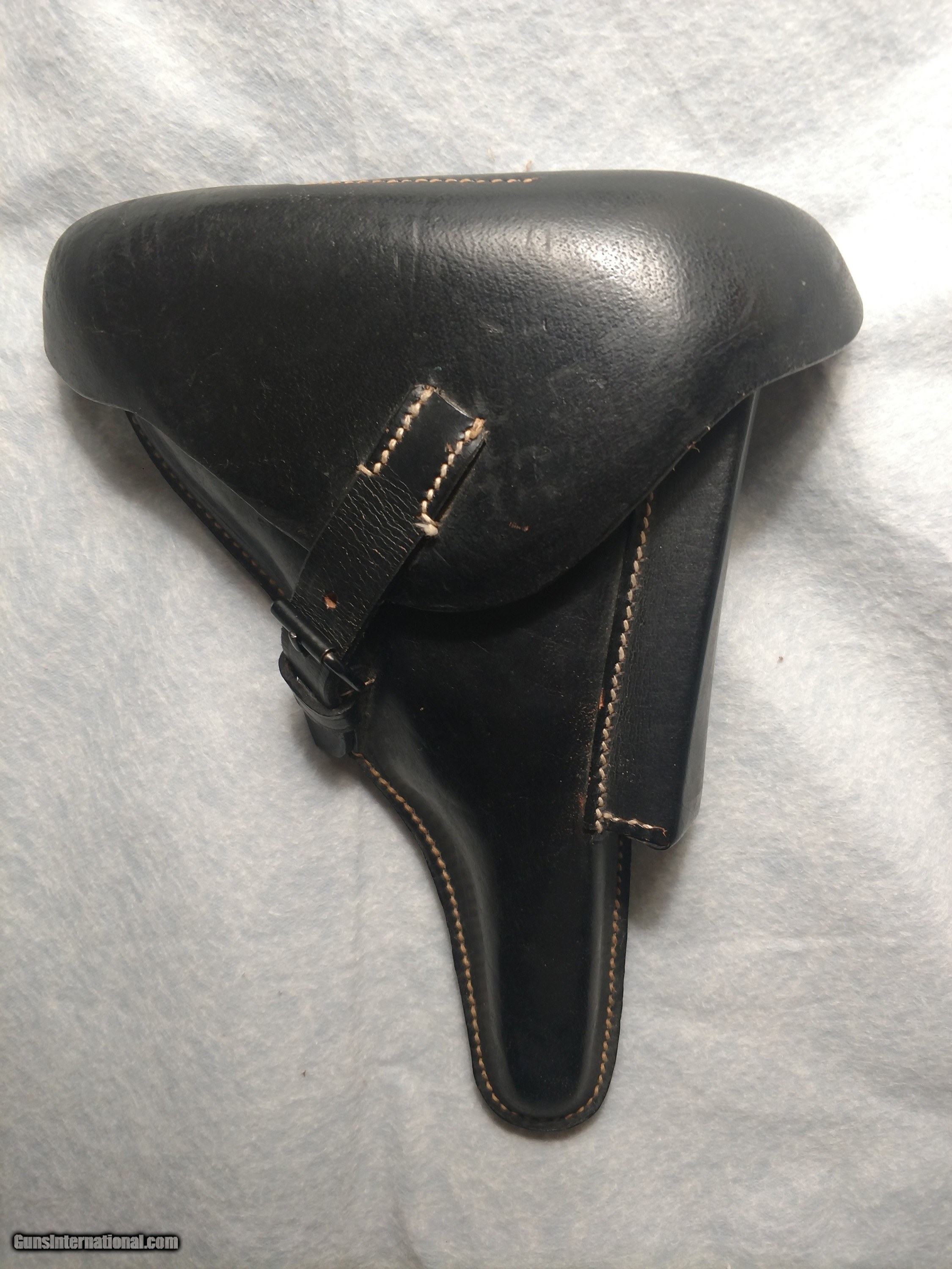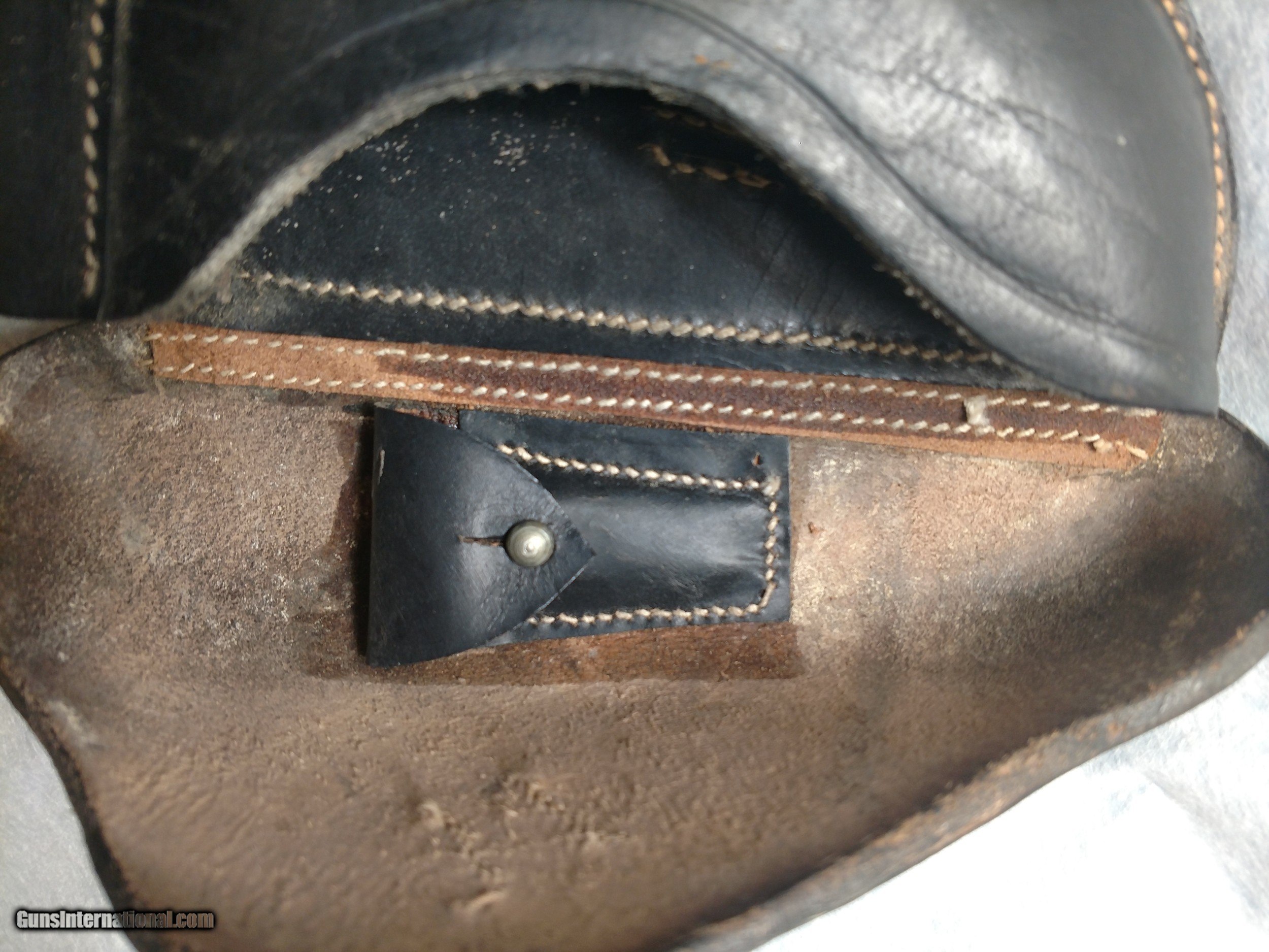 Description: EGLEUNERG MbH black P08 leather pistol holster made in Bautzen, Germany in 1941, appears to be all original (no evidence of repairs) and in incredibly nice overall condition, no cracks, no missing stitches complete with parts pouch and exterior magazine holster. Truly an unusual, rare find. The hand drawn picture highlights the printing and stamped insignia. The price is $550 delivered to your home or office. Text or call me at 318-780-4242 if you are interested. SOLD |
