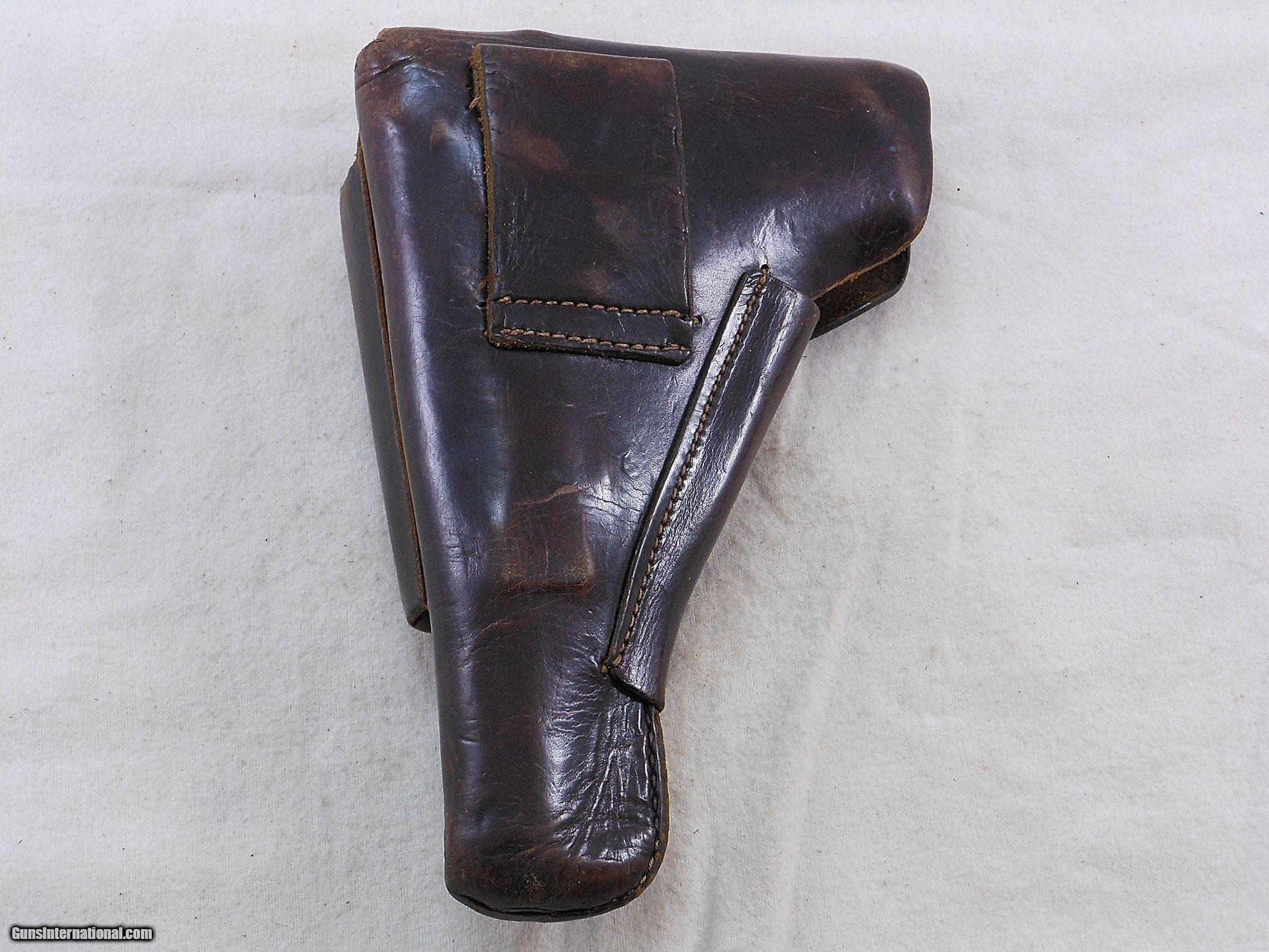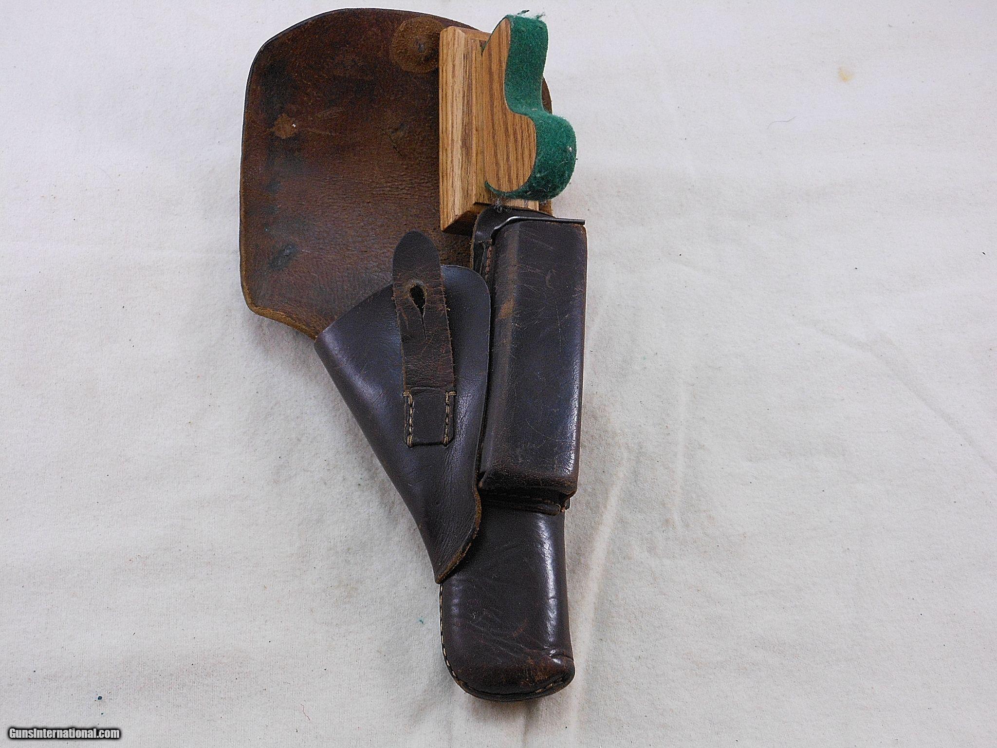 Description: This holster is dated 1944. The manufacturing code is CLG. The brown leather holster is in supple condition and servicable. The front flap had some kind of insignia attached at one time. This holster has seen service use. The magazine is a original 1935 F.N. magazine in nice condition. This is a decent military holster and magazine for a war time Browning high power pistol. Search for hlvfine guns on google. C.A.C. Consn. F. No. 267 -16 SOLD |