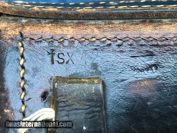 Description: For sale is one (1) German WW2 P.38 hardshell holster by Albin Scholle. Back of holster is marked "fsx 42" WaA445 and the P38 stamp. Color is black cowhide, this maker used copper rivets on the cover flap exterior plate, but only on the '42 hardshells. Copper rivets are scarce on hardshell P.38 holsters. On the flap interior, are 2 faint green stamps, but no longer legible. Lift strap is present and secure to the holster. Left belt strap on back has a stiching repair to the top, and probably from wartime as to the appearance of age of the thread. Right belt loop top stitching has pulled out, but is still present with no repairs attempted. Front exterior has a weathered look on the closing lid and some of that look on the lower body. The back still has good color and a less worn look than front. Back perimeter stitching is all original and is tight. Front body and magazine pouch stitching is all original and tight. For sale in lower 48 states USA. Shipping included. Bank MO, USPS MO, personal check fine but will hold to clears. SOLD |