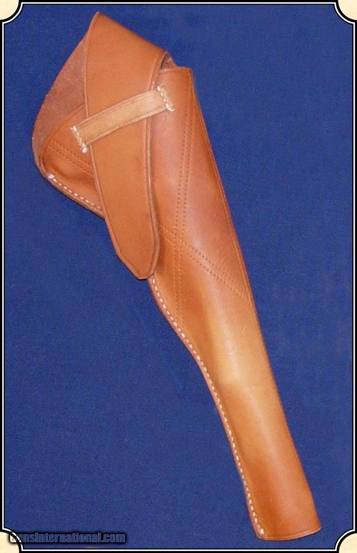 Description: Half Flap Holster. The sleek contour of this holster makes it one or the most attractive holsters styles ever made. This was a popular civilian style of the 1860's and 1870's. Contoured fit with open toe. Made of light weight leather as the original, with the stitching wheel X design as on the original. Lightly oiled Russet color only. Specify Left or Right Hand draw Will fit 1851 Colt Navy, 1860 Colt Army, 1861 Colt Navy, and any Conversion there of. Will also fit 1871-72 Colt Cartridge Revolvers. Pictured here is the original holster I copied this from. PAYMENT Cash, postal money order, cashiers check, personal & business checks. May order at riverjunction on-line with credit cards or PayPal. SOLD |