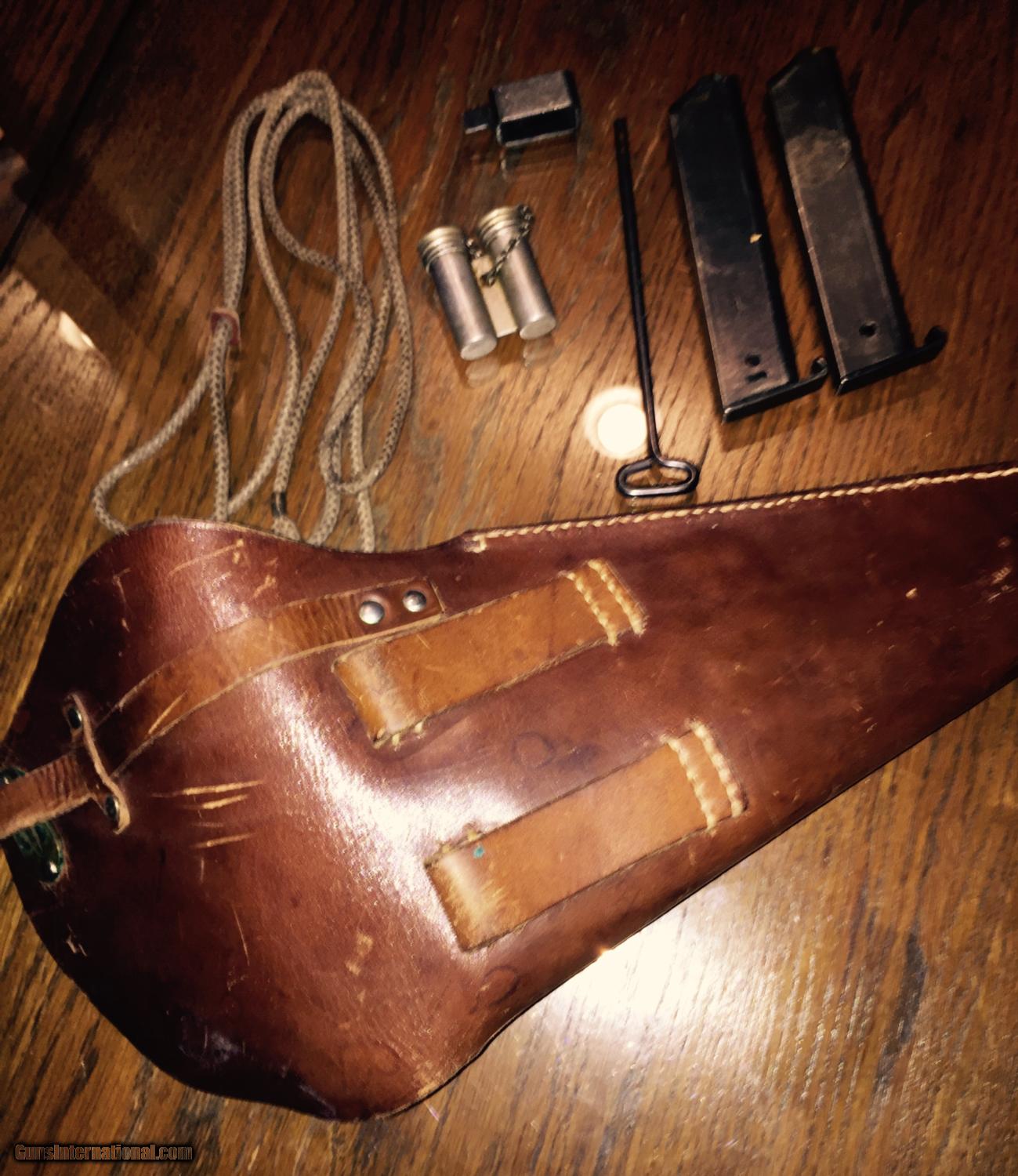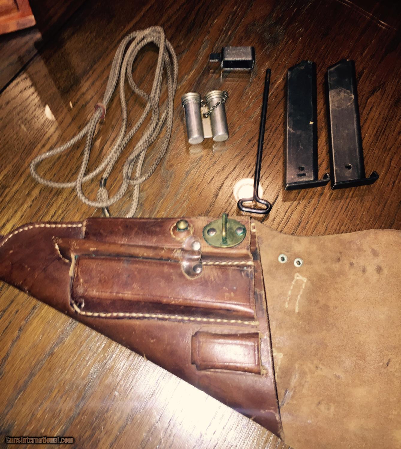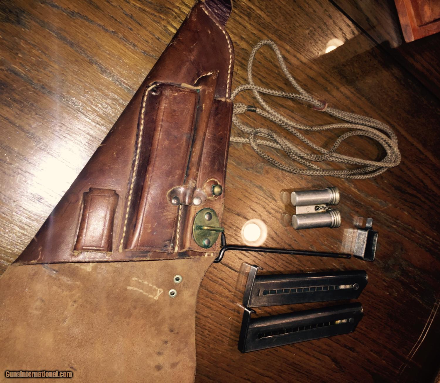 Description: Full rig - includes two original magazines - loading tool - cleaning rod - oiler - lanyard cord -all Original in excellent condition leather holster. Dearlers are expecting $50 to $200.00 more than what I am asking - I am a long time collector. SOLD |