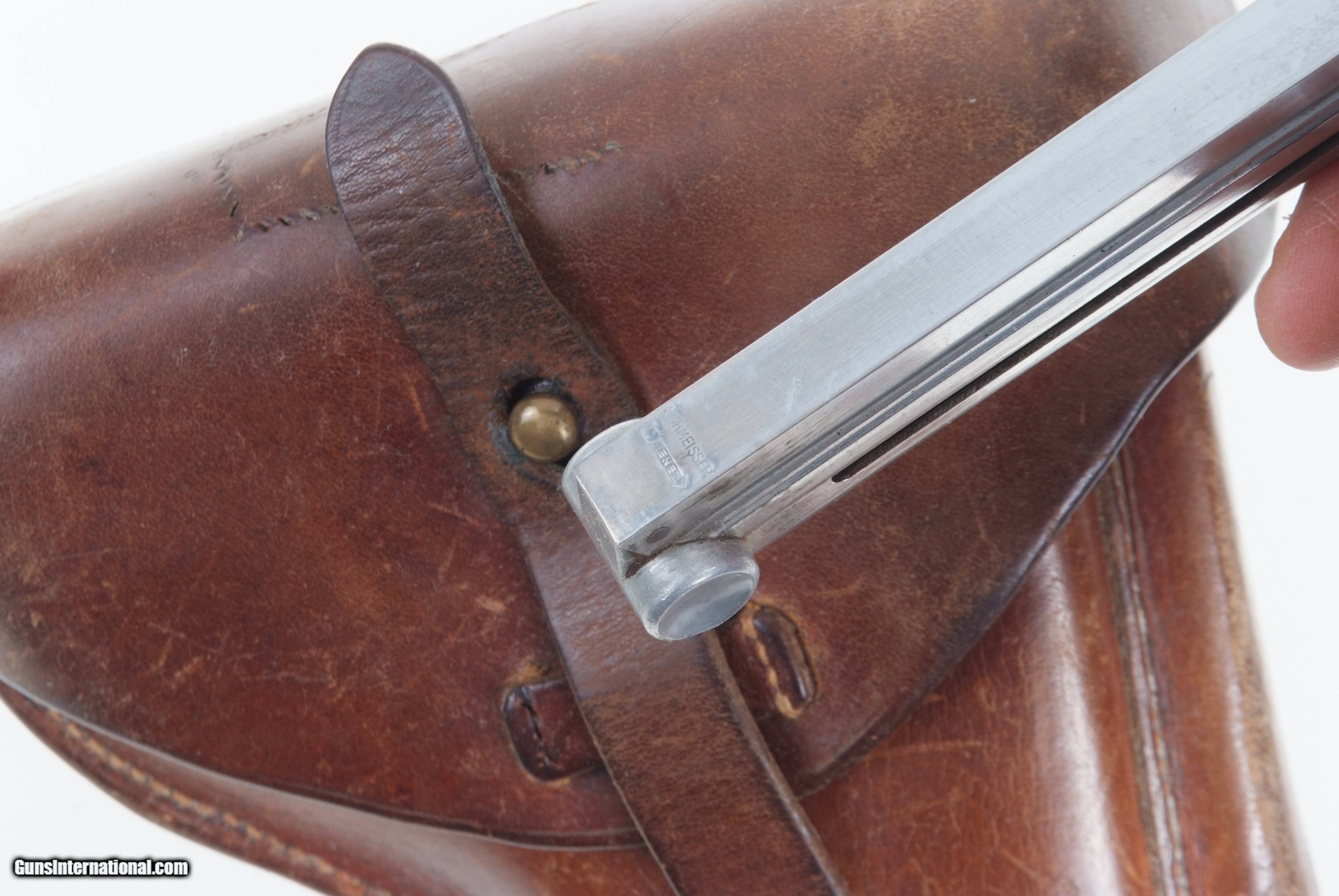 Description: The holster shows reworking with the obverse marking L.Mg. 192. having been crossed out and replaced with “3319” that has been applied to the second matching magazine that has also been marked with a large “2” on the left side of the base. The forward belt loop is a period replacement. There are several areas of torn/missing stitching including over the strap hold down loop and across the top of the lid. No takedown tool. Synopsis: Attractive brown Police Luger holster, dated 1929, made by R. Larsen/Berlin with matching Haenel Schmeisser stainless steel magazine. Condition: VG-Excellent leather with fading and scuffs as expected from use and consistent with the reworking. Excellent matching Haenel magazine. Unusual to find a numbered holster with a matching magazine. A HISTORIC INVESTMENT! ~~Insured shipping fee of $35; most packages shipped using FedEx 2nd Day.~~ SOLD Manufacturer: R. Larsen/Berlin |