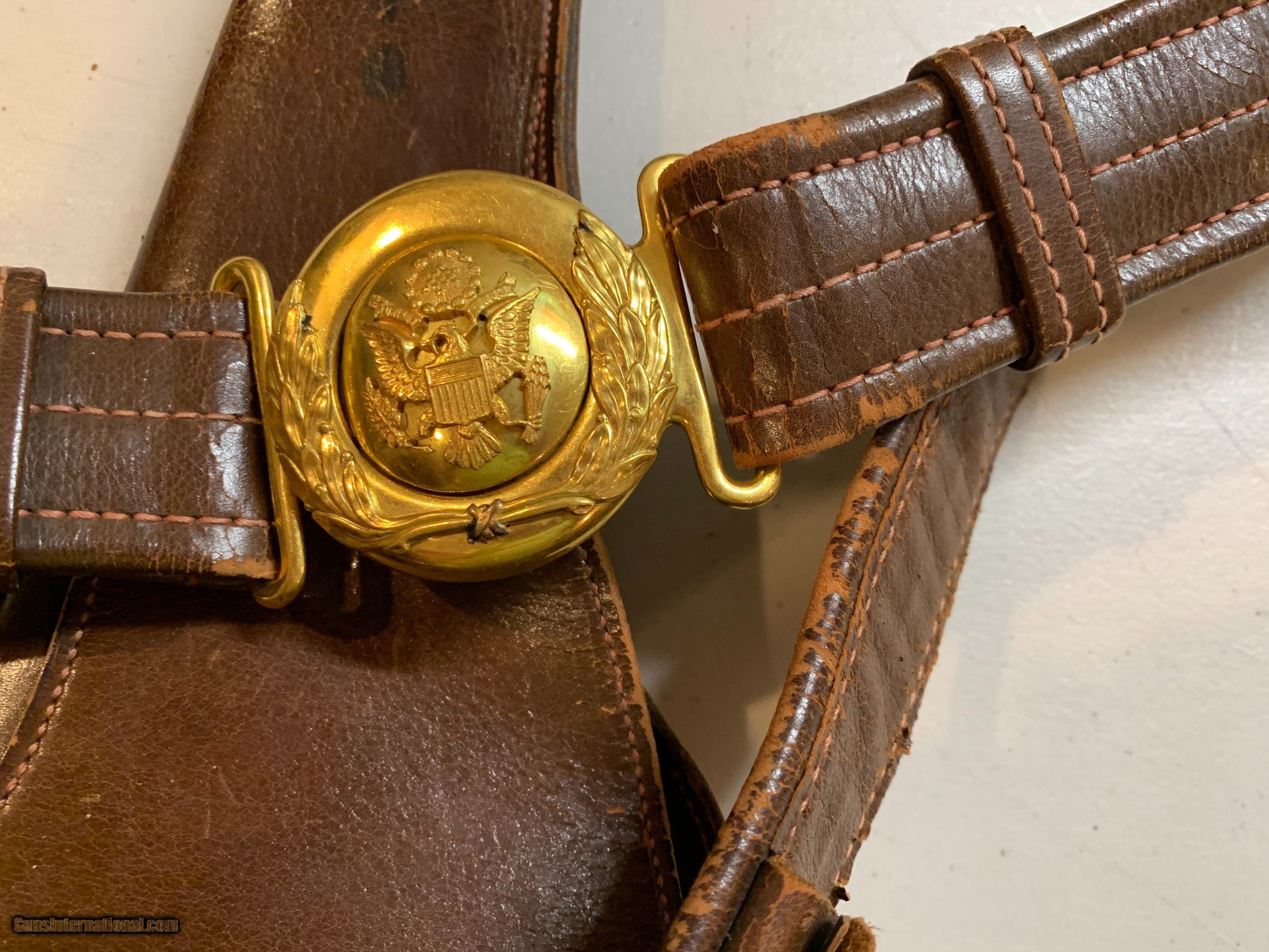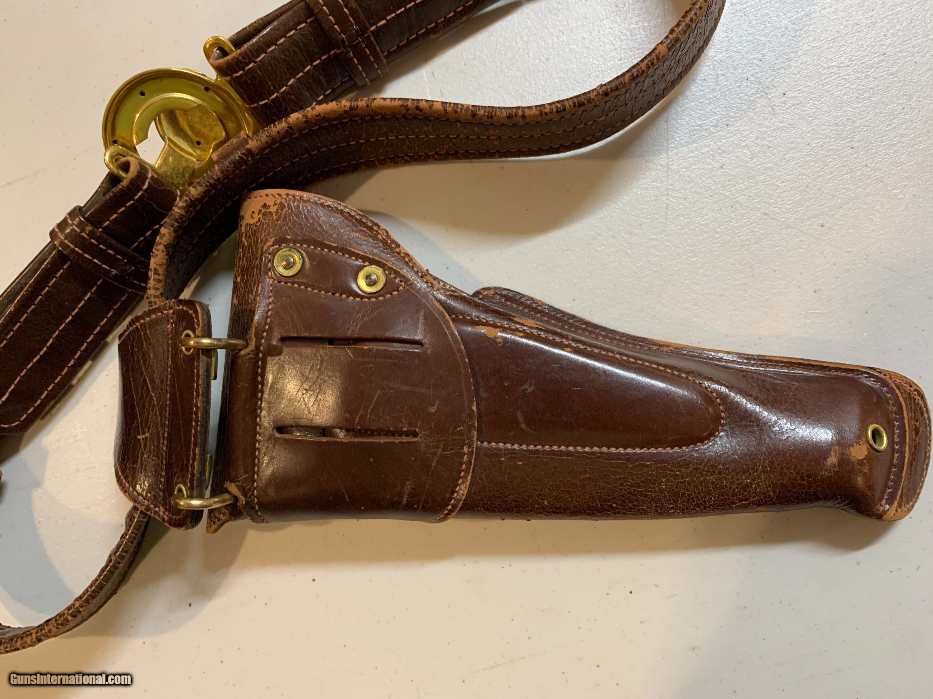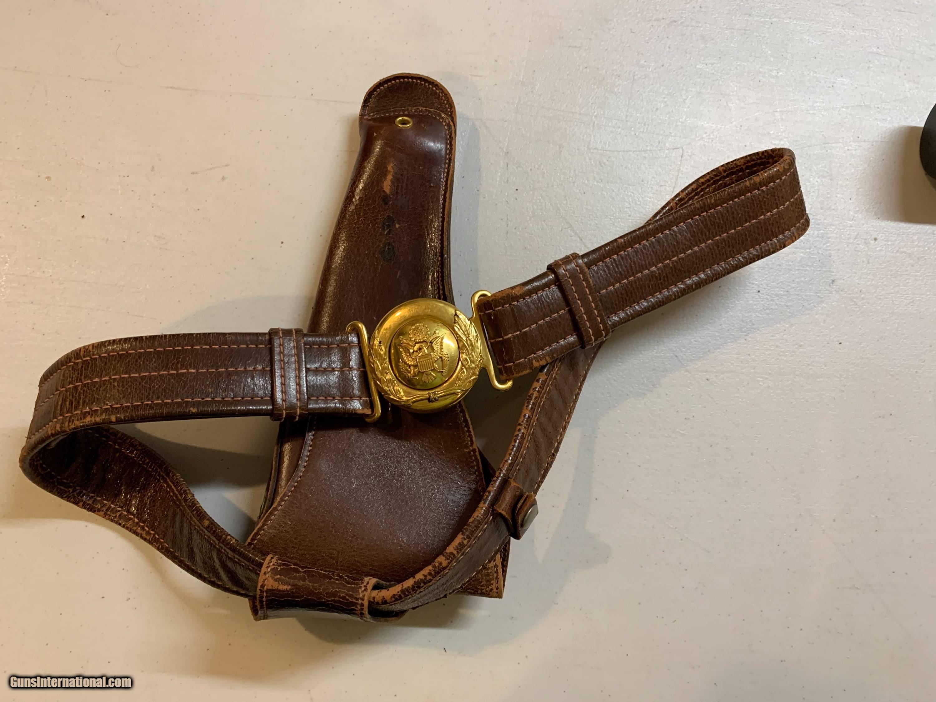 Description: Brown leather holster with heavy brass buckle, heraldic eagle on buckle. Leather is soft. 38". SOLD |