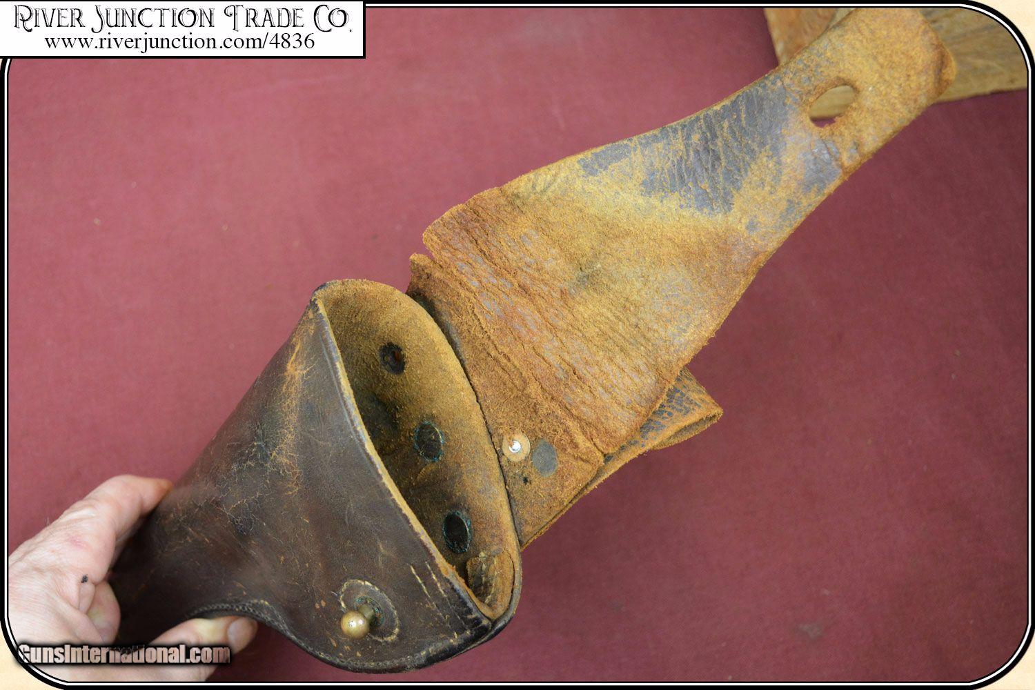 Description: Army holster for a large frame double action Colt or Smith & Wesson. This holster is in modified fair condition. There is a good chance this holster saw service in the Spanish-American War or went to Mexico with Pershing's men in pursuit of Pancho Villa. The holster is constructed of high quality leather with crazing. All stitching is intact and the bottom plug is tightly sewn in. It has a half flap with brass button. The button is intact and functions as it should. The belt loop has been replaced by US marked belt hook. This holster would be most suitable for display with a early period Military revolver. Payment Cash, postal money order, cashiers check, personal & business checks. Can be ordered with a credit card or paypal at wxx.riverjunction,cxx just type in the number 4836 in the search box. SOLD |