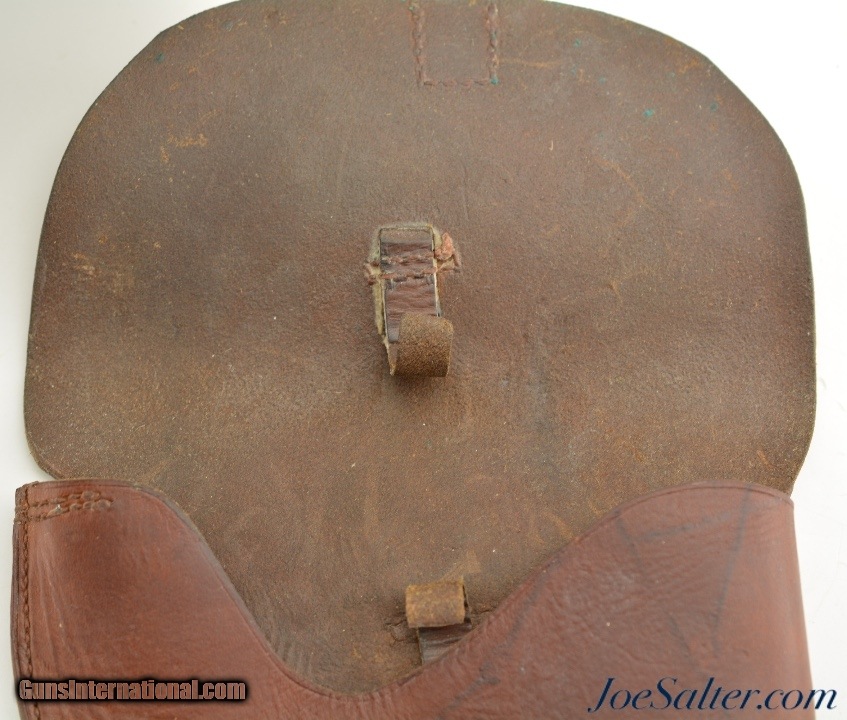 Description: This is an original Norwegian WWI/II M1914 Colt 1911 Holster in brown. The holster is in excellent condition with supple leather and tight stitching, slight verdigris on the hardware, only blemish is the internal pull up strap is worn through. This example is unmarked with a single belt loop, these were made with two loop, many colors and marked. On the back near the loop it is marked with an owners name "Arnt Kasrod". This is a great example of a not often seen 1911 holster. SOLD |