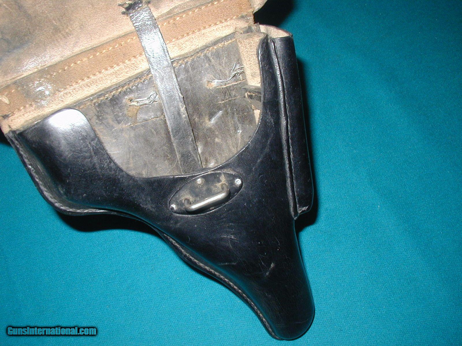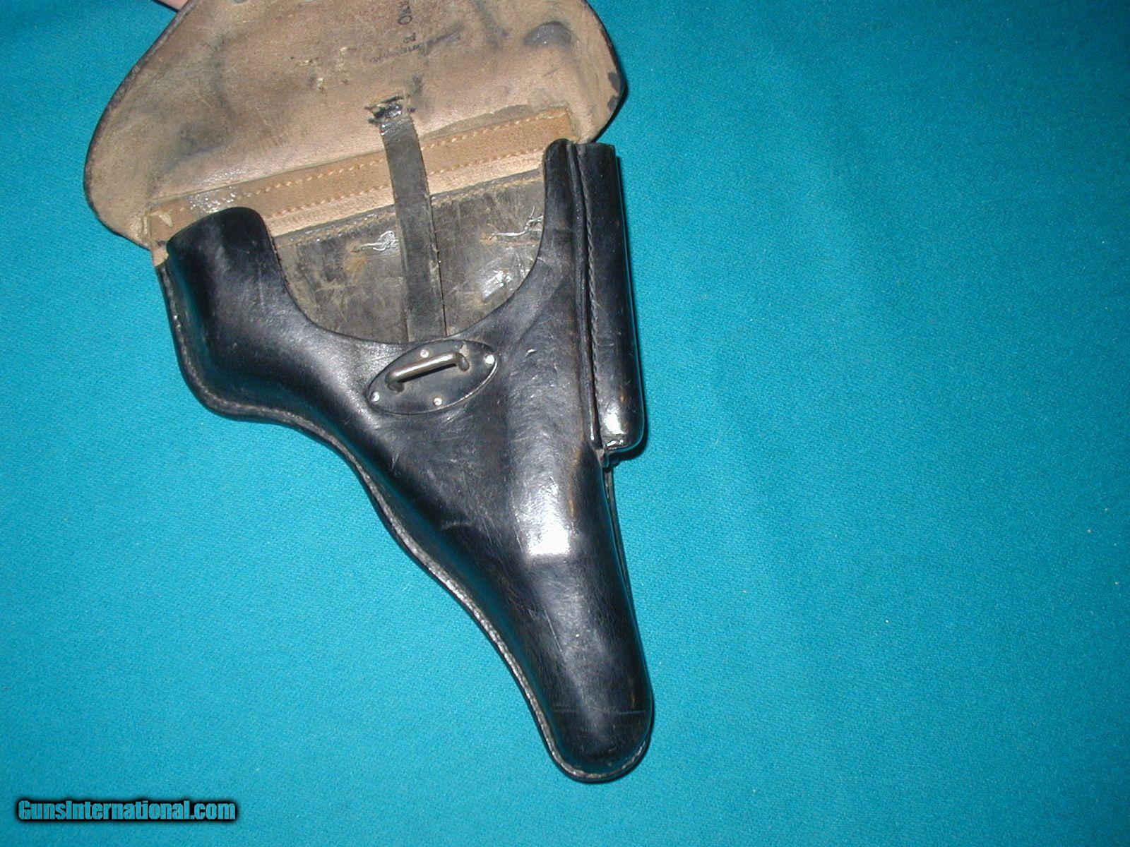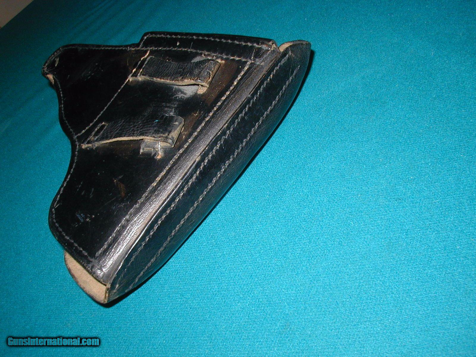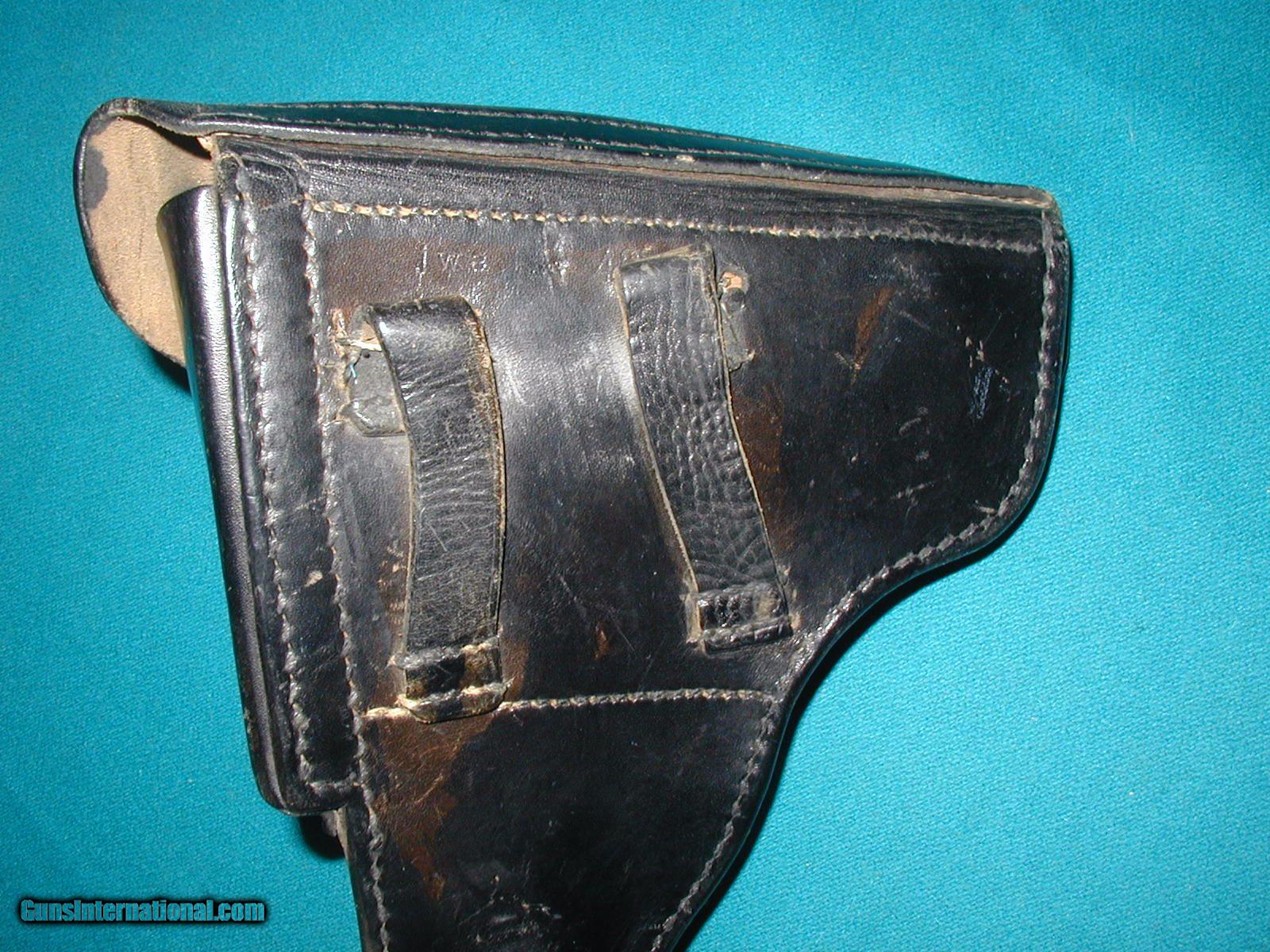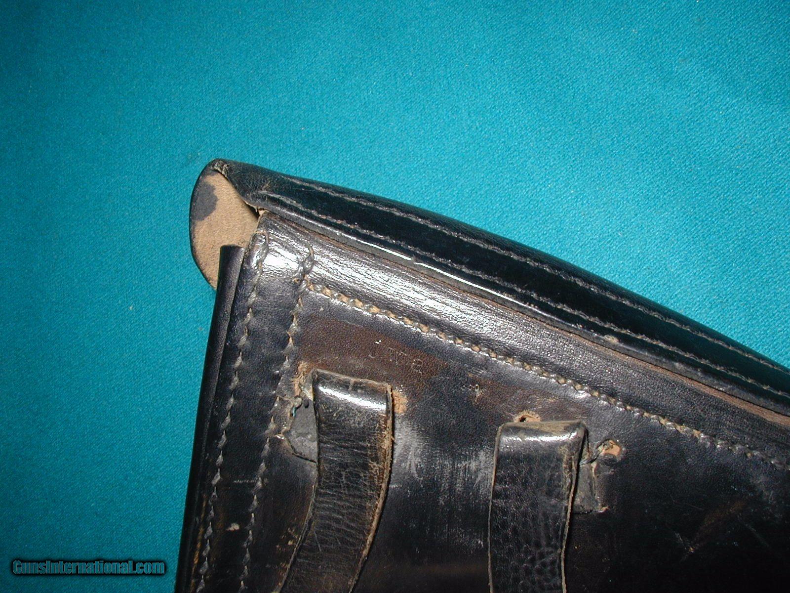 Description: THIS IS A VERY DECENT 1942 DATED JWA INSPECTED P-38 HOLSTER...SOLID, CLEAN, HAS A SMALL WIRE REINFORCEMENT AT TOP OF BELT LOOPS...LOOPS ARE SOLID AND STILL STITCHED ORIGINAL INTO HOLSTER...DECENT EARLY P-38 HOLSTER SOLD