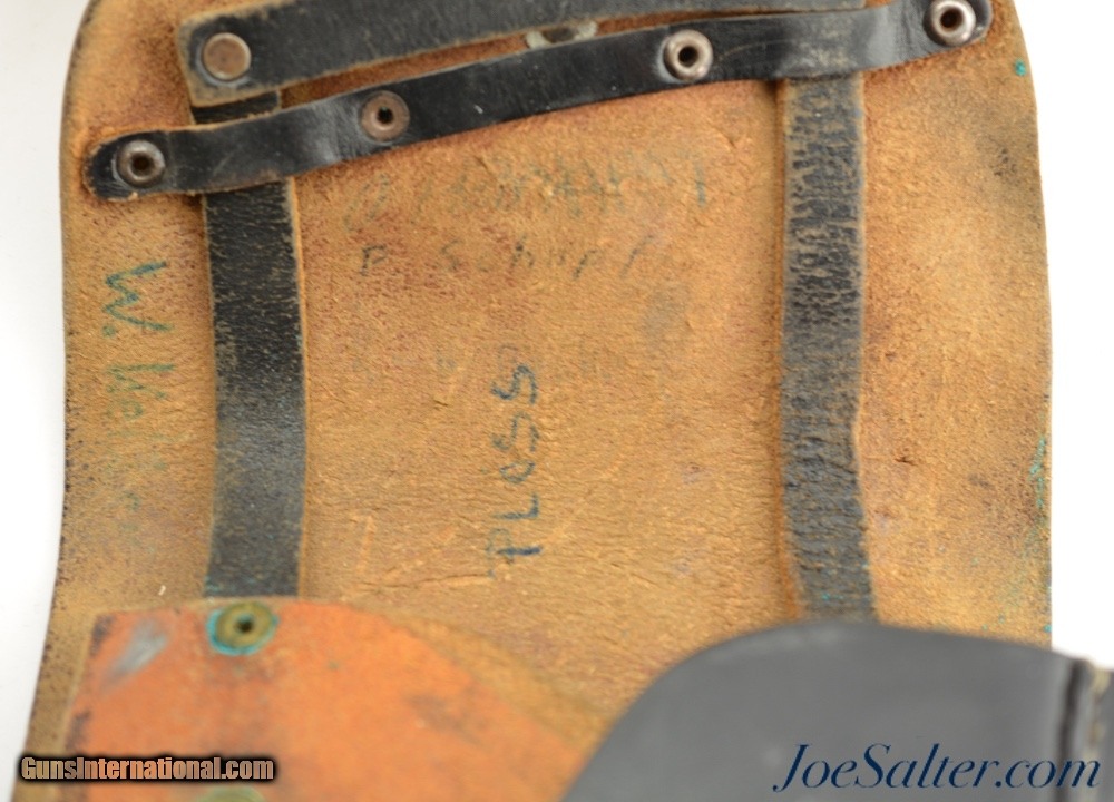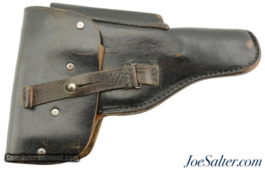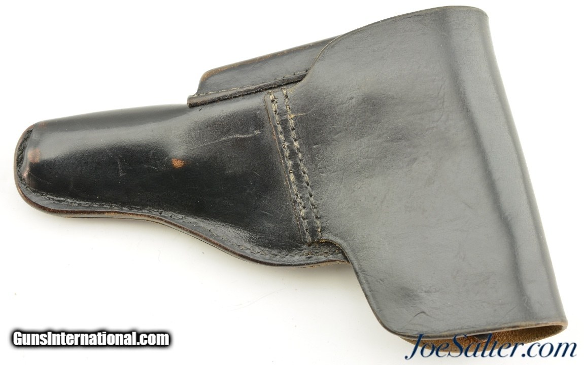 Description: This is a Post-War Walther P-38 Holster for the West German Police based on the Theuermann patent holster. It is in excellent used condition with some signs of use, tight stitching and most of the original finish. The inside is marked "PLOSS" and others that I can not make out. The maker is marked on the back side of the flap "F&B" Lots of life left in the holster. SOLD |
