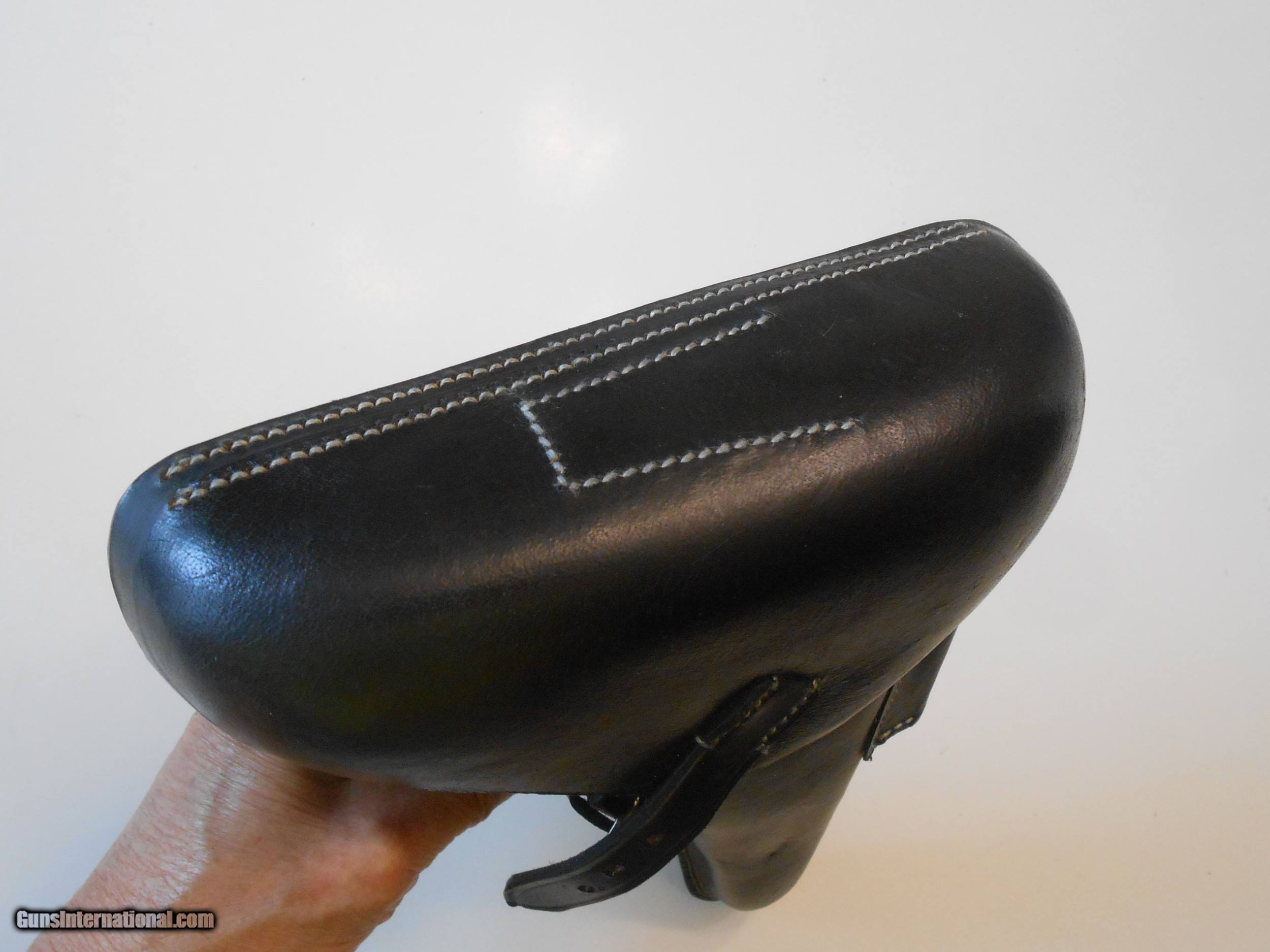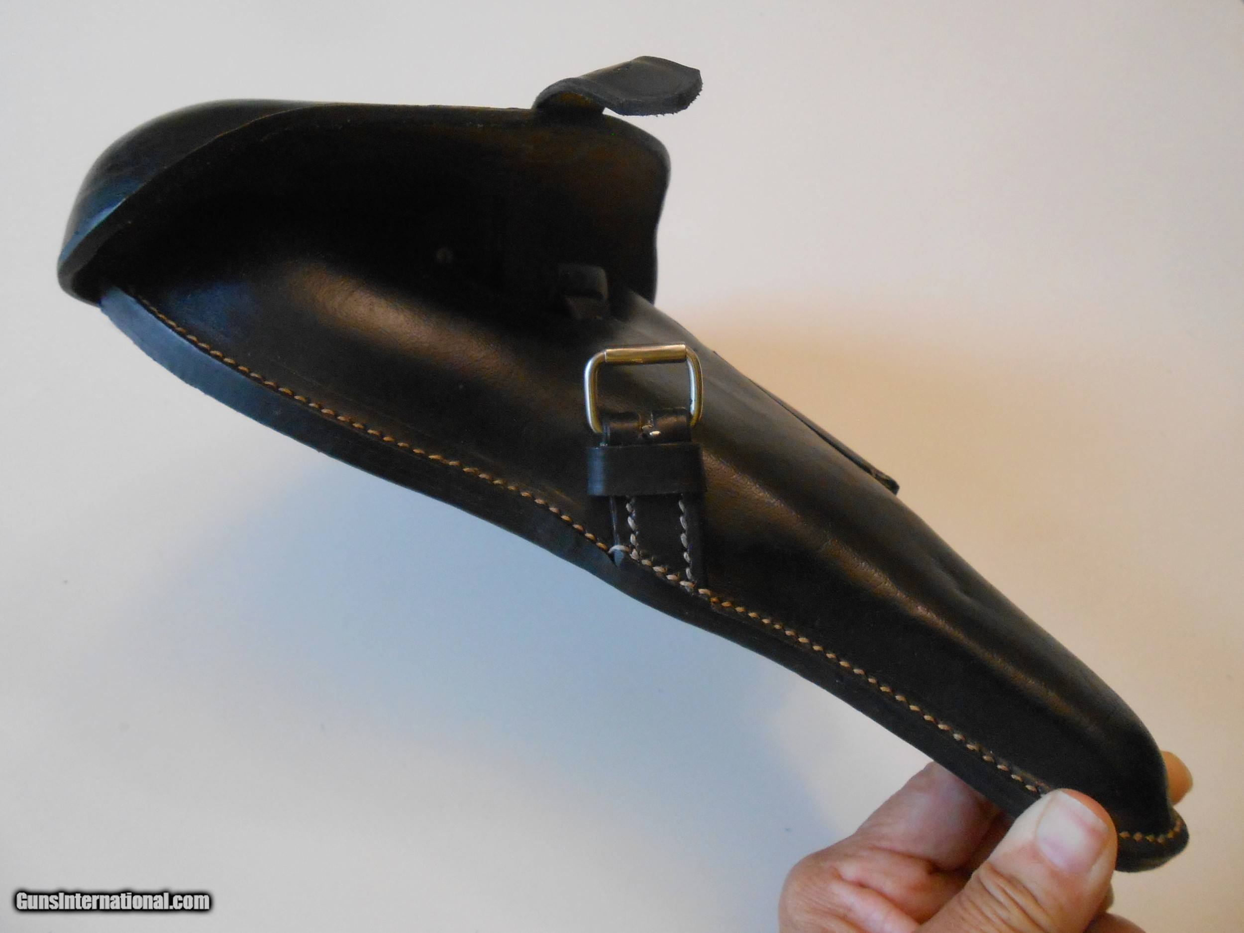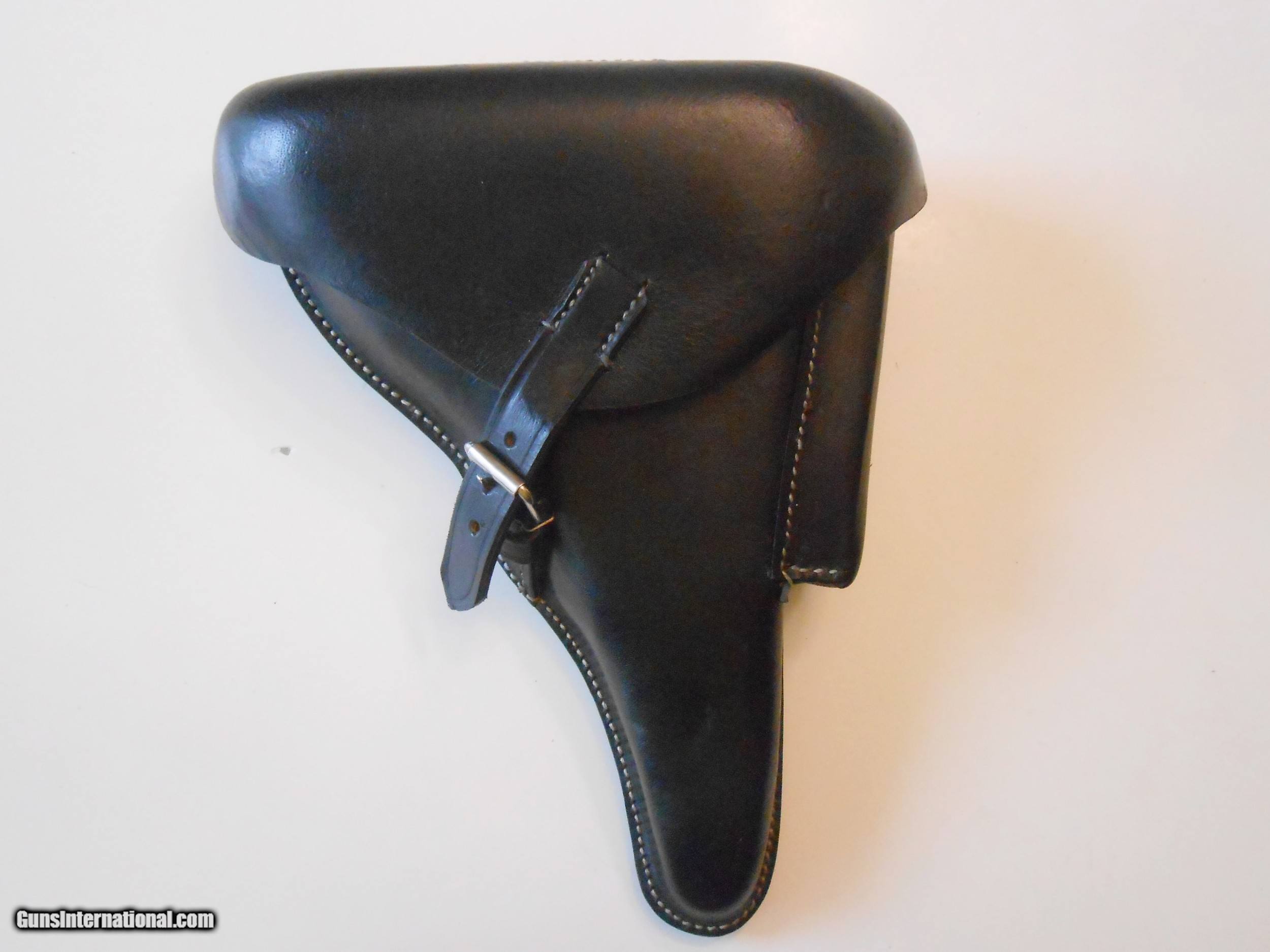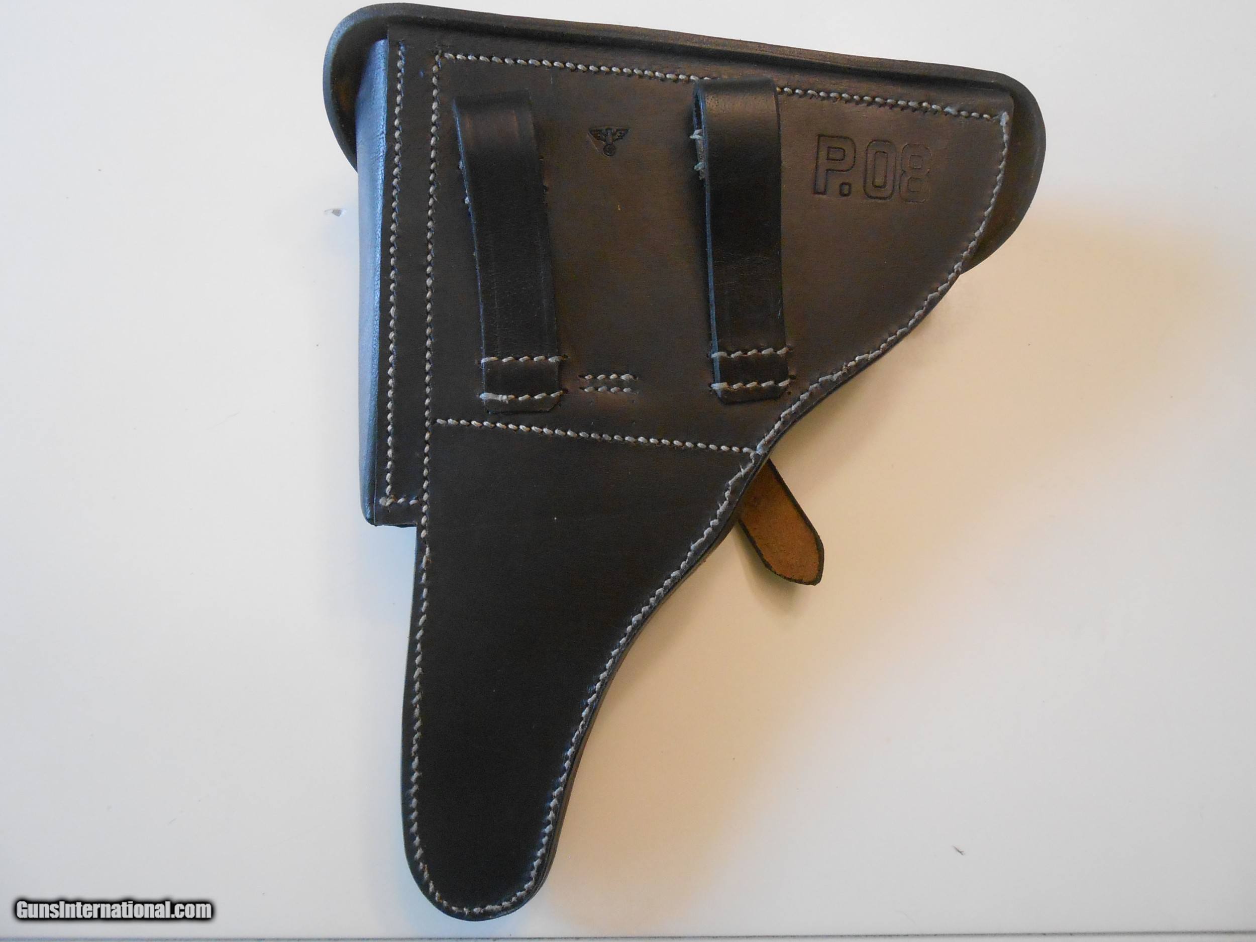 Description: THIS IS A REPRODUTION HOLSTER Thick, stiff, black leather with contrasting white stitching No scratches or scrapes Has one small dent on front (see last photo) All connections sturdy and tight Purchased second-hand, but appears to be unused. Marked on back with large P.08 and Nazi logo No maker's name For sale only in the USA Price includes shipping via USPS Priority Mail I can only accept PayPal After contact, I will email a PayPal invoice I will ship same day as payment I will email a picture of you package and your tracking number Thank you! SOLD |