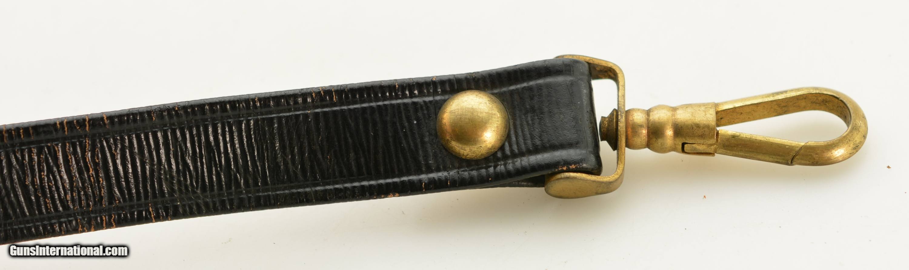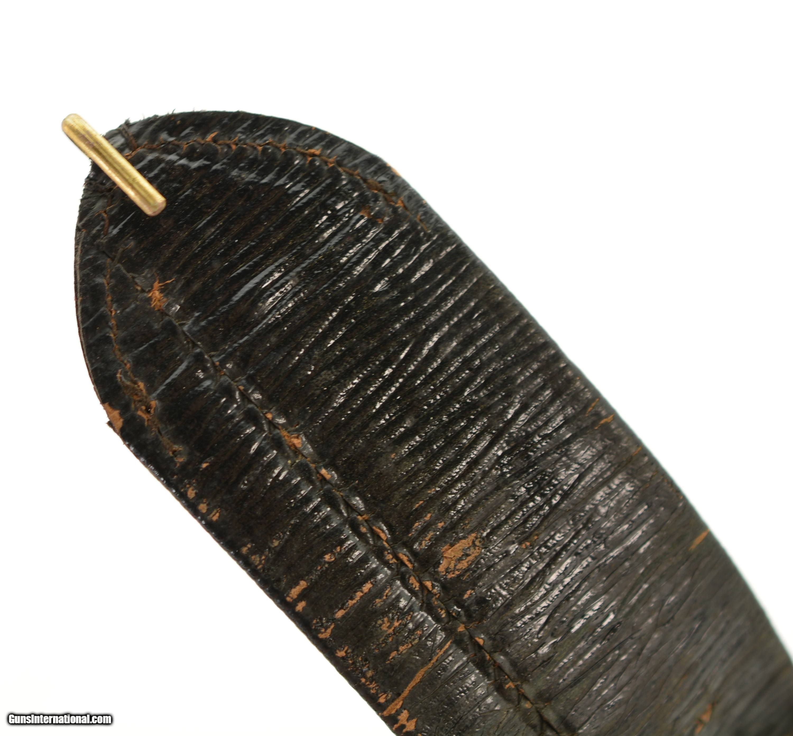 Description: This is a black, bridle leather belt of the Junior Officer 1883-1914 pattern, with two-piece gilt brass buckle with applique German silver IJN fouled anchor and cherry blossom insignia. The leather has minor crazing throughout, as well as some mild flaking on some of the edges and flex points. The sliding fob is embossed on the reverse, and the two hangers are in fine shape, with their original spring-clips still attached. This is a fine-excellent example of a fairly rare piece of WW1 era Japanese naval memorabilia, and would make a great addition to any collection. SOLD Manufacturer: Japanese Model: Sword Belt |