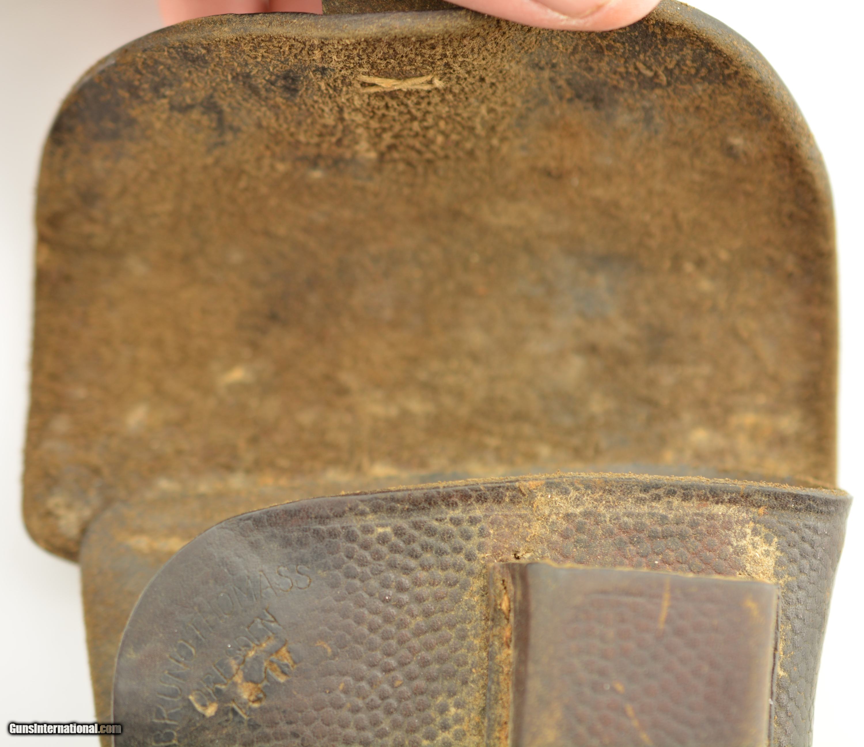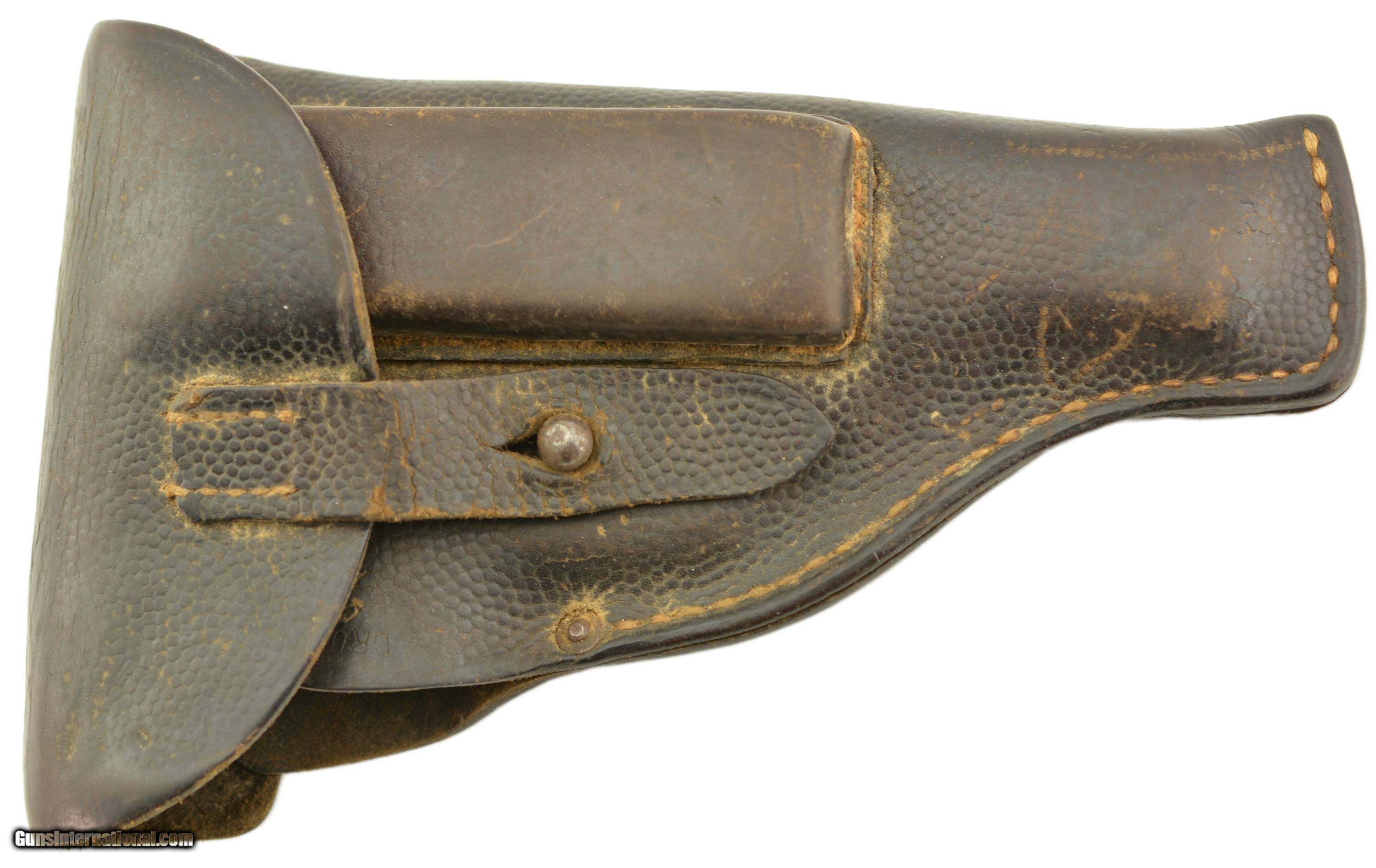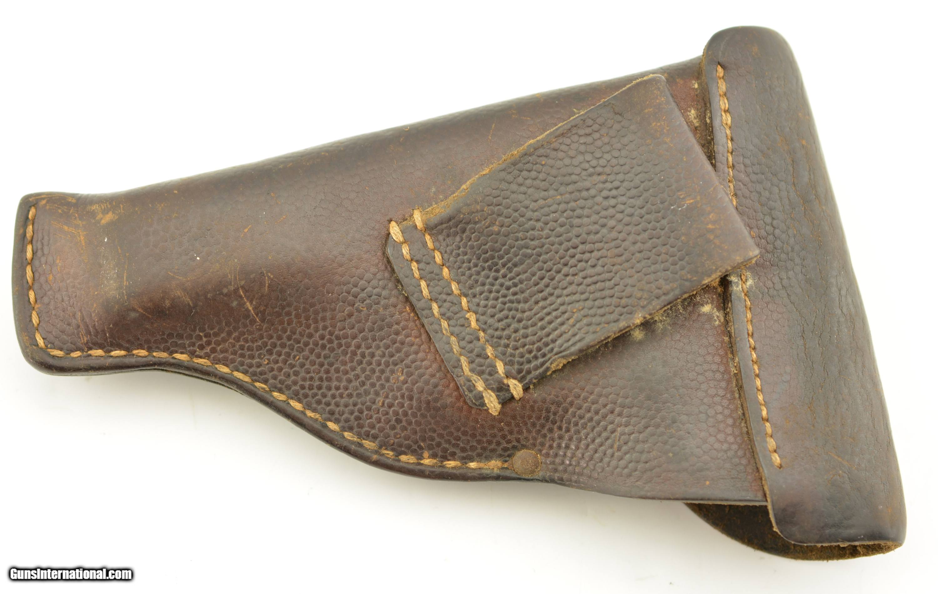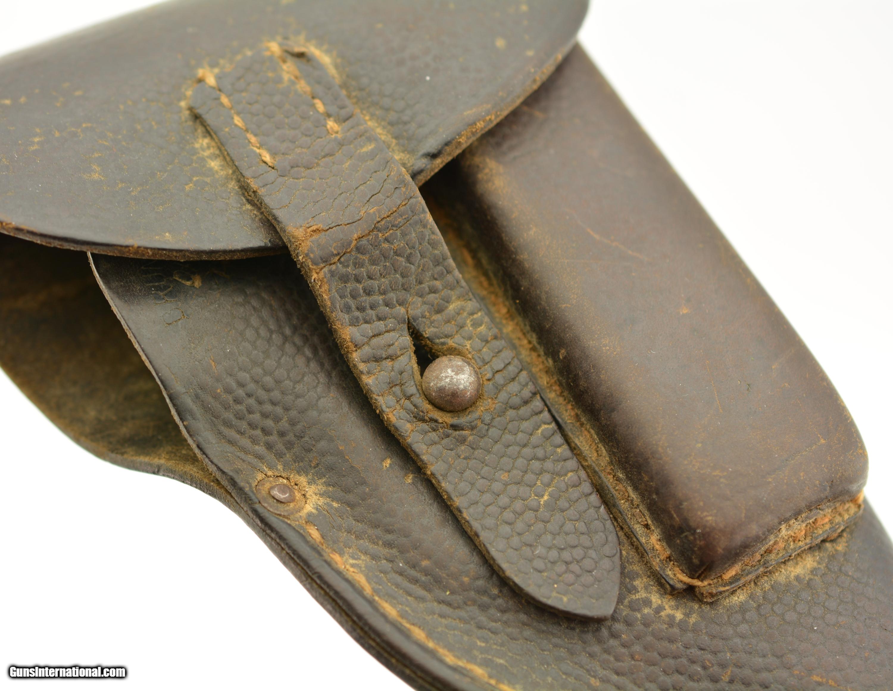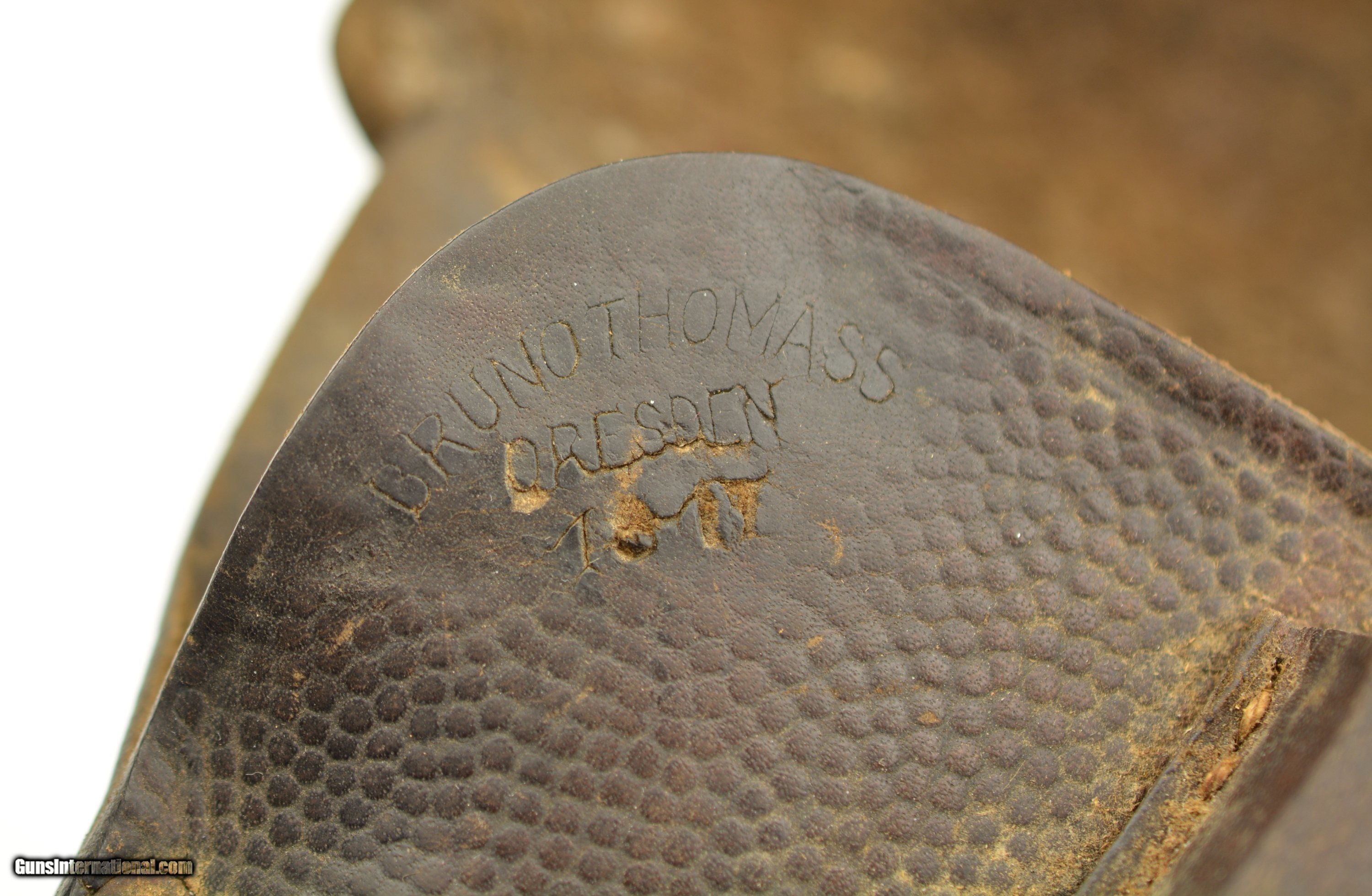 Description: This is a 1917 World War I German leather holster by Bruno Thomass of Dresden. It is for the M1914 Mauser/Walther Model 4 7.65 mm automatic pistol. Both pistols are of the same dimensions and fit nicely. The leather is marked "BRUNO THOMASS DRESDEN 1917". This holster is in excellent original condition with wonderful brown pebble finish leather, nice patina and complete tight stitching. There are some signs of use but not abuse with a few tiny scratches near the bottom. There may be additional markings on the inside of the flap but i can't make them out. This is a great holster to have in a collection or use it with any similar size pistol. SOLD Manufacturer: German Model: Holster |