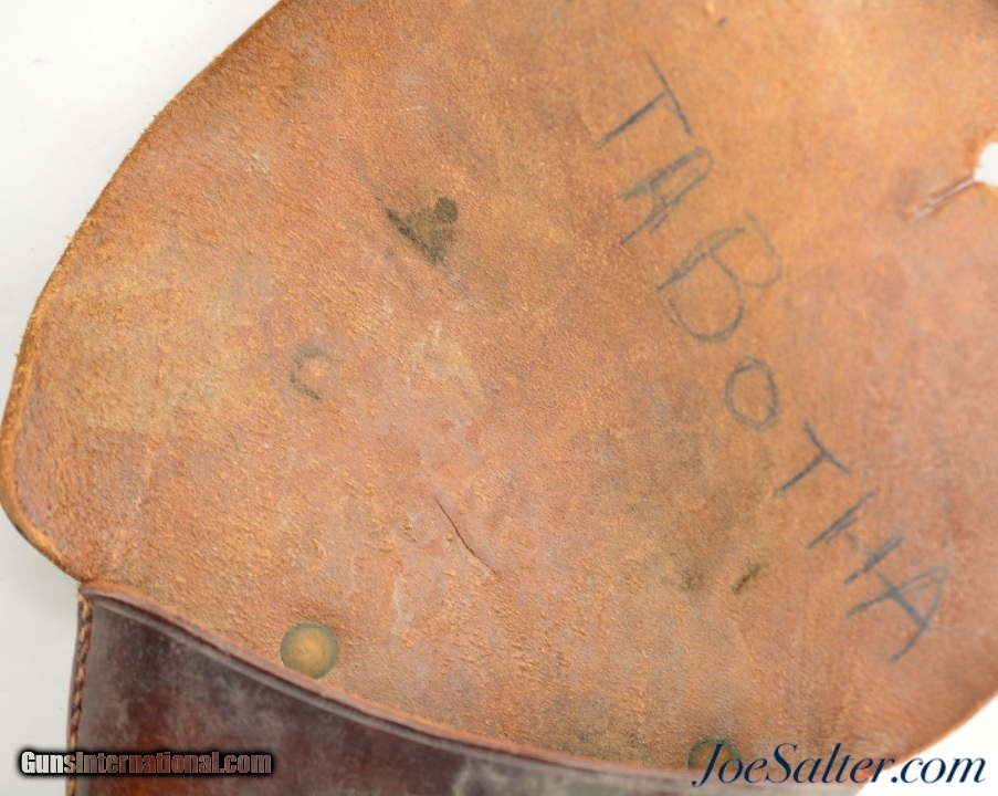 Description: This leather military holster appears to have been built for the 4" Webley MK 5 revolver. Excellent leather showing normal issue and usage marks. This may have been a South African built piece as it was built with an open bottom. In addition there is a name on the flap T.A. Botha .; SOLD |