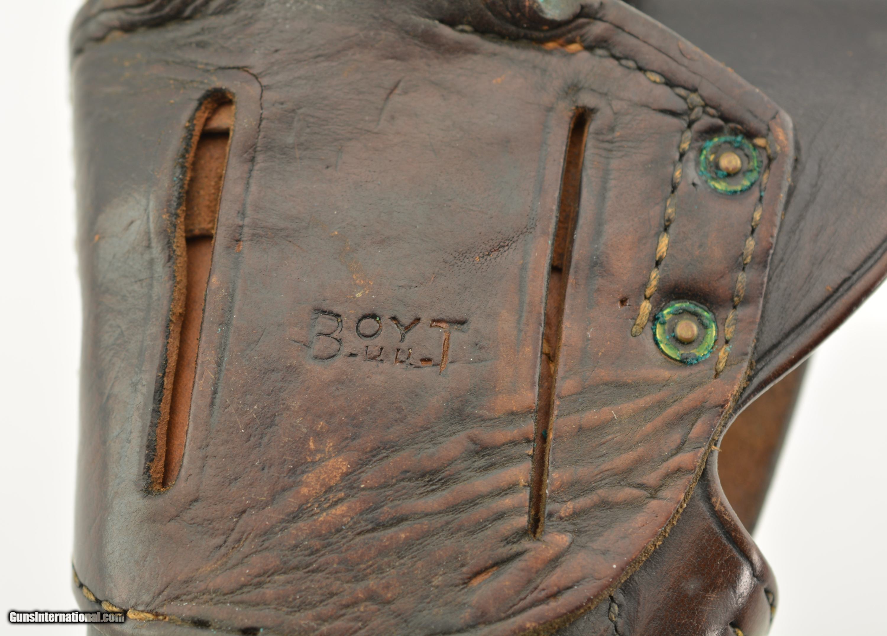 Description: Original U.S. WWII M1916 .45 BOYT 1944 Dated Black Leather Holster. Nice original BOYT 44 marked M1916 holster in very nice condition black leather. No major damage to the leather, all stitches still intact, all brass parts still present with mild verdigris. Also has the original leather belt hanger. The inside flap is inscribed “MLDRING Sept 19 1945". A nice WW2 piece. SOLD Manufacturer: US Military Model: Holster |
