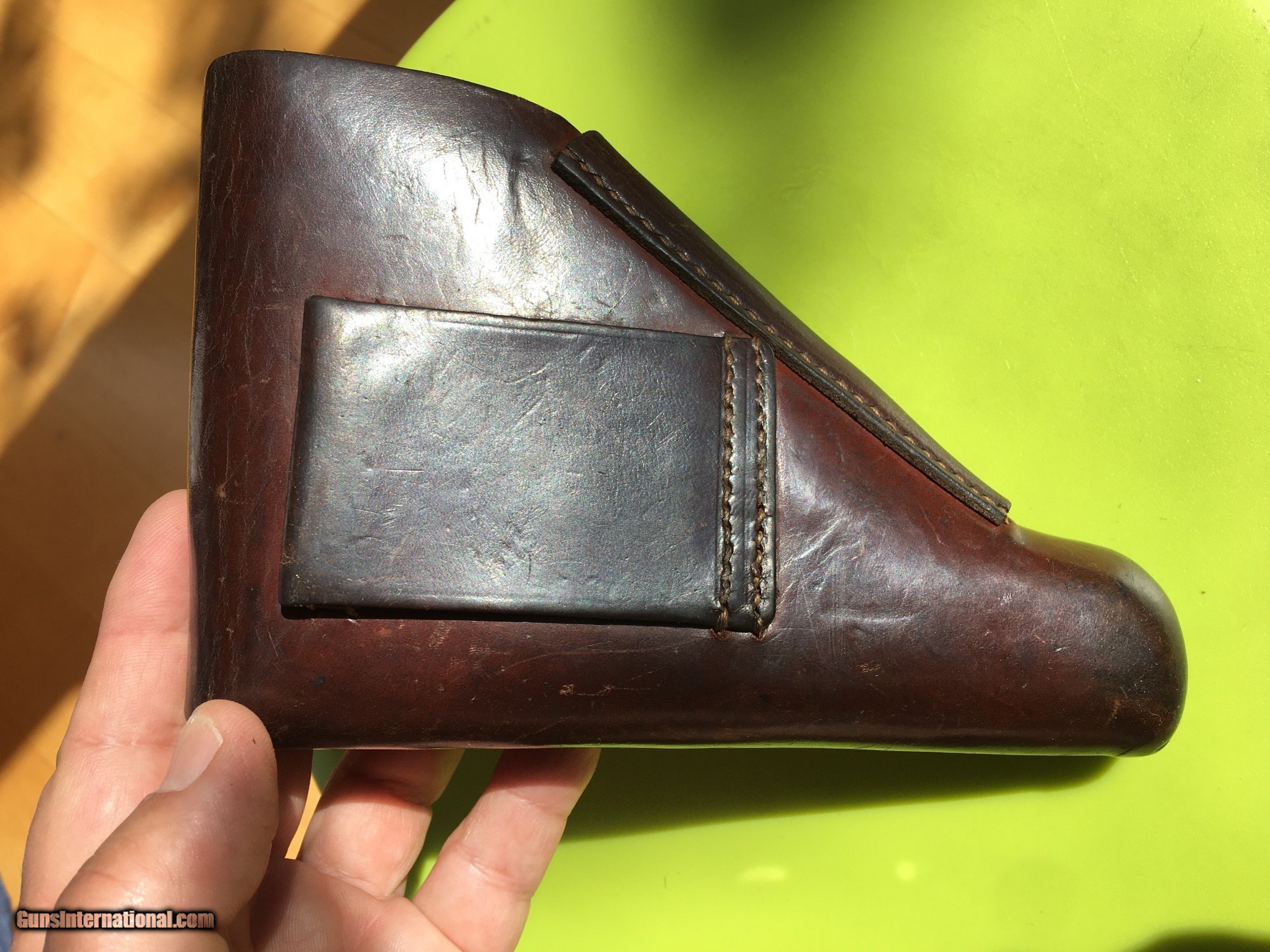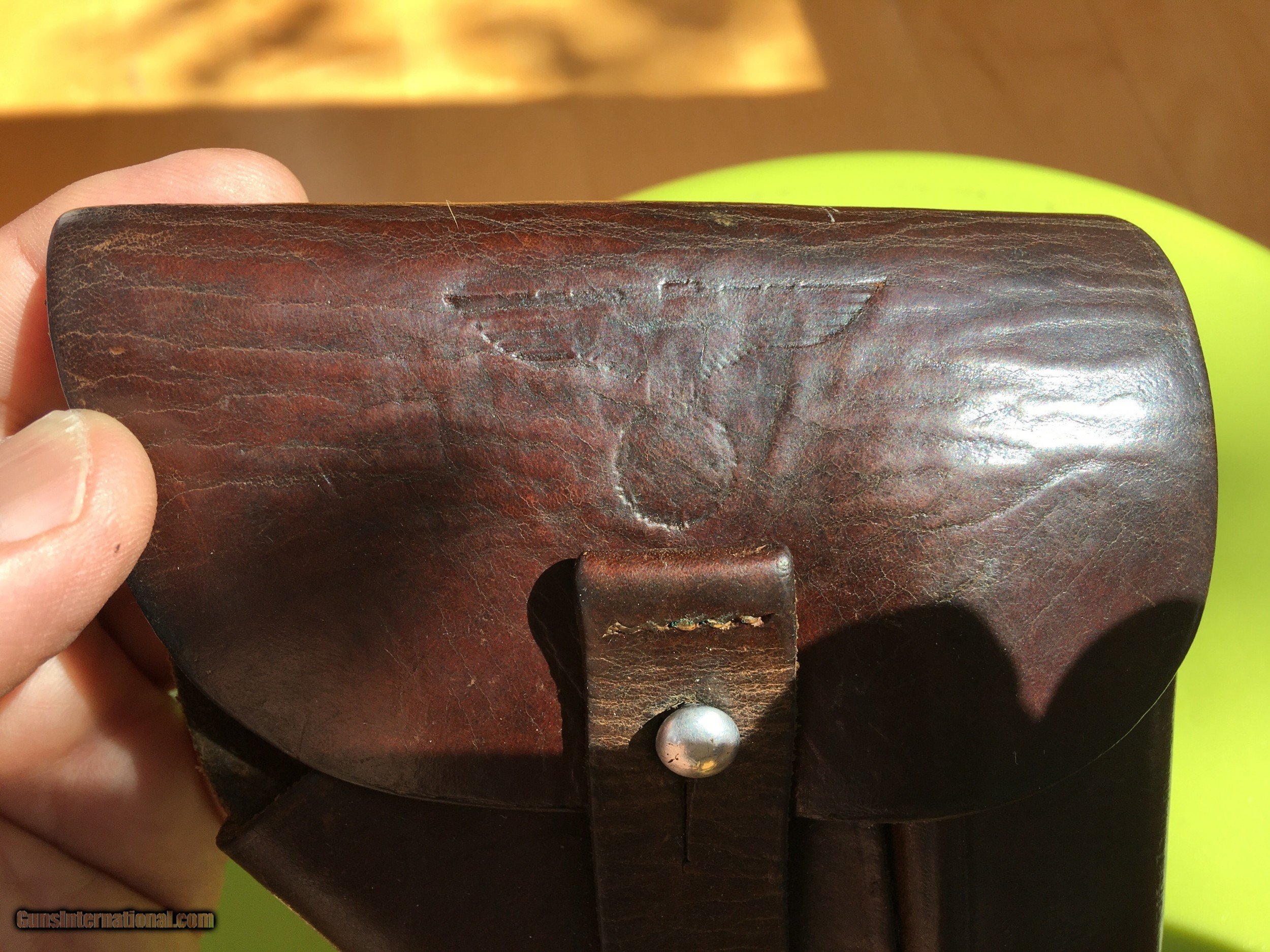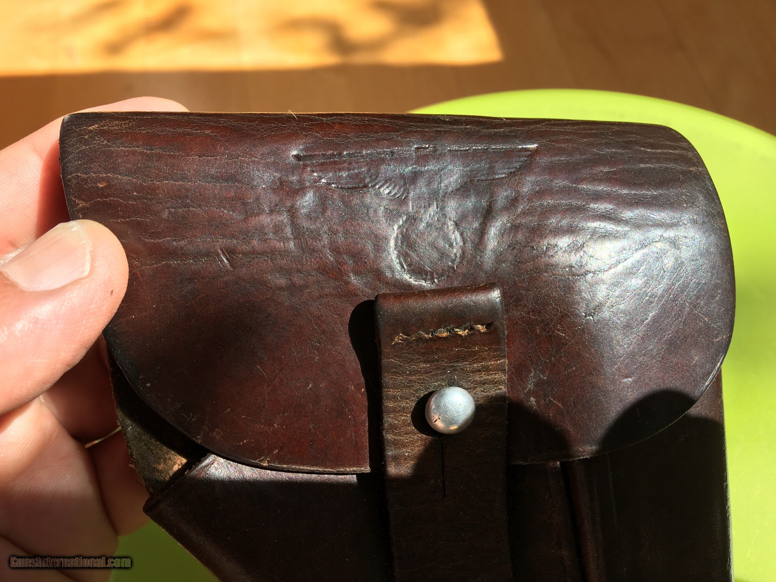 Description: SOLD! This is an all original example of a scarce Walther PPK party leader holster, made by AKAH before WWII. It is in excellent condition with a German Nazi eagle/swastika on the flap. There are no defects and the holster has excellent stitching and no damage to the leather. Leather is supple and shows some folds on the flap but no cracks or damage. This would be a perfect holster for a PPK with Party Leader grips or an RZM marking. Priced below retail. 3- day inspection. $25 shipping in Conus. SOLD |