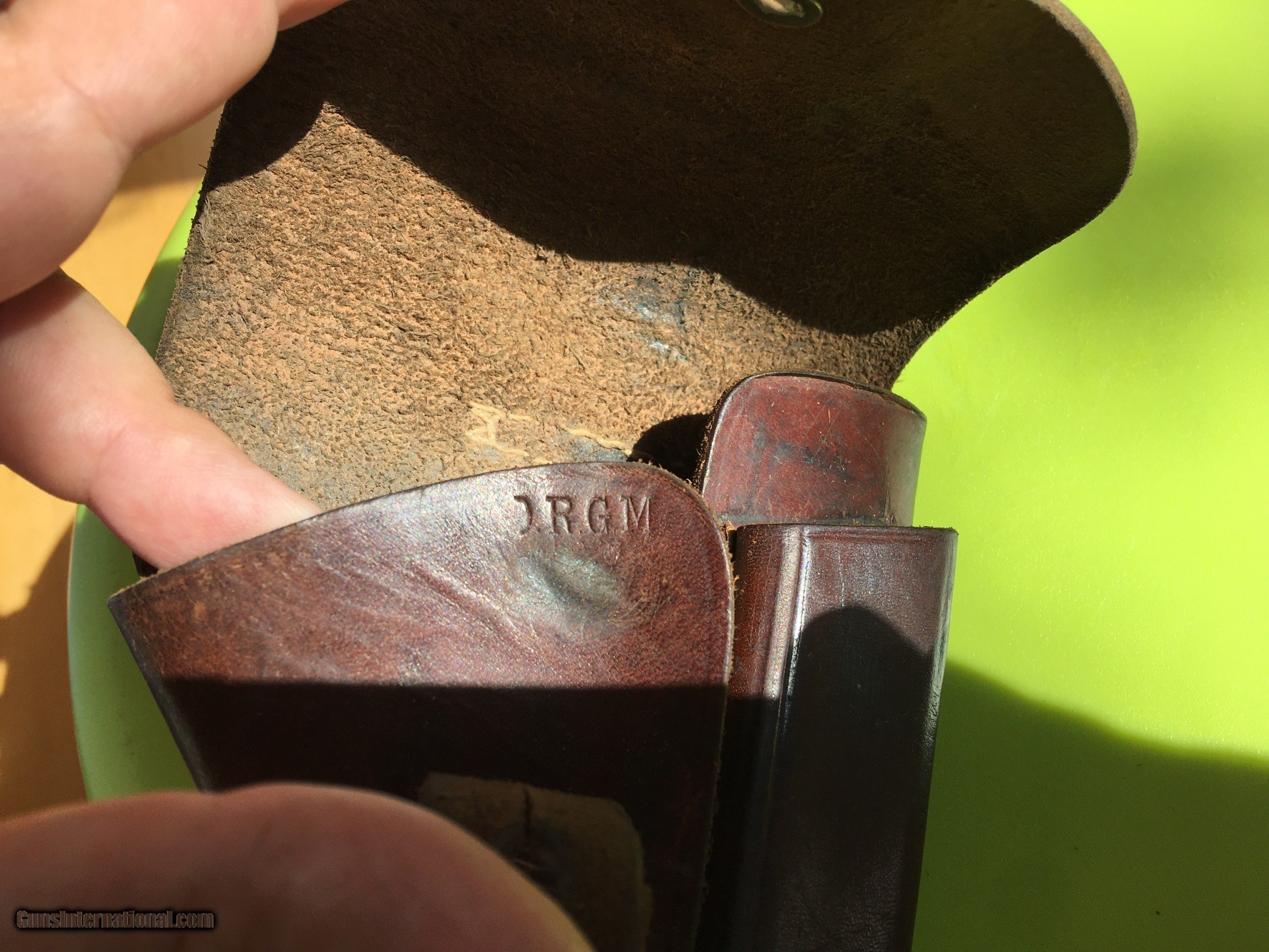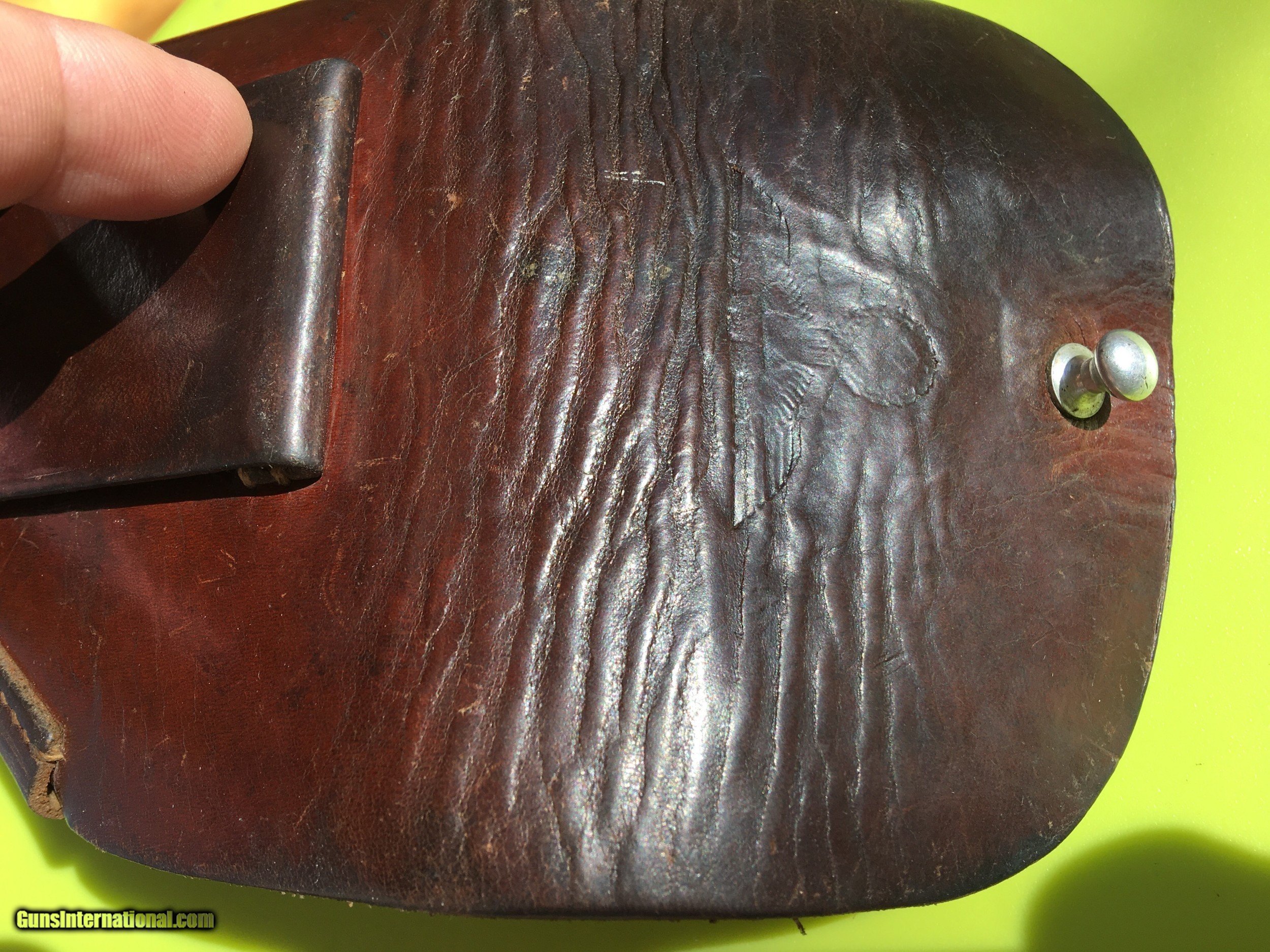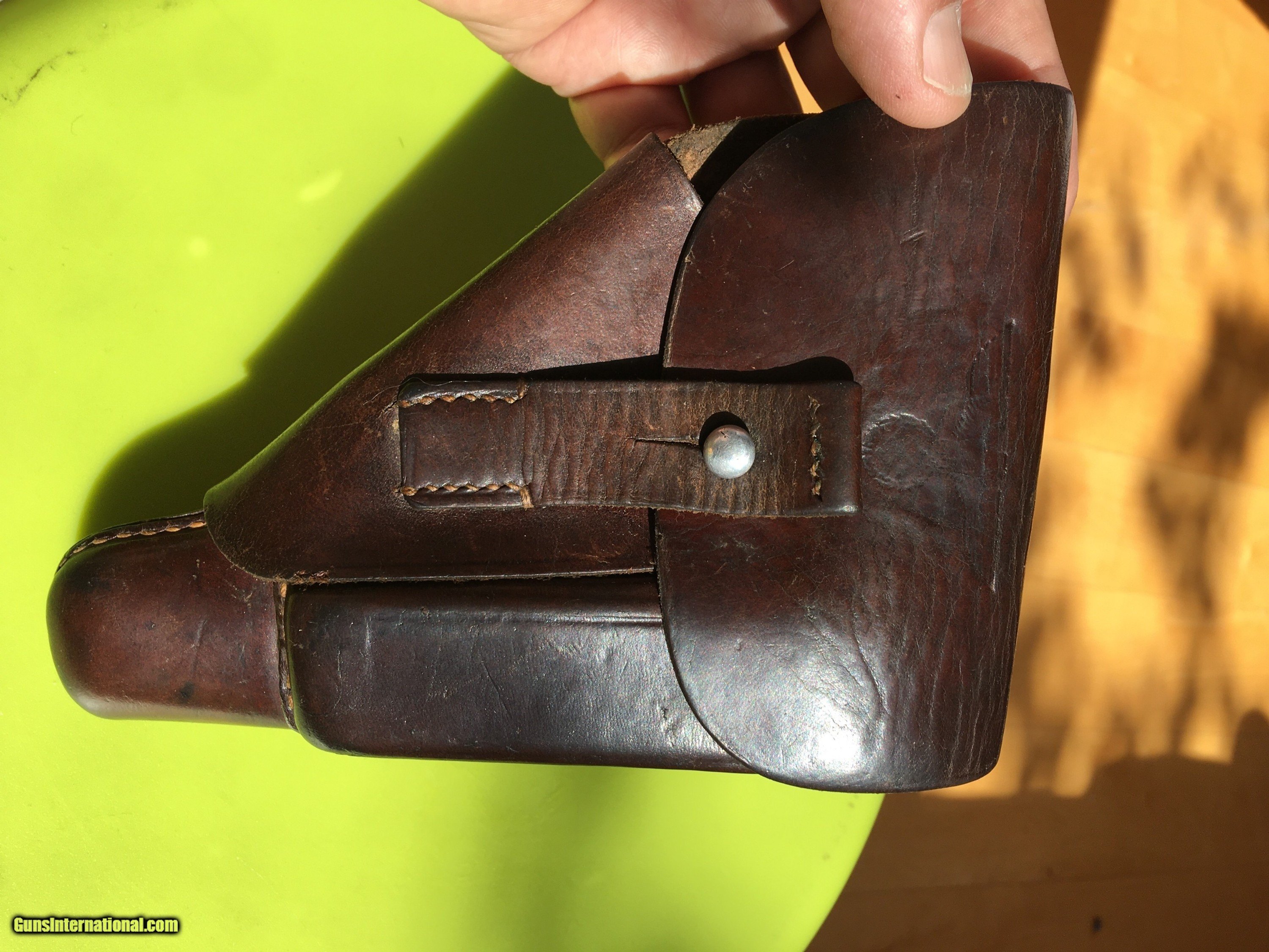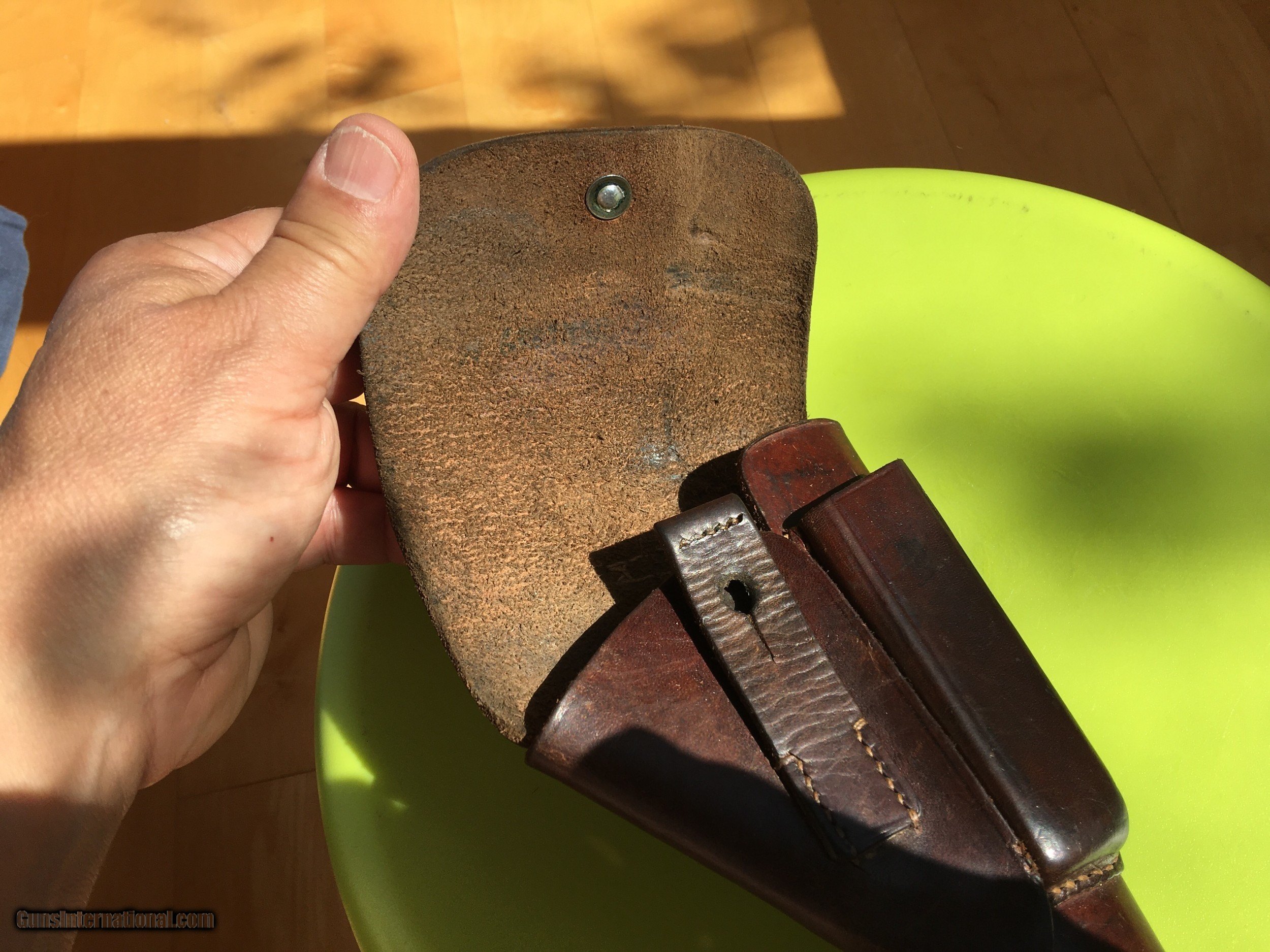 Description: SOLD! This is an all original example of a scarce Walther PPK party leader holster, made by AKAH before WWII. It is in excellent condition with a German Nazi eagle/swastika on the flap. There are no defects and the holster has excellent stitching and no damage to the leather. Leather is supple and shows some folds on the flap but no cracks or damage. This would be a perfect holster for a PPK with Party Leader grips or an RZM marking. Priced below retail. 3- day inspection. $25 shipping in Conus. SOLD |