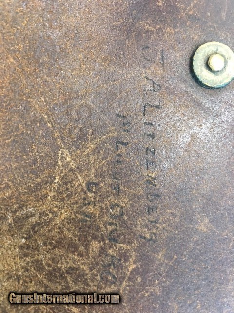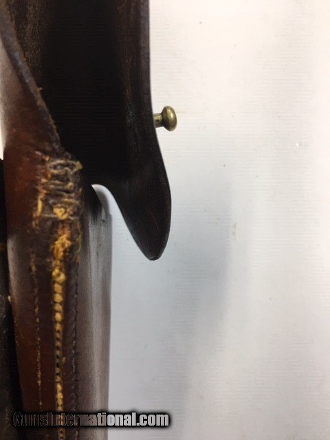 Description: Webley .455 Mark VI Holster. Overall condition good, shows contemporary stitching repair (see photo). The holster has inscribed on the inside of the flap "J.A. Litzenberg 1st Lieut Ord KC U.S.A.". . Using Ancestry, this could possibly be John A. Litezenberg, of Butler Pa. who passed in 1976. Had a daughter Betty Hamilton.. Very faint makers mark inscribed "T. Thompson 1917". SOLD |