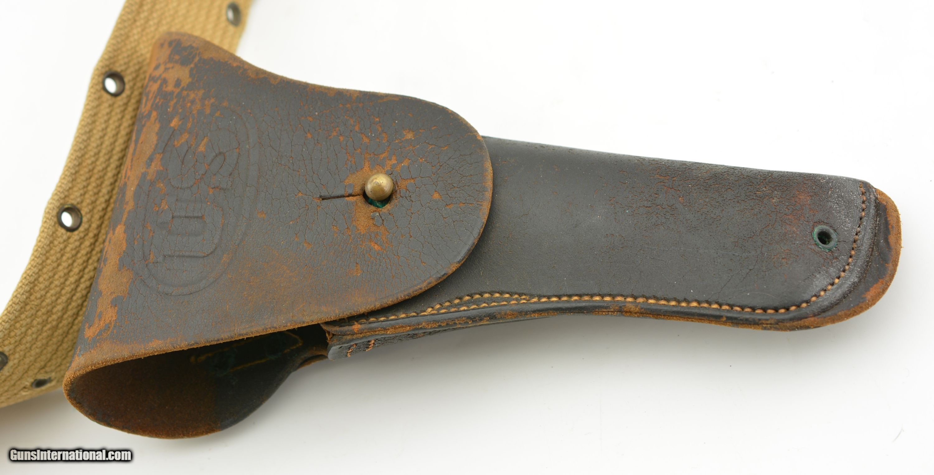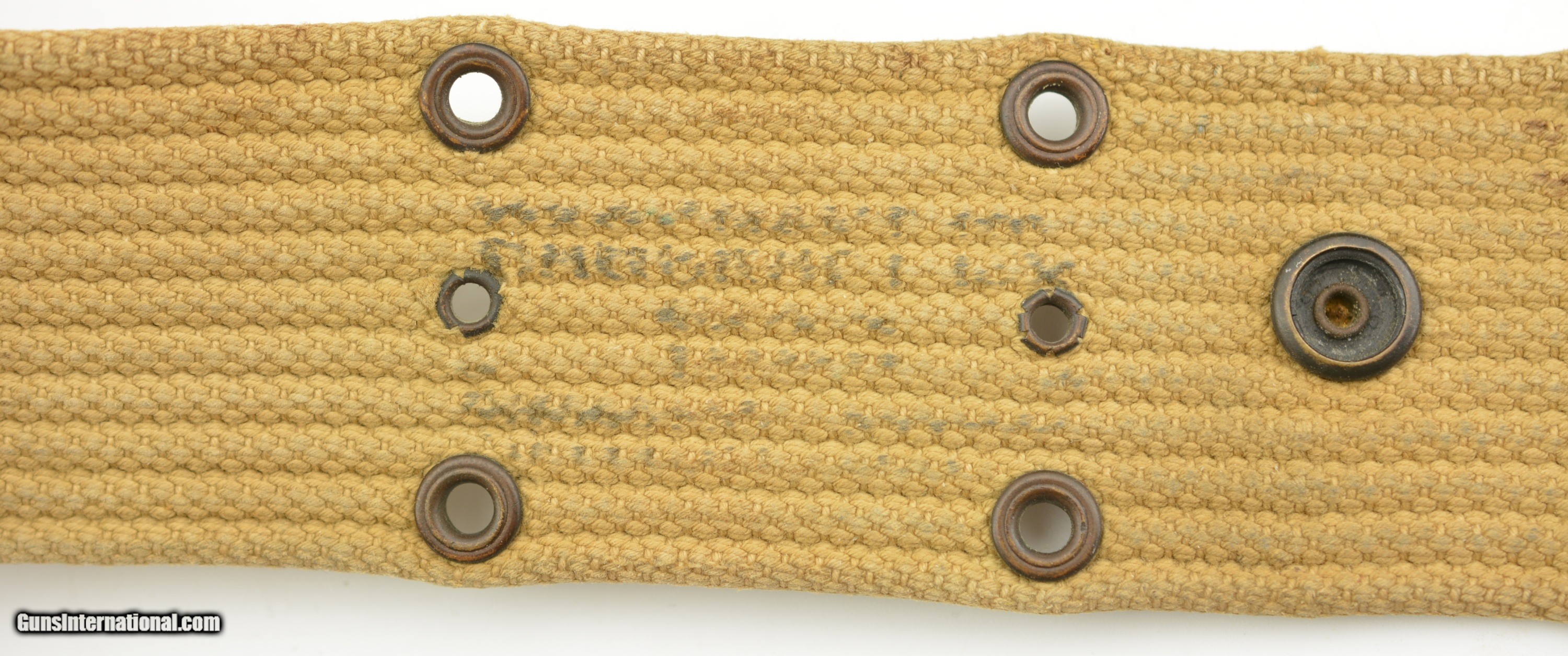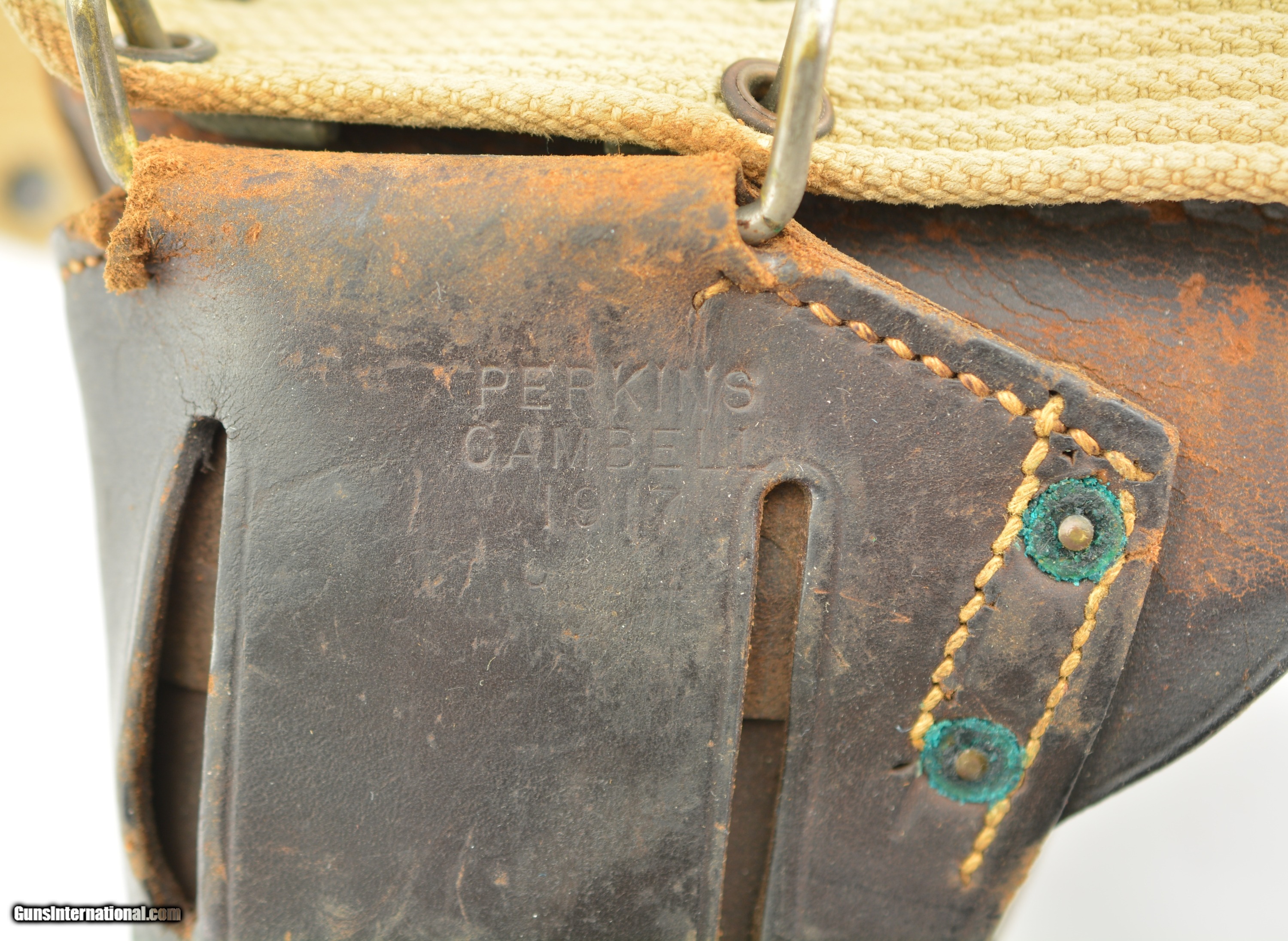 Description: This is a tan canvas belt with blackened bronze fittings and large stenciled "US" on the exterior. The belt is in fine shape with only a small amount of staining, and a few broken threads around one of the keeper grommets. The interior of the belt has a large, illegible inkstamp; possibly a maker's mark, or owner's name. Attached to the belt is a dark brown leather Model 1916 holster for the Model 1911 .45 caliber pistol. The holster has scuffs along the leading and trailing edges, as well as crazing and flaking along the flex points of the "US" embossed cover flap. The back of the holster is maker marked and dated: "PERKINS / CAMPBELL / 1917". This is a very good-fine piece of WW1 US militaria, and rates very good-fine overall. SOLD |