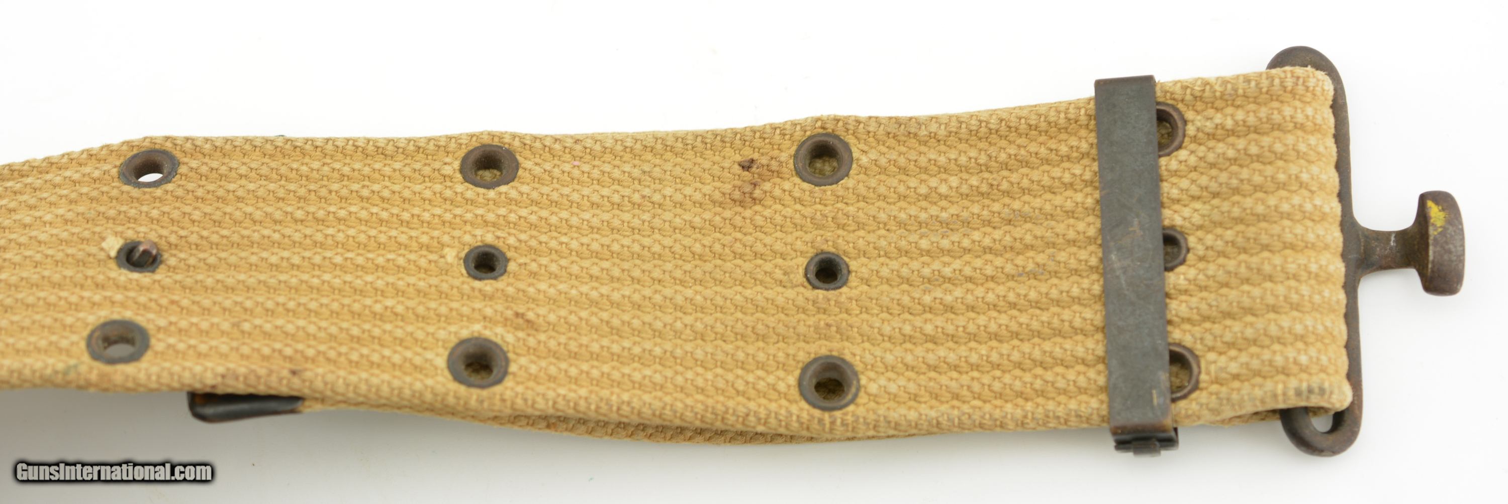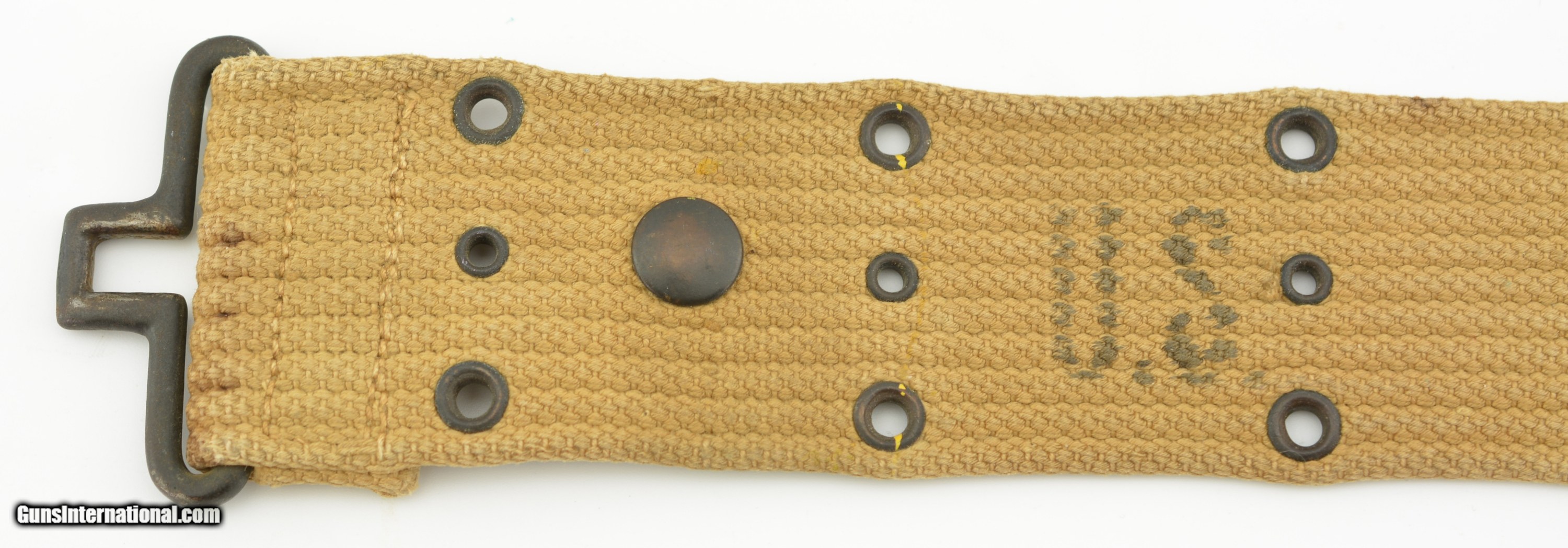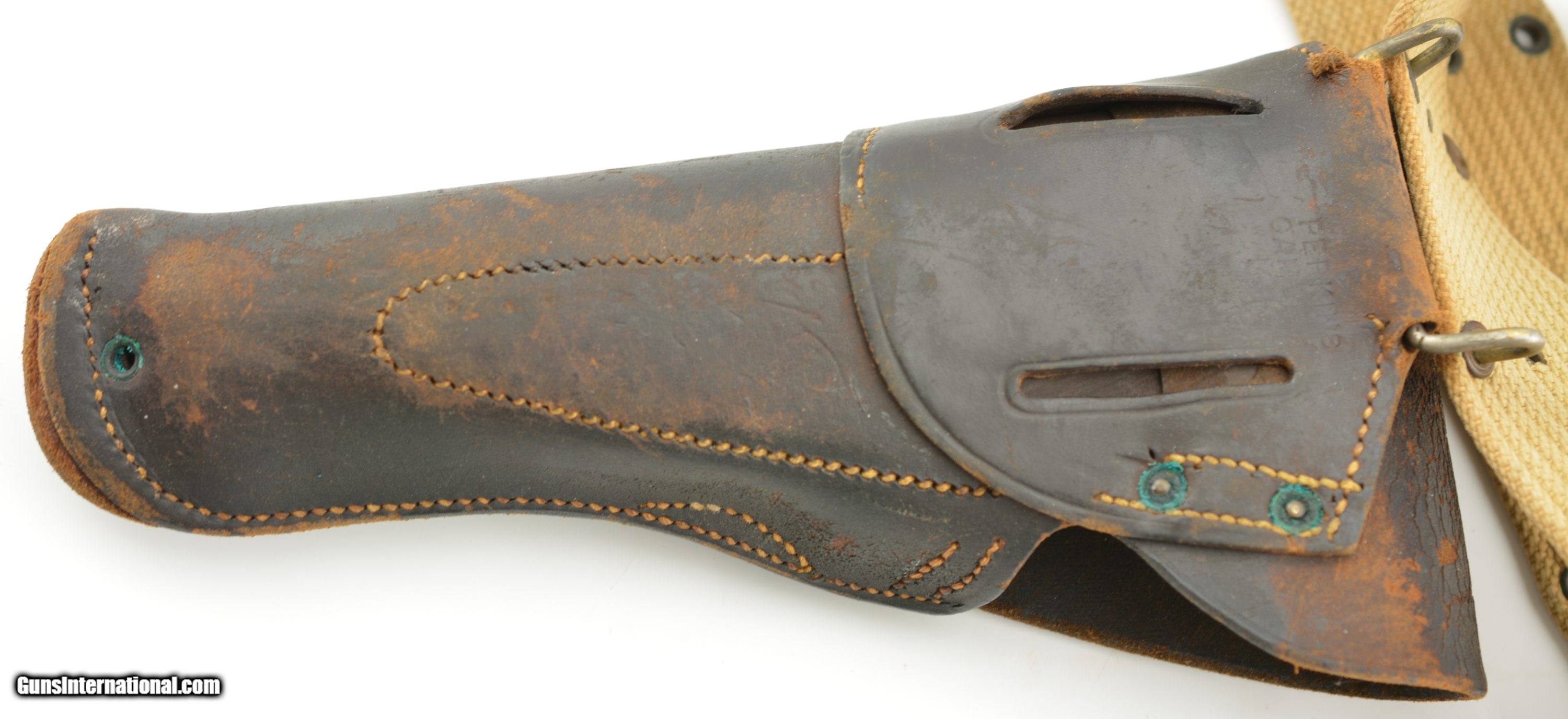 Description: This is a tan canvas belt with blackened bronze fittings and large stenciled "US" on the exterior. The belt is in fine shape with only a small amount of staining, and a few broken threads around one of the keeper grommets. The interior of the belt has a large, illegible inkstamp; possibly a maker's mark, or owner's name. Attached to the belt is a dark brown leather Model 1916 holster for the Model 1911 .45 caliber pistol. The holster has scuffs along the leading and trailing edges, as well as crazing and flaking along the flex points of the "US" embossed cover flap. The back of the holster is maker marked and dated: "PERKINS / CAMPBELL / 1917". This is a very good-fine piece of WW1 US militaria, and rates very good-fine overall. SOLD |