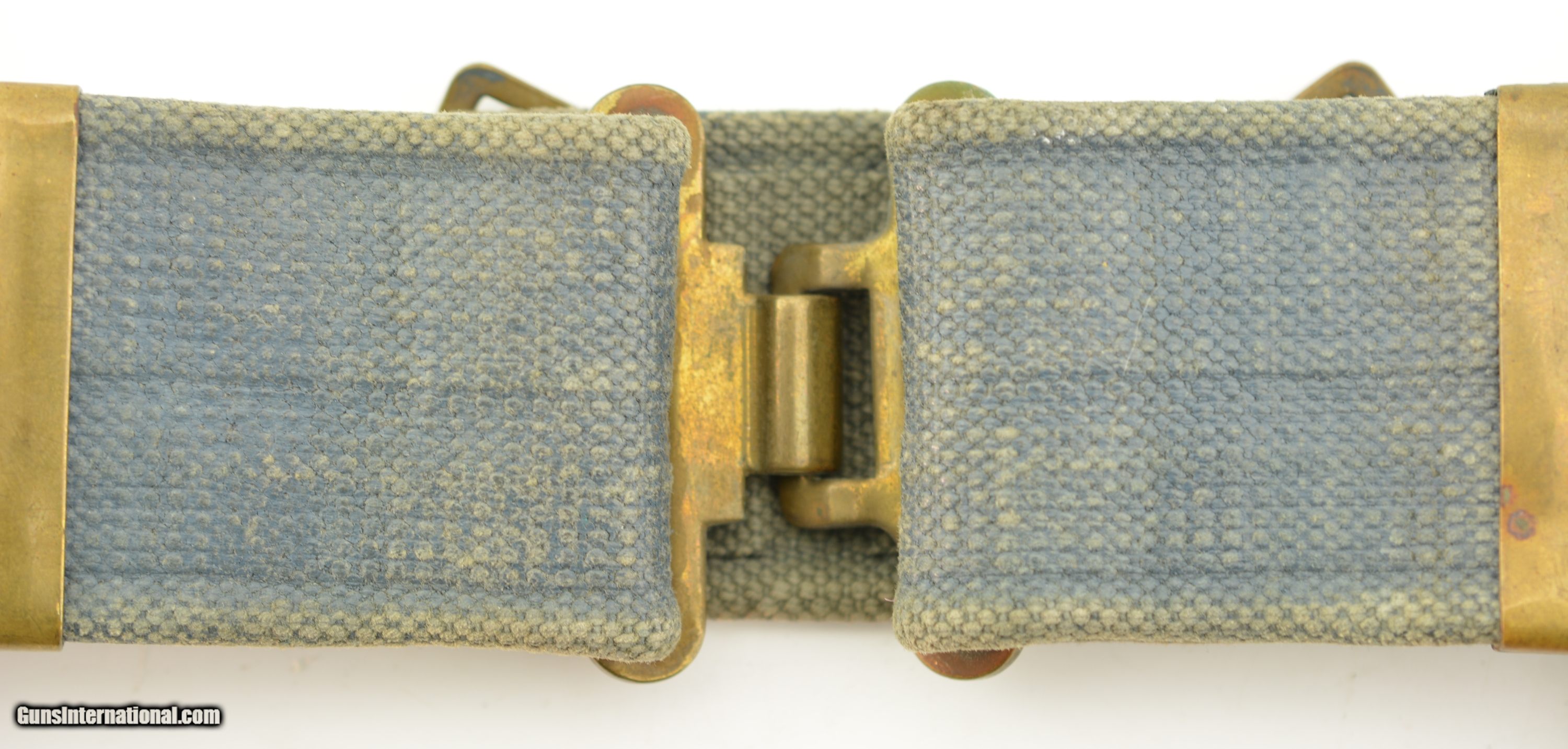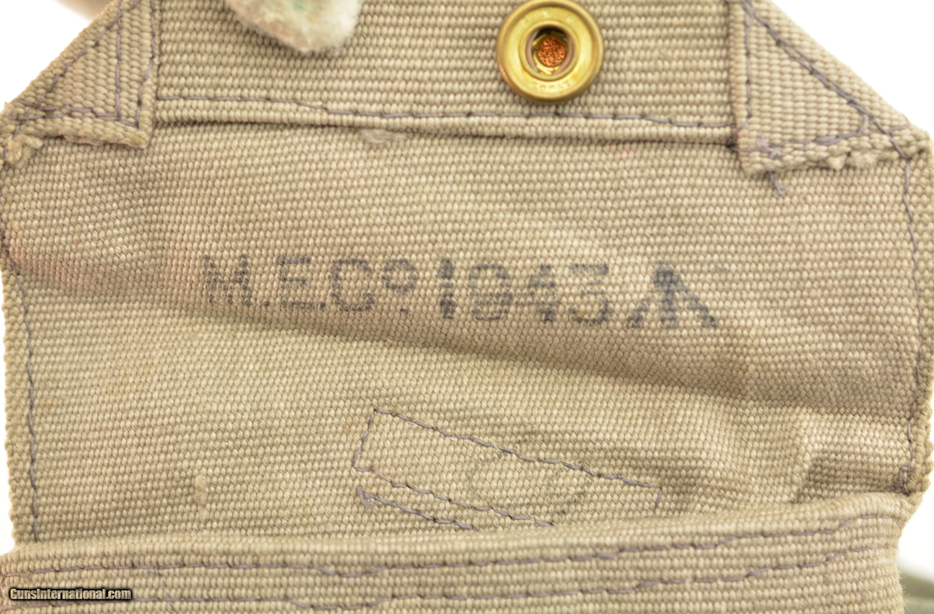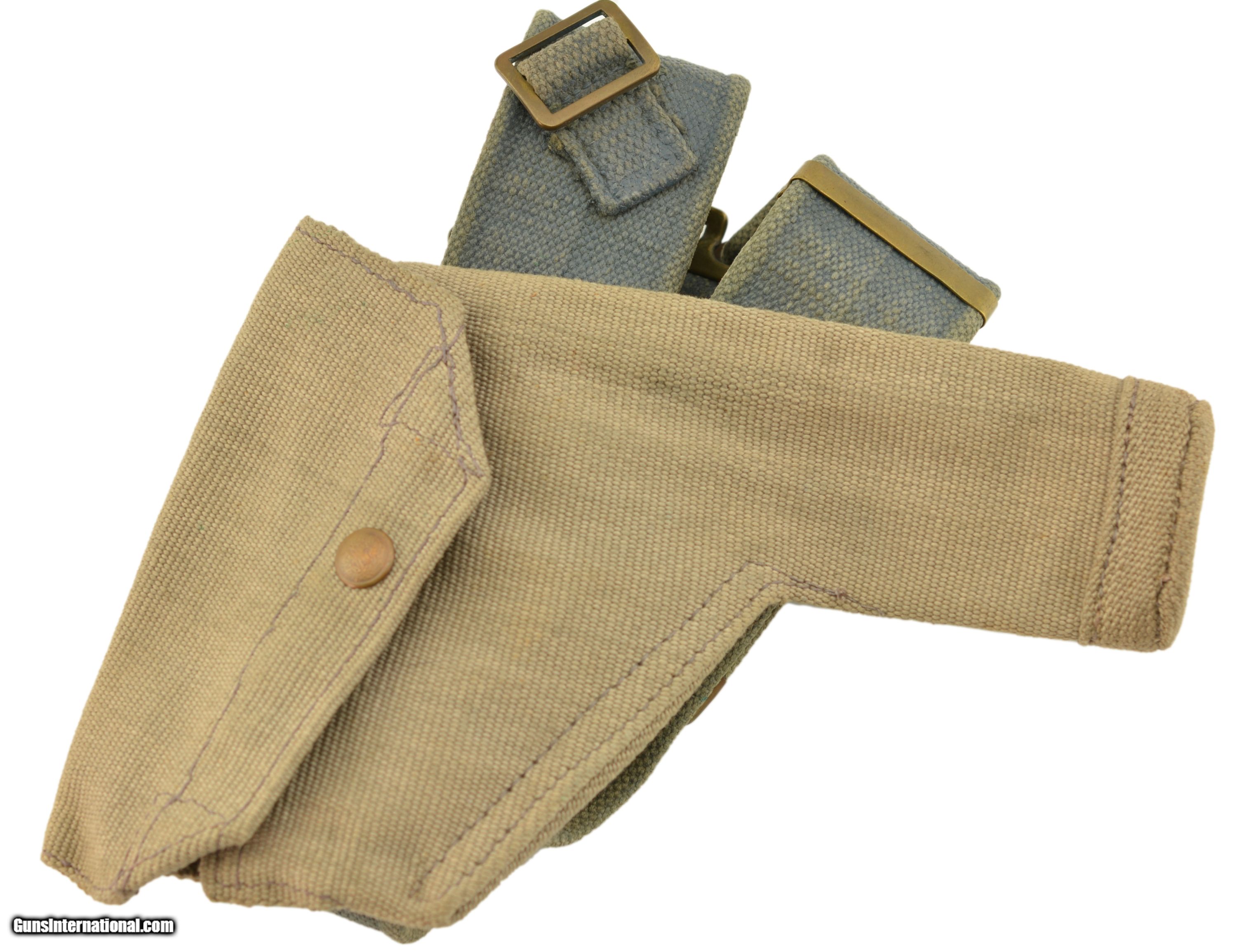 Description: This is an original 1943 British Webley Canvas Holster marked M. E. Co. 1943 with the broad head and arrow. The canvas is a slight grayish tan with a blue gray colored canvas belt with a large concentration of markings, both are in excellent original condition. Make a very nice combination for use or display. SOLD Manufacturer: British Model: Holster |